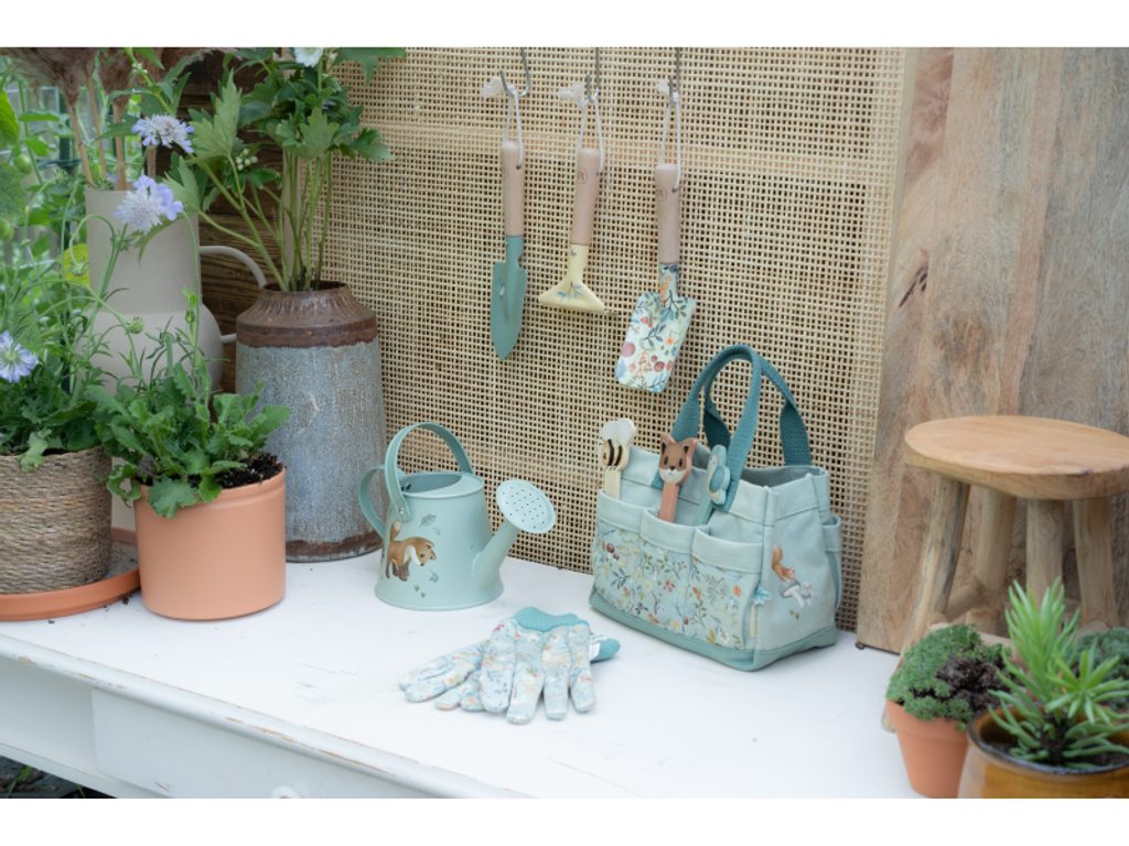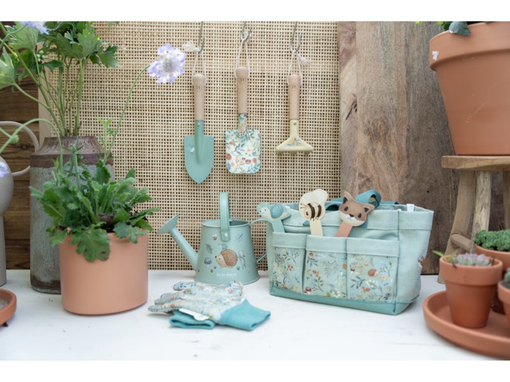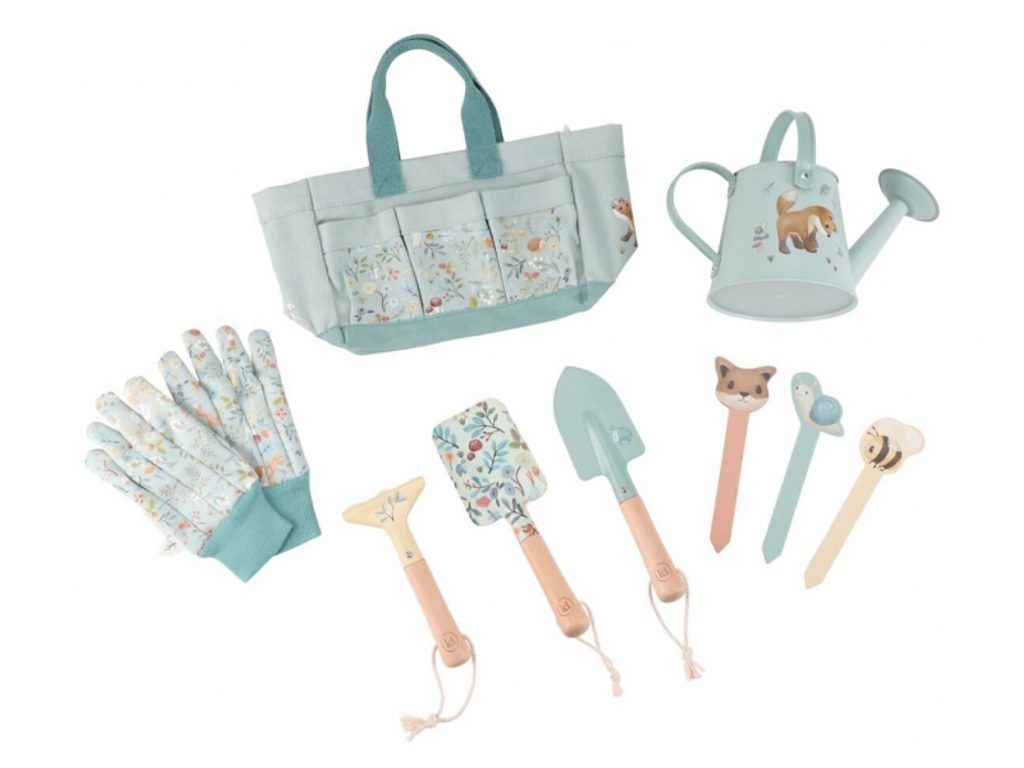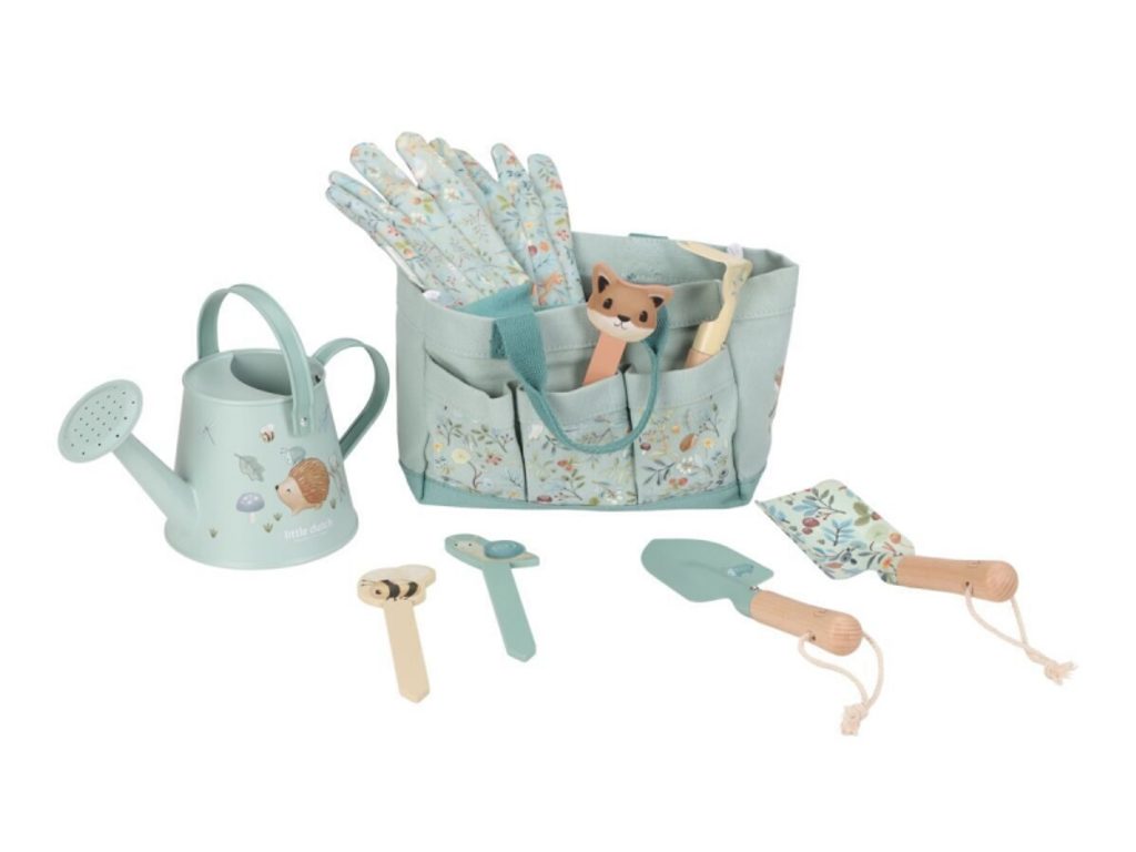 Tato 10dílná sada nářadí v krásném designu obsahuje vše, co malá zahradnice nebo zahradník potřebují: konvičku na zalévání, zahradnické rukavice, dvě lopatky, hrabičky vyrobené z odolného kovu s dřevěnou rukojetí a tři dřevěné zapichovací jmenovky. Vše je pečlivě uloženo v praktické tašce z bavlněného plátna, která má spoustu kapes pro snadné uložení a přenos. Nářadí i taška jsou zdobeny krásnými motivy ze života v lese. Tato sada je součástí designové kolekce hraček a doplňků Little Dutch Forest Friends, inspirované přírodou.