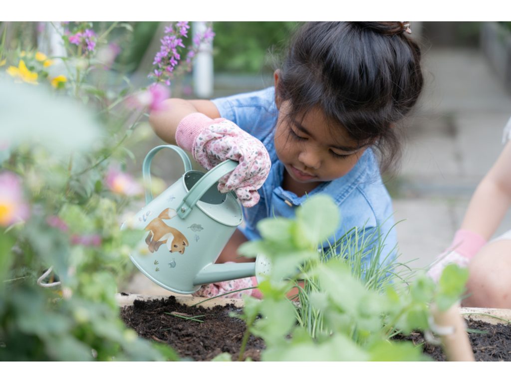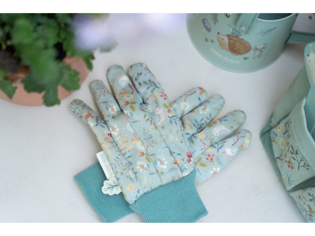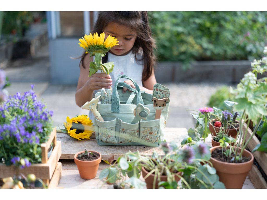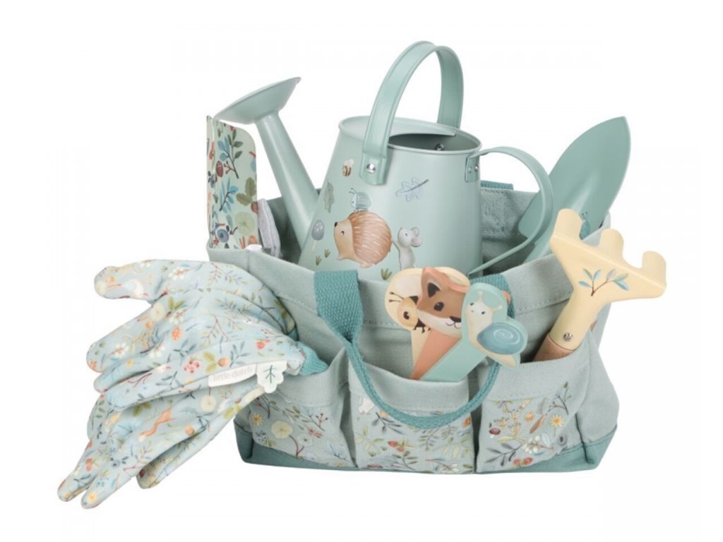 Tato 10dílná sada nářadí v krásném designu obsahuje vše, co malá zahradnice nebo zahradník potřebují: konvičku na zalévání, zahradnické rukavice, dvě lopatky, hrabičky vyrobené z odolného kovu s dřevěnou rukojetí a tři dřevěné zapichovací jmenovky. Vše je pečlivě uloženo v praktické tašce z bavlněného plátna, která má spoustu kapes pro snadné uložení a přenos. Nářadí i taška jsou zdobeny krásnými motivy ze života v lese. Tato sada je součástí designové kolekce hraček a doplňků Little Dutch Forest Friends, inspirované přírodou.