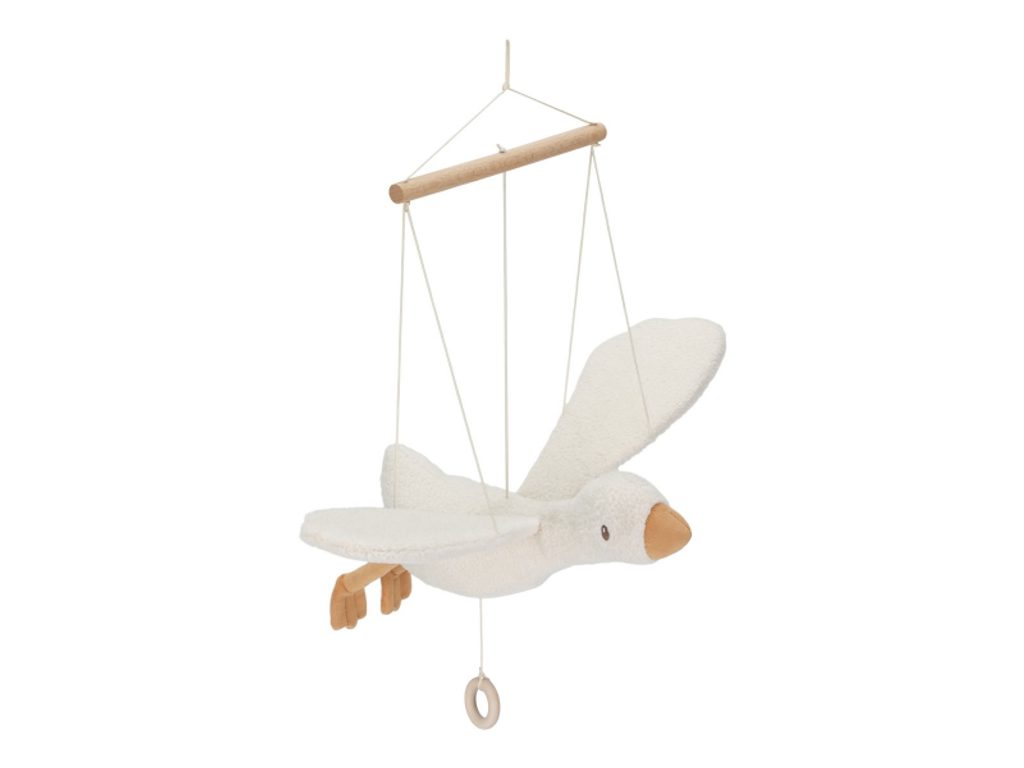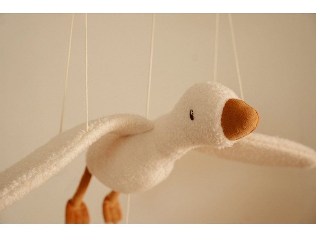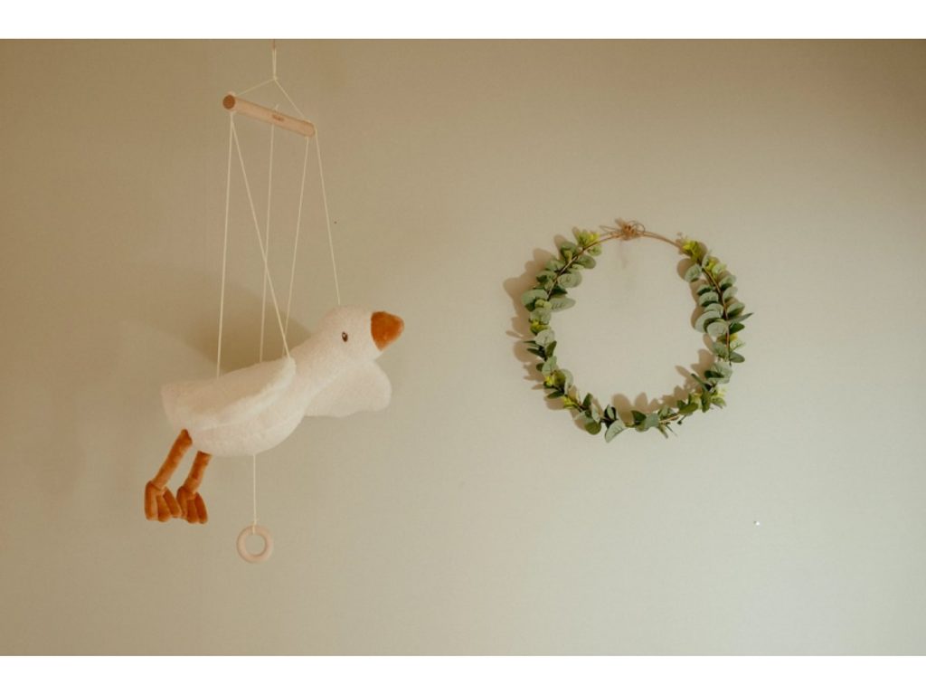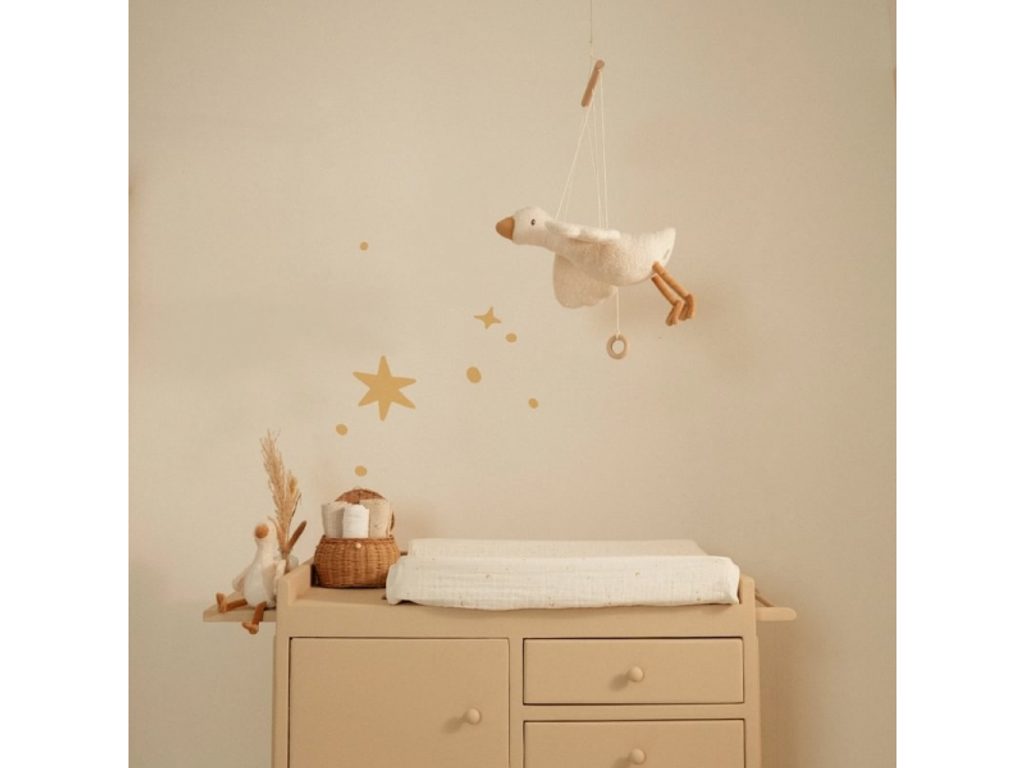 Lehká a elegantní dekorace v podobě roztomilé letící husy dodá dětskému pokojíčku nádech klidu a kouzla. Husa působí, jako by se vznášela ve vzduchu a vytváří tak snovou atmosféru nad postýlkou či v hracím koutku. Vzdušný design plný fantazie: Elegantní husa s měkkým textilním tělem se jemně pohupuje ve vzduchu Podporuje klidné usínání a rozvíjí dětskou představivost Ideální jako dekorace nad postýlku – bez zvuku, jen pro jemný vizuální dojem Tlumené barvy a přírodní materiály zapadnou do moderního i klasického dětského pokoje Vhodné od narození jako závěsná dekorace mimo dosah dítěte Létající husa je součástí designové kolekce hraček a doplňků Little Dutch Newborn Naturals. Rozměry: 39 × 30 × 11 cm Materiál: 100 % polyester, dřevěný závěs Tělo husy je možné po oddělení od závěsu ručně prát (max. 30°C). Vhodné od narození jako závěsná dekorace mimo dosah dítěte.