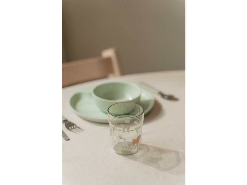 6-dílná jídelní sada v krásném designu s jemným potiskem obsahuje dětský talíř, misku, kelímek, lžíci, vidličku a nůž. Dětský talíř je vhodný pro samostatné stolování dítěte, díky praktickému úchytu se snadno přenáší. Miska je ideální pro servírování dětským zeleninových či ovocných příkrmů, polévek, kaší, ovoce apod. Talíř i miska jsou vyrobeny z lehkého, mimořádně odolného plastu. Kelímek z průhledného, odolného plastu je ideální pro děti, které se učí pít ze skleničky. Příbor z kvalitní nerezové oceli s plastovou rukojetí pro snadné držení usnadní dítěti přechod z krmení lžičkou na stolování s příborem. Sada je součástí designové kolekce hraček a doplňků pro děti Little Dutch Farma. Rozměry talíře: průměr 22 cm, výška 2 cm Miska: objem 300 ml Kelímek: objem 250 ml Rozměry příboru: vidlička / lžíce 14,5 cm, nůž 16,5 cm Všechny součásti sady je možné mýt v myčce. Zdravotně nezávadný materiál neobsahuje melamin ani BPA. Vhodné pro děti od 12 měsíců.