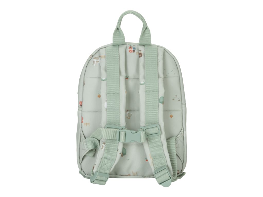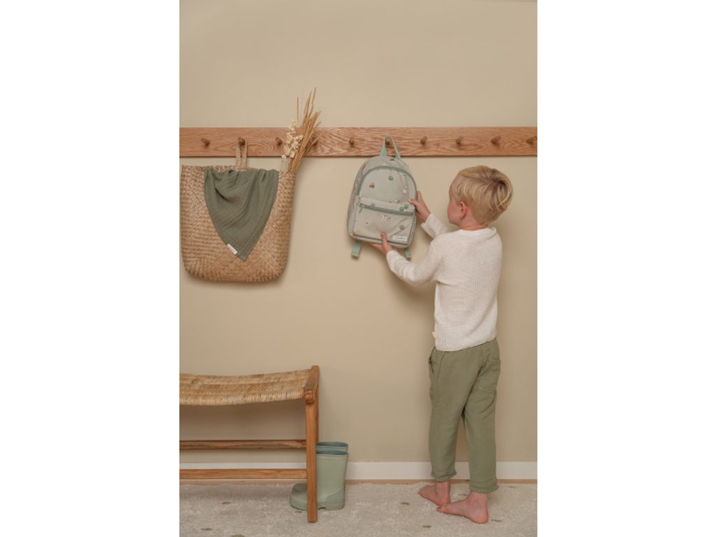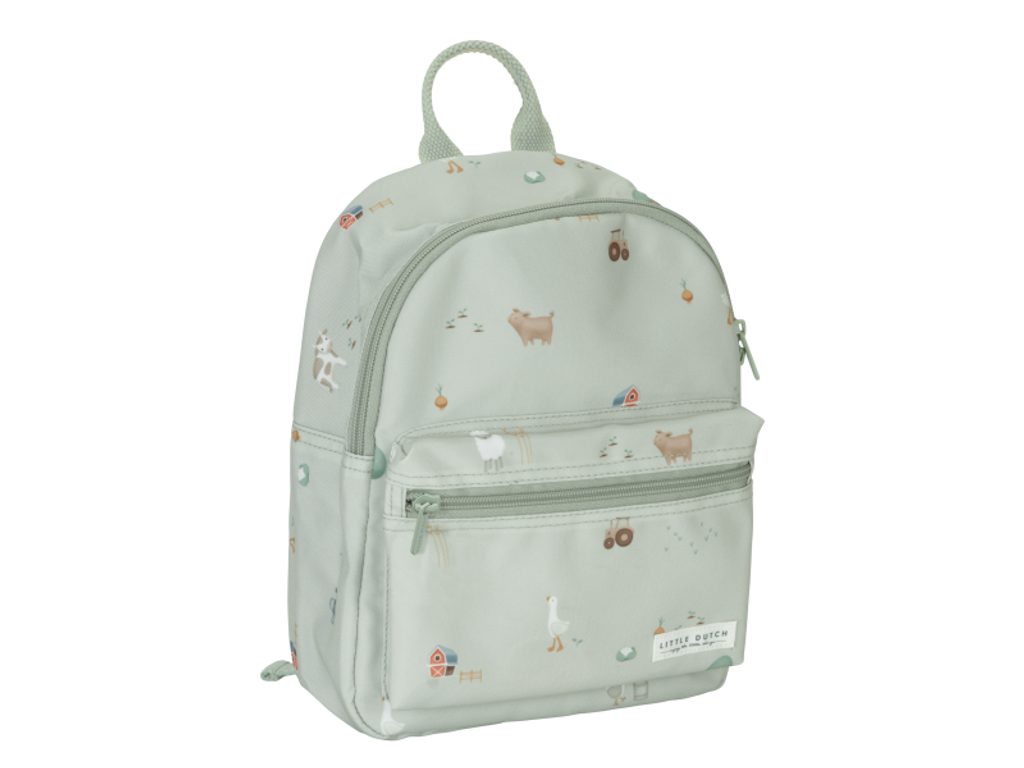 Roztomilý dětský batůžek potištěný obrázky zvířátek z farmy je ideálním doplňkem na výlety do přírody i procházky městem. Batůžek má nastavitelné ramenní popruhy a hrudní pás pro příjemné nošení. Držadlo umožňuje přenášení v ruce. Batůžek je vybaven vnější kapsou na zip pro uložení drobností a vnitřní prostor s kapsou, elastickým držákem na pití a jmenovkou. Batůžek je součástí designové kolekce hraček a doplňků pro děti Little Dutch Farma. Je výjimečný i tím, že jeho výroba je šetrná k naší planetě díky použití až 10 recyklovaných plastových lahví. Rozměry: 12 x 22,5 x 29 cm