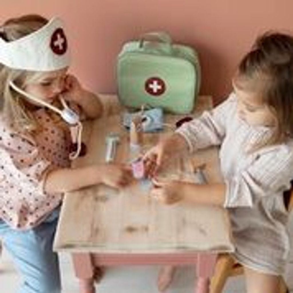 Pacienti vašeho malého lékaře či lékařky se budou cítit mnohem lépe, když bude mít po ruce tuto lékařskou brašnu. Obsah brašny umožňuje změřit teplotu, zkontrolovat tep a krevní tlak a poslechnout si pacienta s pomocí stetoskopu. Sada obsahuje plátěnou lékařskou brašnu, náplast (4 různé barvy), dřevěný teploměr, stříkačku, tubu s mastí, stetoskop, reflexní kladivo, měřič krevního tlaku, otoskop, čepičku. Balení: 9,4 x 23 x 19 cm Vhodné pro děti od 3 let.