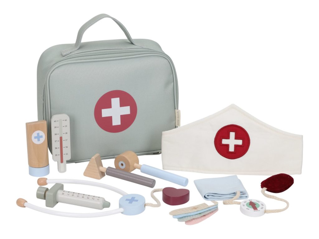 Paní doktorko, pane doktore – mohl/a byste se na mě podívat? S touto krásnou dřevěnou doktorskou sadou bude vaše dítě připravené postarat se o každého pacienta. Textilní lékařská taška ukrývá veškeré základní vybavení: teploměr, injekci, obvazy, stetoskop, tlakoměr a dokonce i doktorskou čepici. Hra na lékaře podporuje rozvoj empatie, fantazie a pomáhá dětem lépe porozumět tomu, co se děje při skutečné návštěvě ordinace. Ideální hračka pro všechny malé ošetřovatele a lékaře. Dřevěné části jsou vyrobené z odolného FSC certifikovaného dřeva. Vhodné pro děti od 3 let.