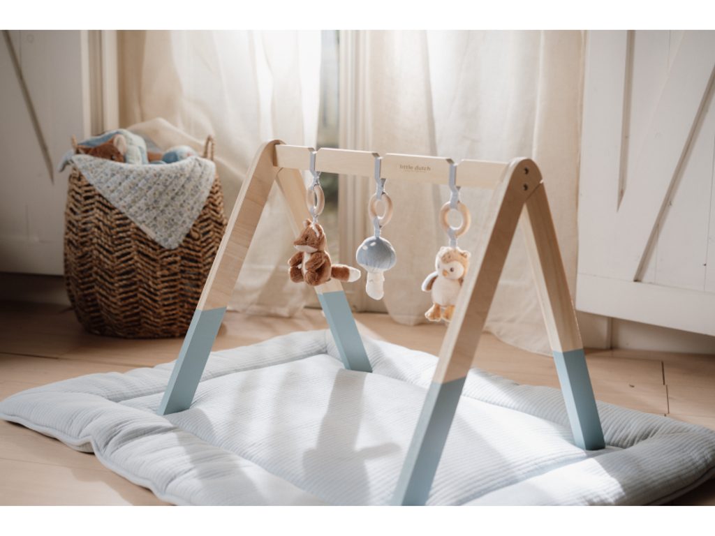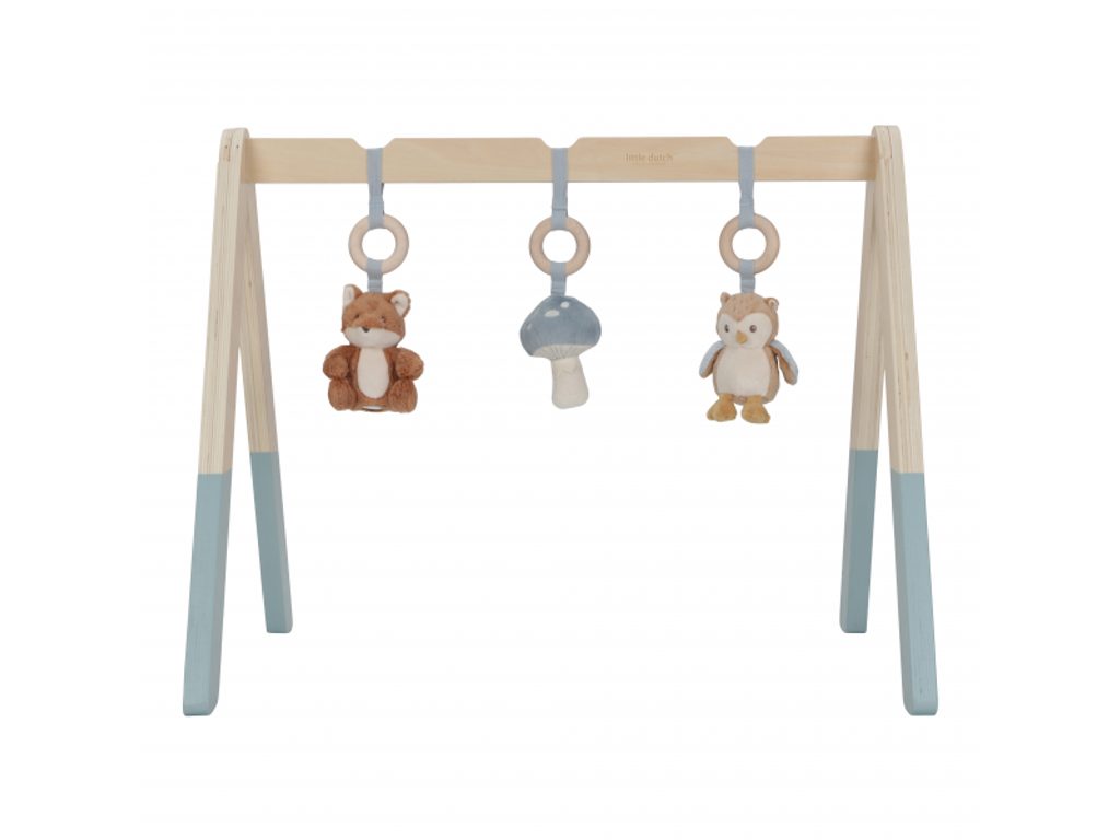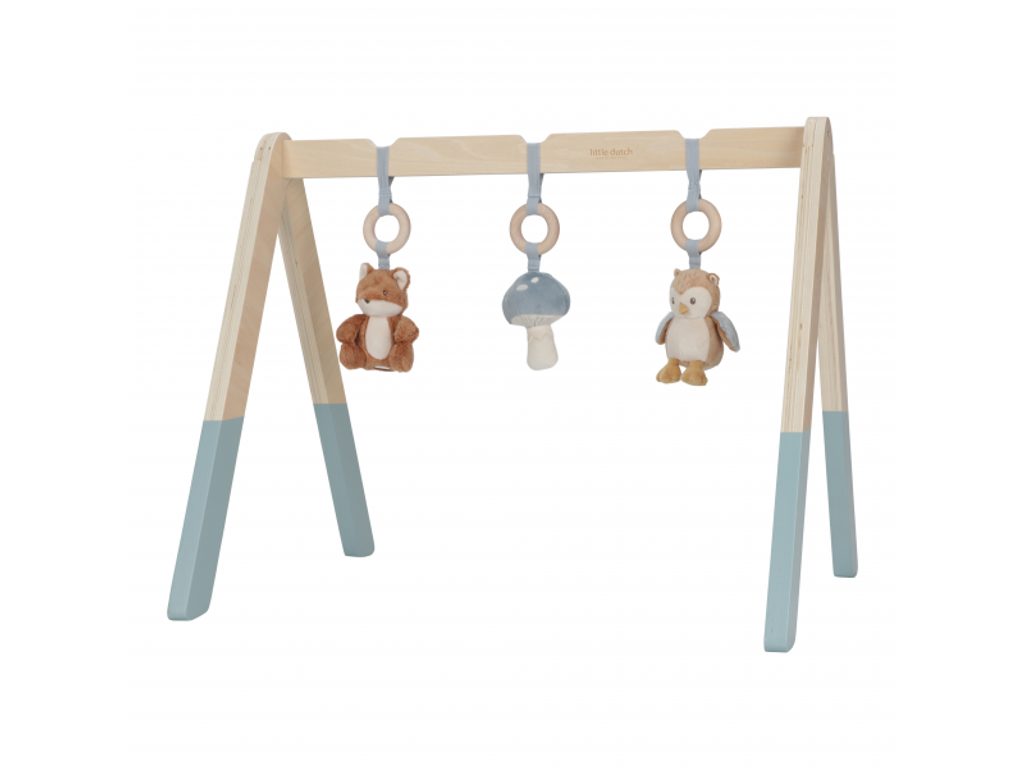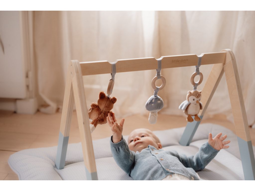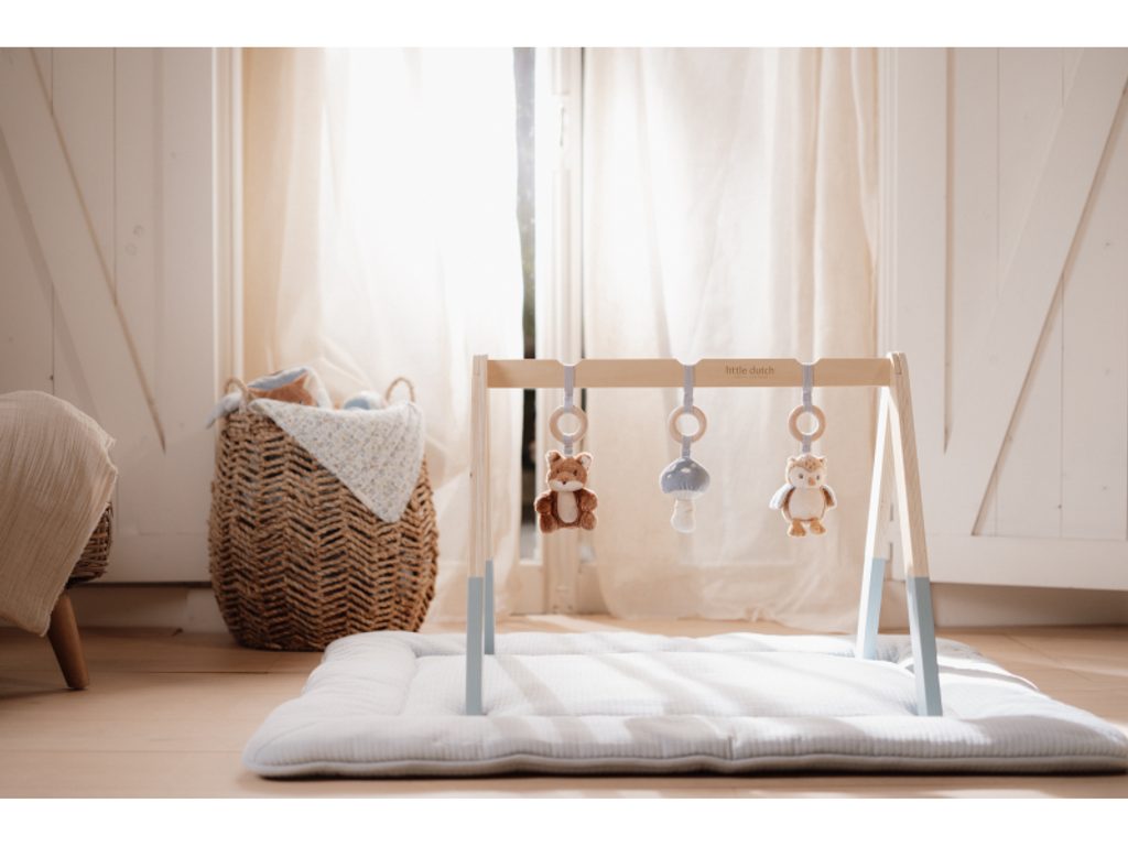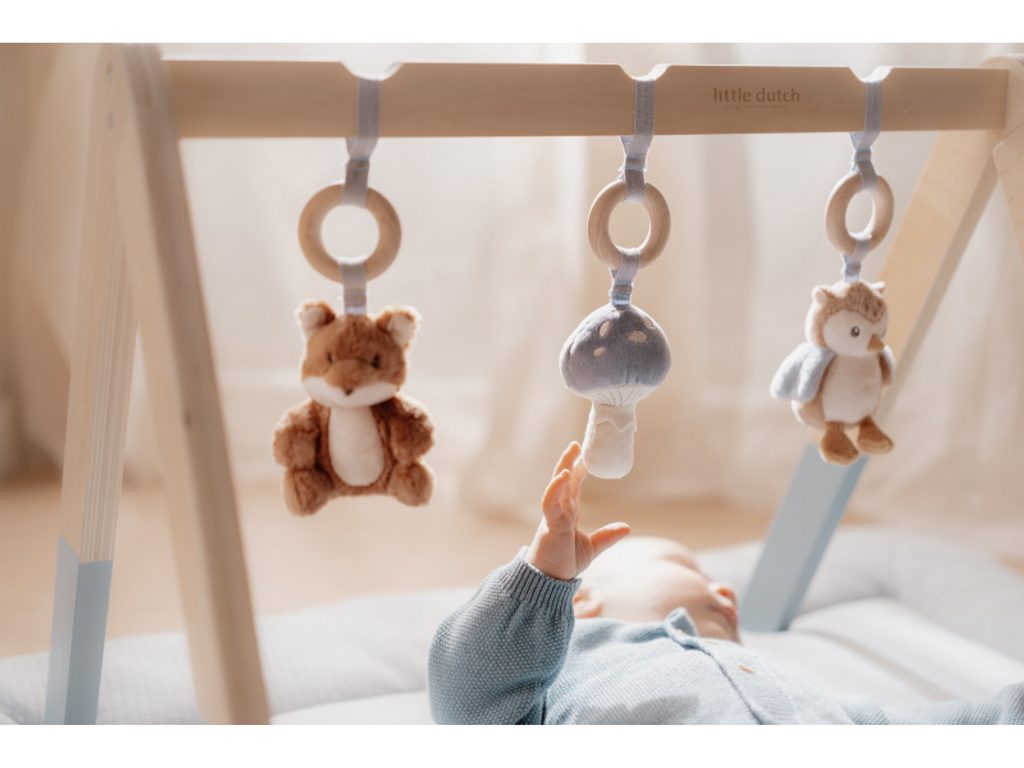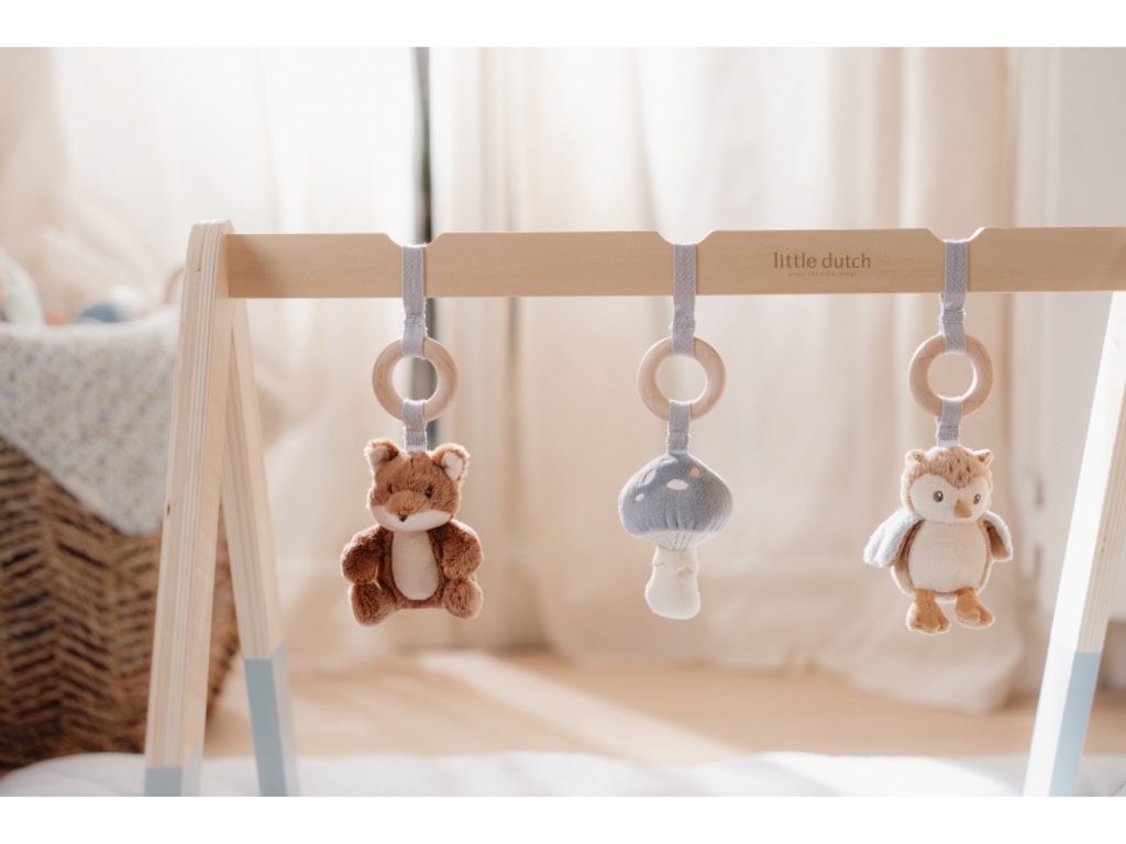 Stylová dřevěná hrazdička s třemi zavěšenými plyšovými hračkami v podobě lišky, sovy a houbičky poskytne vašemu miminku spoustu zábavy při hraní na dece. Každá hračka láká dítě ke zkoumání a dotýkání, při pohybu vydává zvuky chrastění a šustění. Odnímatelné hračky lze použít i samostatně pro další zábavu.