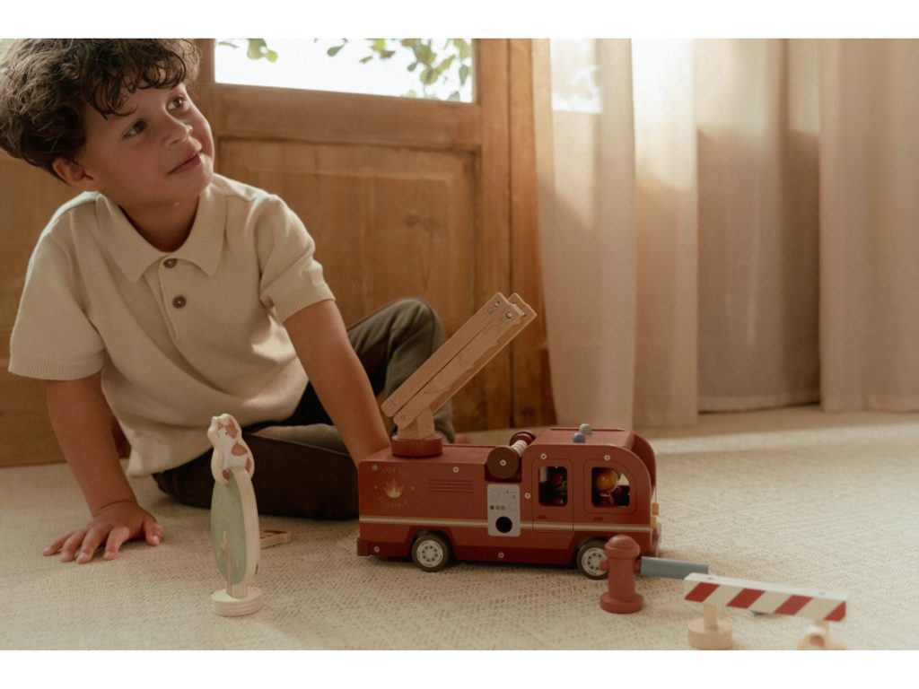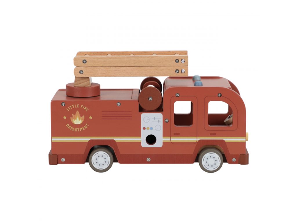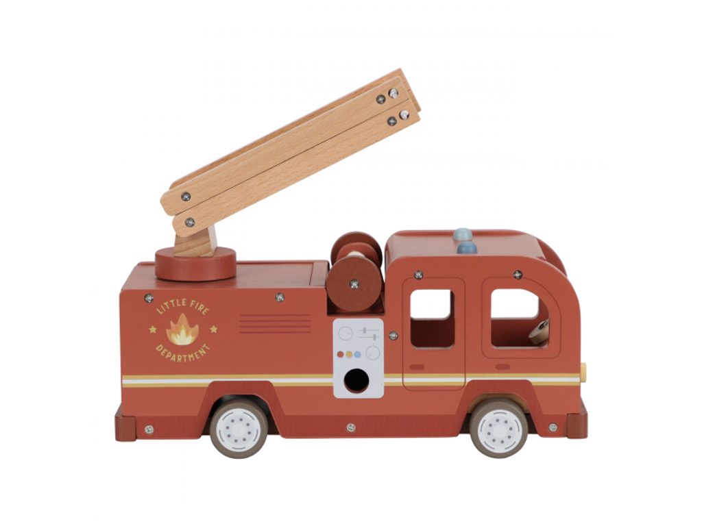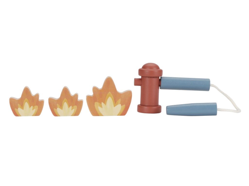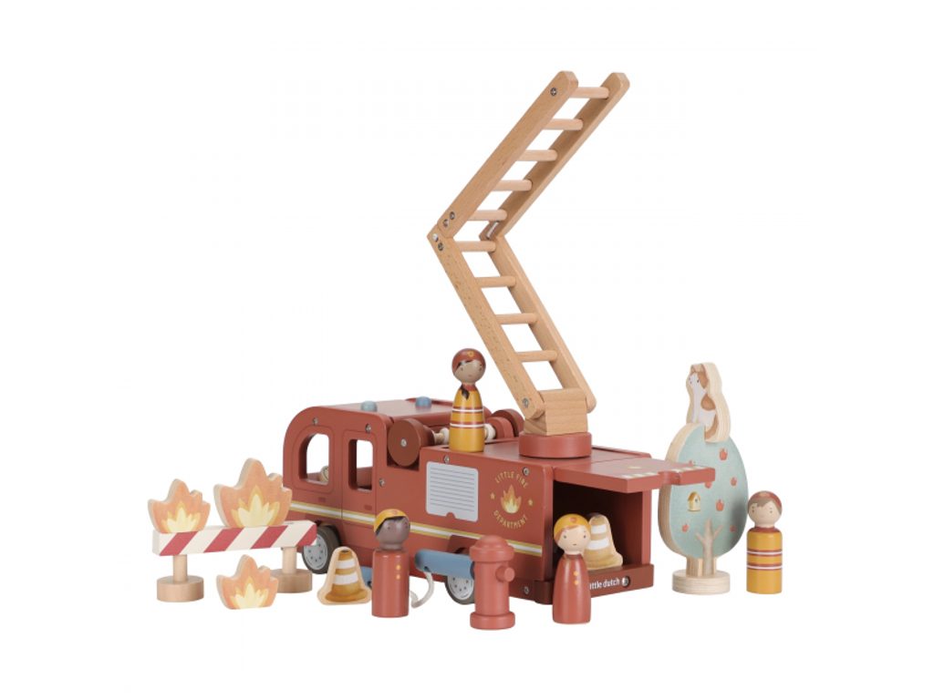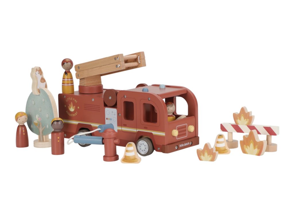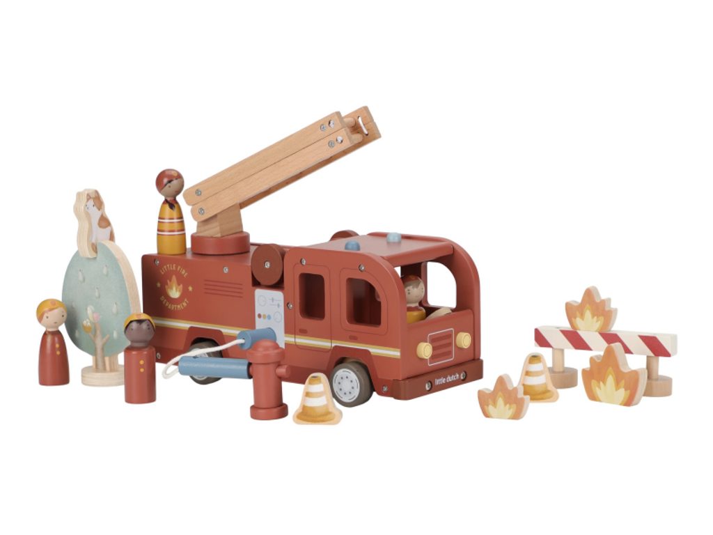 Hasičský náklaďák se čtyřmi hasiči je připraven vyrazit do akce! Někdy je potřeba zachránit kočičku ze stronu, jindy uhasit požár nebo pomoci policii při dopravní nehodě. Pro všechny tyto situace je náklaďák vybaven výsuvným žebříkem a odnímatelnou hadicí, kterou lze připojit k hydrantu nebo přímo k vozu. Sadu tvoří hasičský náklaďák, čtyři figurky hasičů, plameny, hydrant, strom s kočičkou a zábrana – vše, co je potřebné pro napínavou záchrannou misi. Robustní provedení, pohyblivé části a důraz na detail podporují rozvoj motoriky, fantazie a schopnosti vyprávět příběhy. Hračka je součástí kolekce vysoce kvalitních dřevěných hraček Little Dutch, navržených s důrazem na bezpečnost a originální design. Vyrobeno z odolného FSC certifikovaného dřeva. Rozměry: 28 × 17 × 11,5 cm Vhodné pro děti od 2 let.