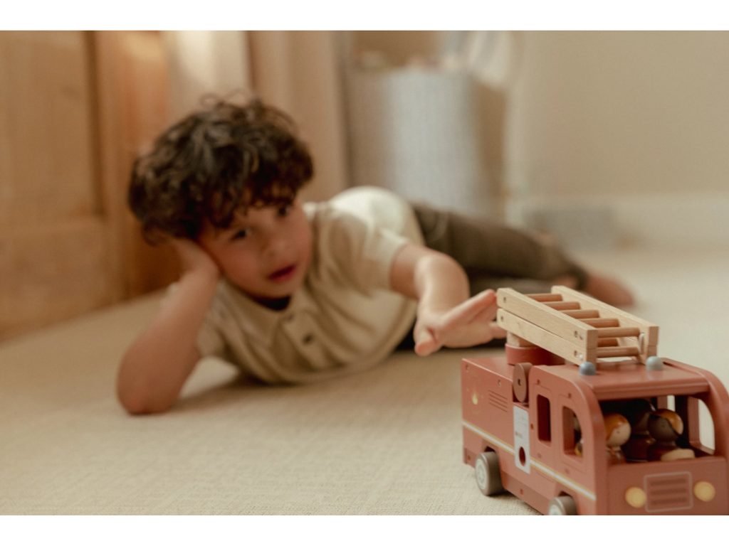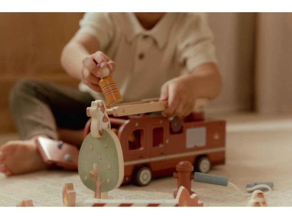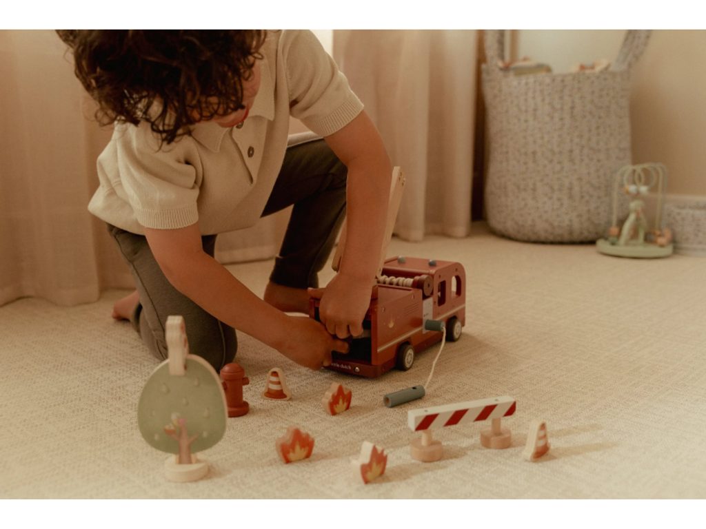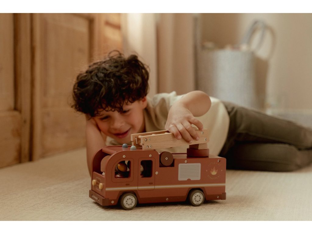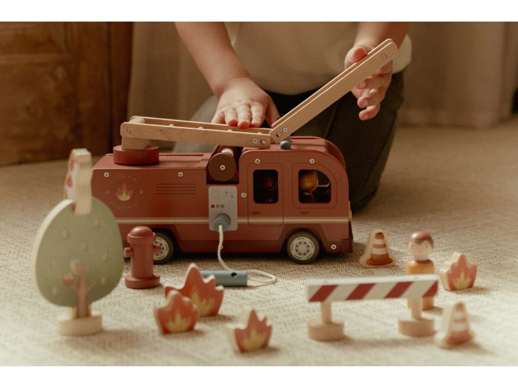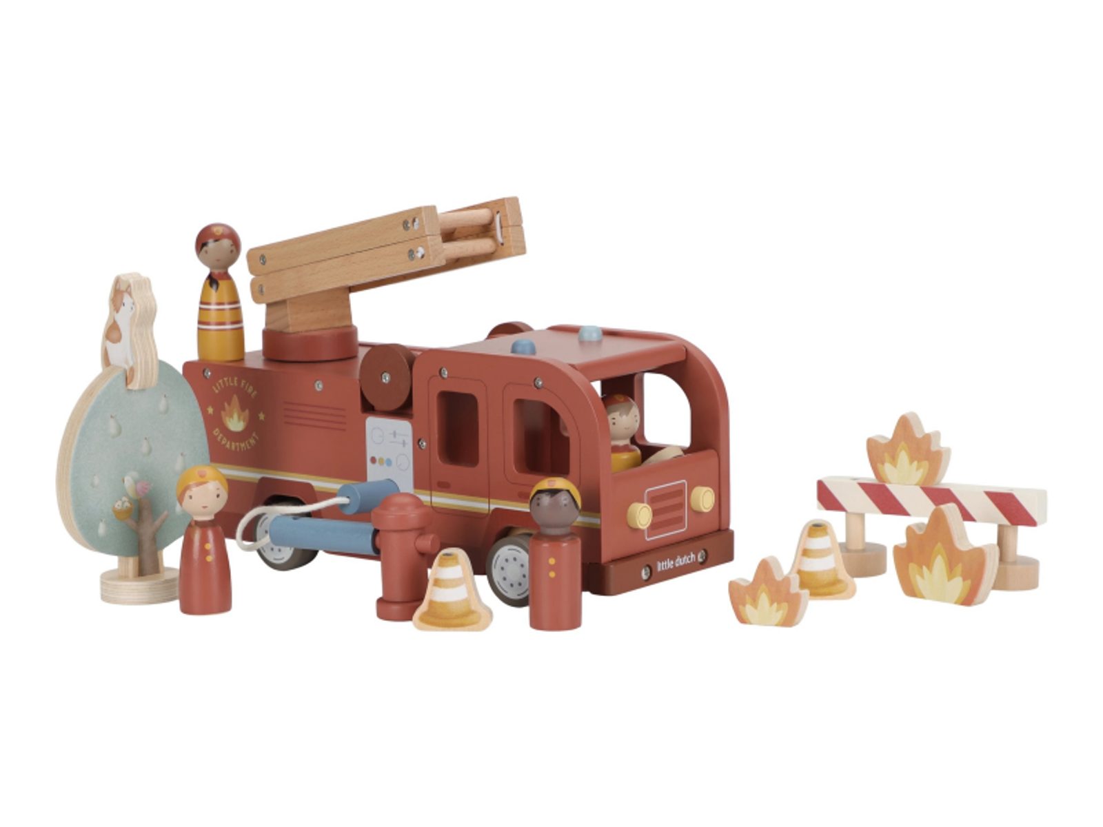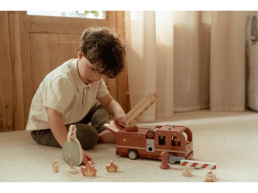 Hasičský náklaďák se čtyřmi hasiči je připraven vyrazit do akce! Někdy je potřeba zachránit kočičku ze stronu, jindy uhasit požár nebo pomoci policii při dopravní nehodě. Pro všechny tyto situace je náklaďák vybaven výsuvným žebříkem a odnímatelnou hadicí, kterou lze připojit k hydrantu nebo přímo k vozu. Sadu tvoří hasičský náklaďák, čtyři figurky hasičů, plameny, hydrant, strom s kočičkou a zábrana – vše, co je potřebné pro napínavou záchrannou misi. Robustní provedení, pohyblivé části a důraz na detail podporují rozvoj motoriky, fantazie a schopnosti vyprávět příběhy. Hračka je součástí kolekce vysoce kvalitních dřevěných hraček Little Dutch, navržených s důrazem na bezpečnost a originální design. Vyrobeno z odolného FSC certifikovaného dřeva. Rozměry: 28 × 17 × 11,5 cm Vhodné pro děti od 2 let.