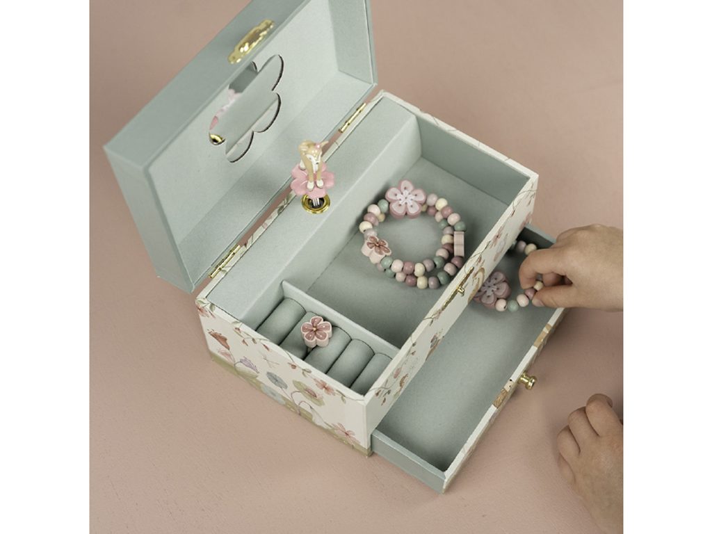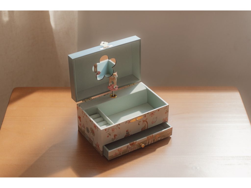 Krásná šperkovnice se zrcátkem a hudebním boxem, který po natažení hraje něžnou melodii. Vaše malá parádnice si do šperkovnice s potiskem motivů ze života v lese může ukládat své šperky a jiné vzácné drobnosti. Šperkovnice je součástí designové kolekce hraček a doplňků Little Dutch Forest Friends inspirované životem v lese. Rozměry: 10 x 10,4 x 18 cm Vhodné pro děti od 3 let.