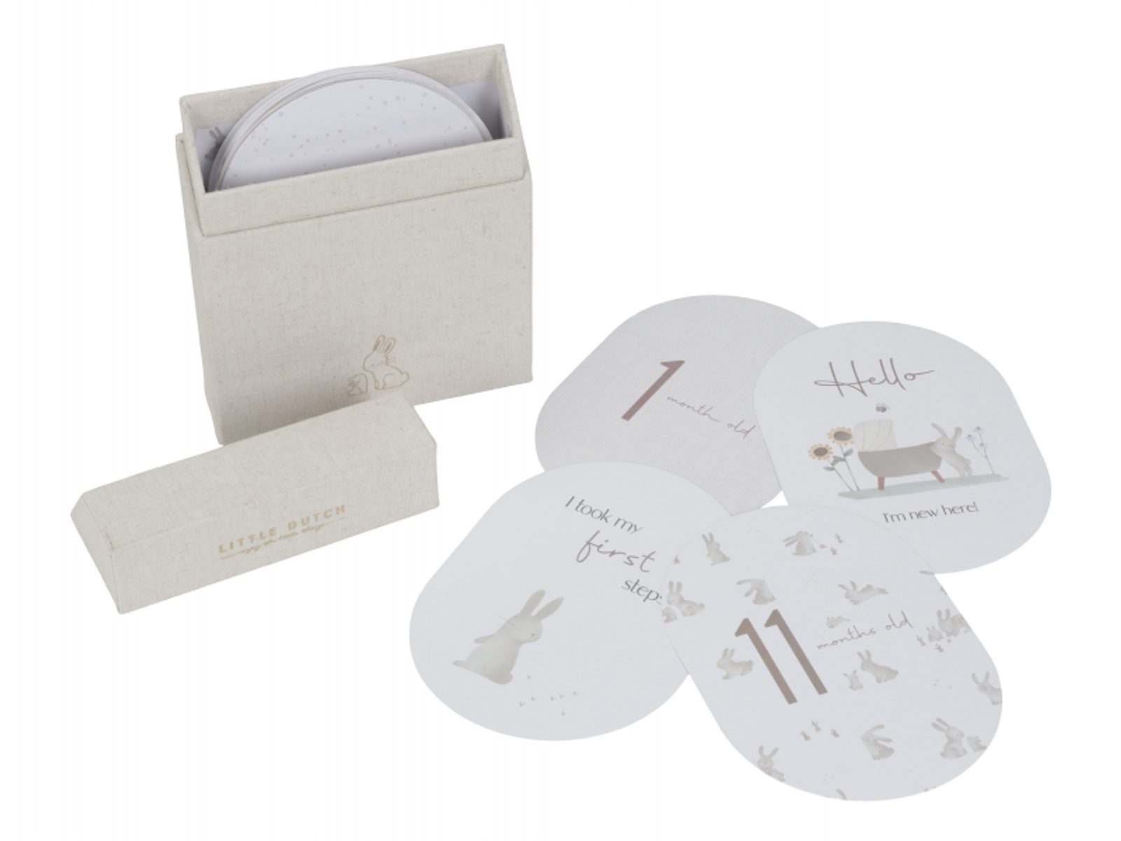Sada originálních 21 karet s krásnými ilustracemi vám pomůže zachytit vzácné vzpomínky na jednotlivé milníky v životě vašeho miminka od narození, od prvního úsměvu až po první krůčky. Každý okamžik je vzácný, každý milník je jedinečný a při využití těchto karet na fotografiích vždy poznáte, který z těchto oakmžiků fotografie zachytila. Karty jsou dodávány v kvalitní dárkové krabičce a jsou tak ideální i jako dárek pro novorozené miminko. Sada je součástí designové kolekce hraček a doplňků Little Dutch Baby Bunny. Vhodné od narození.