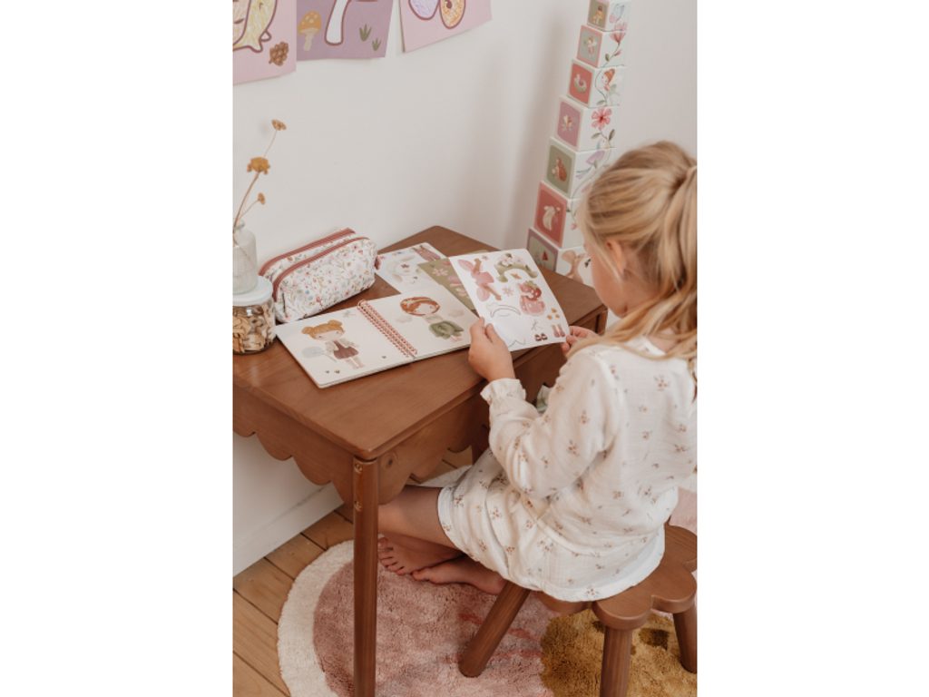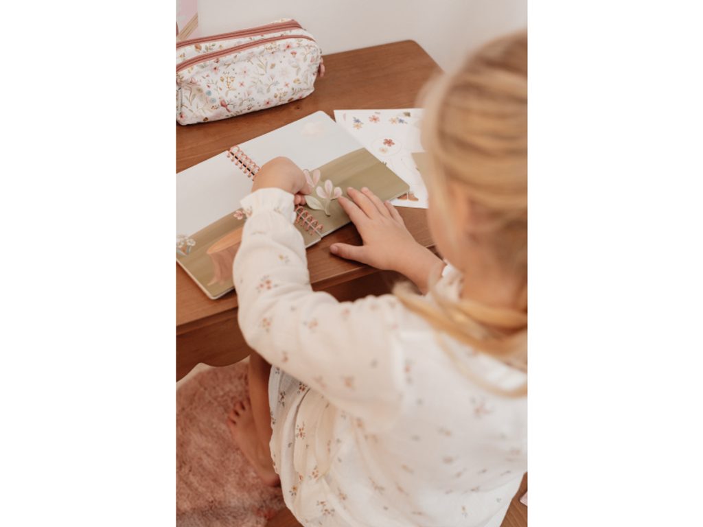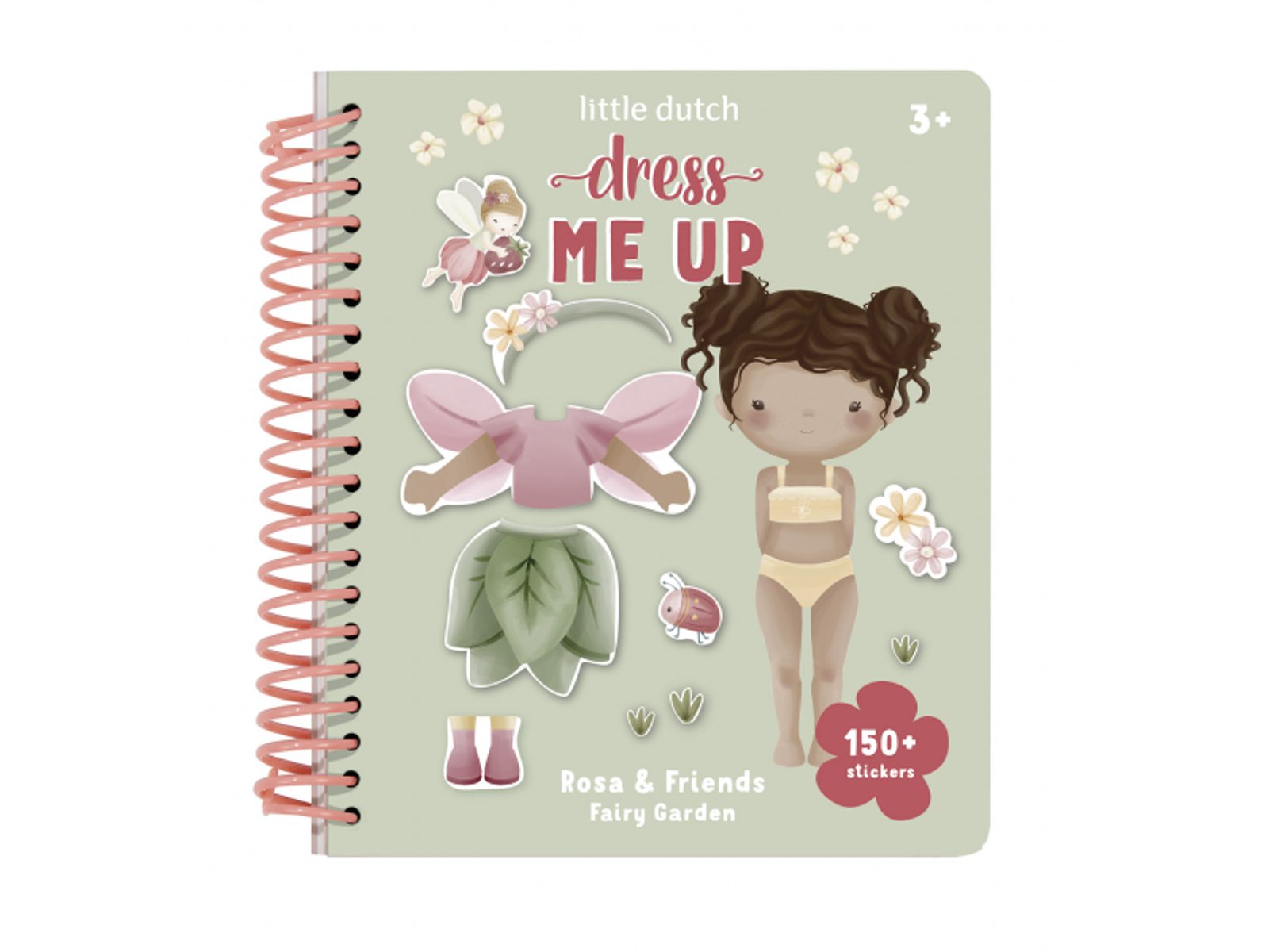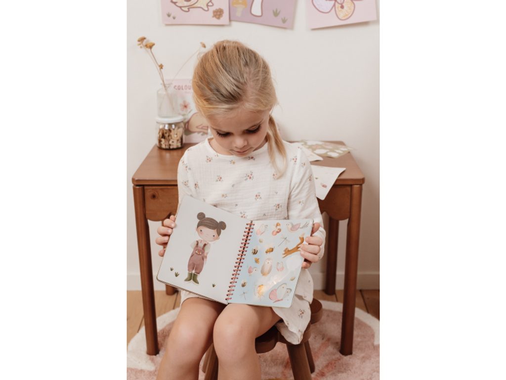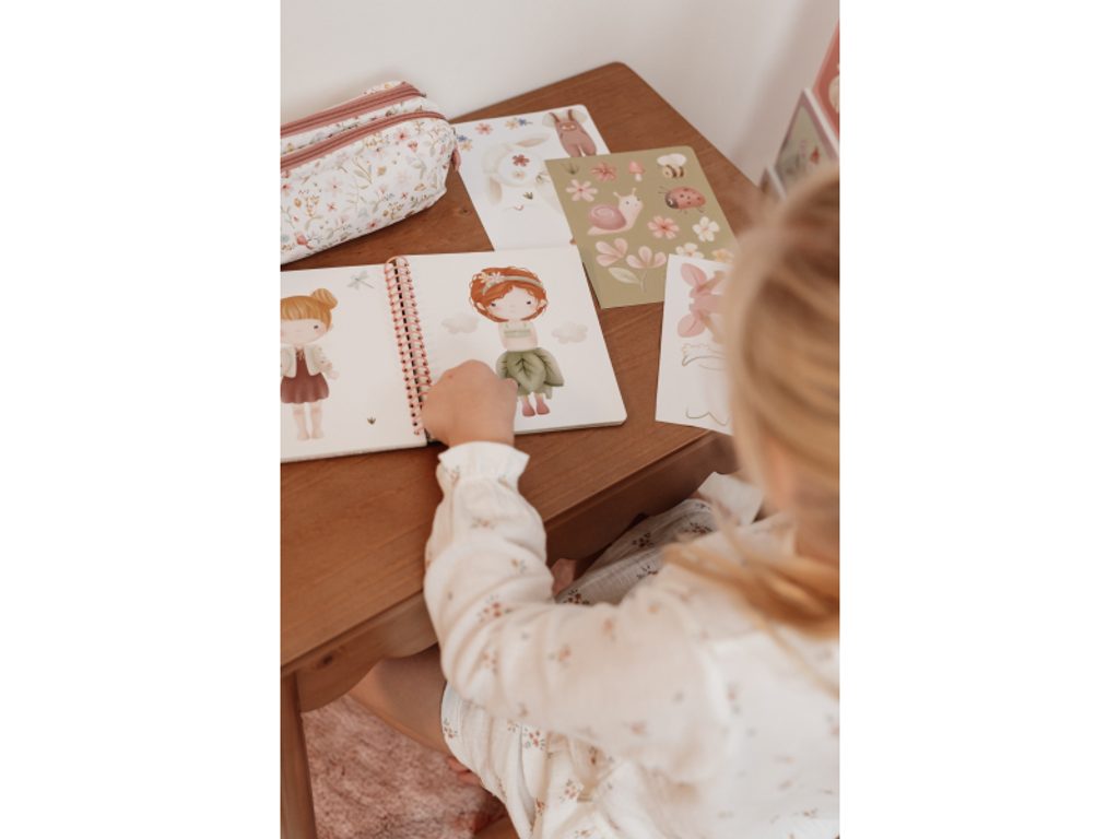Díky kroužkové vazbě knížka z pevného kartonu zůstává otevřená, což usnadňuje pohodlné kreslení a nalepování samolepek. Knížka je součástí designové kolekce hraček a doplňků Little Dutch Fairy Garden, inspirované kouzelným životem na zahradě.