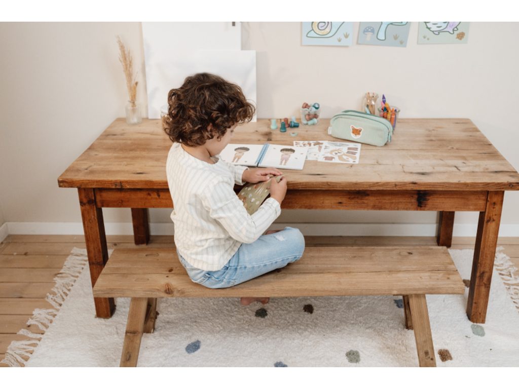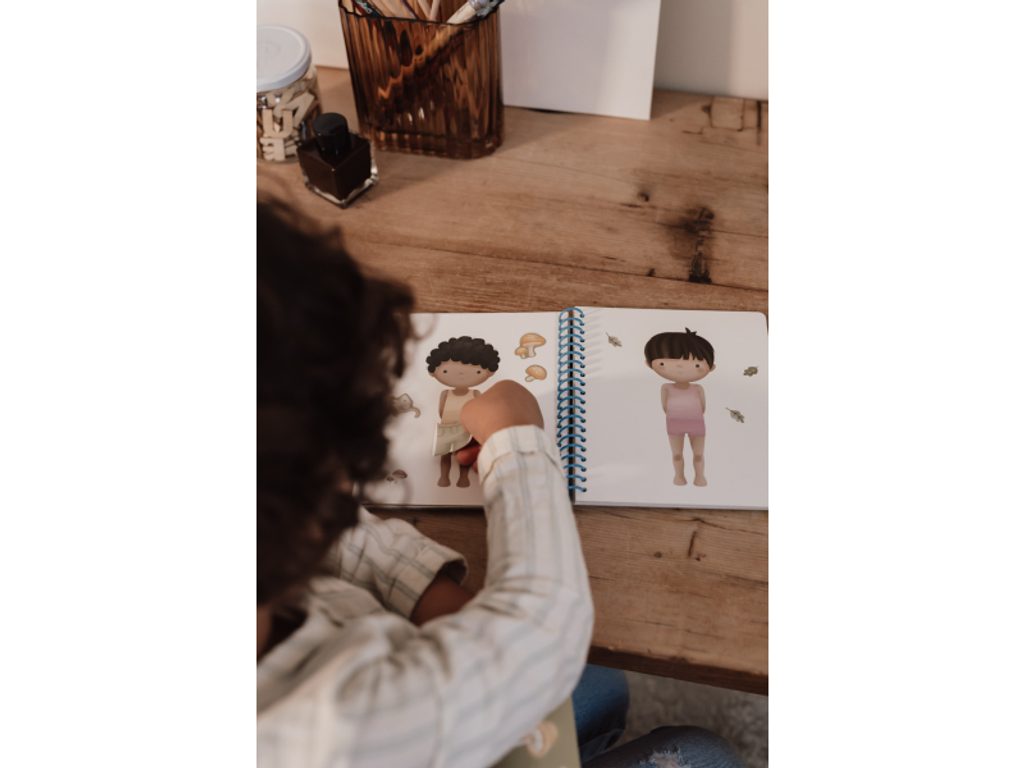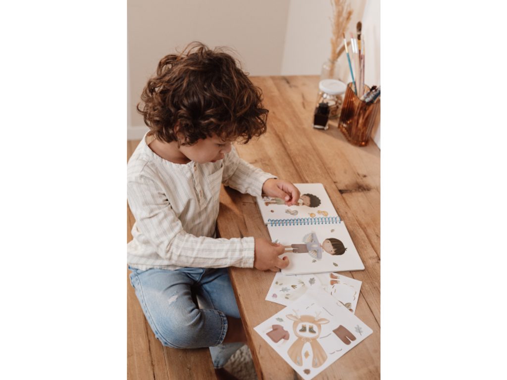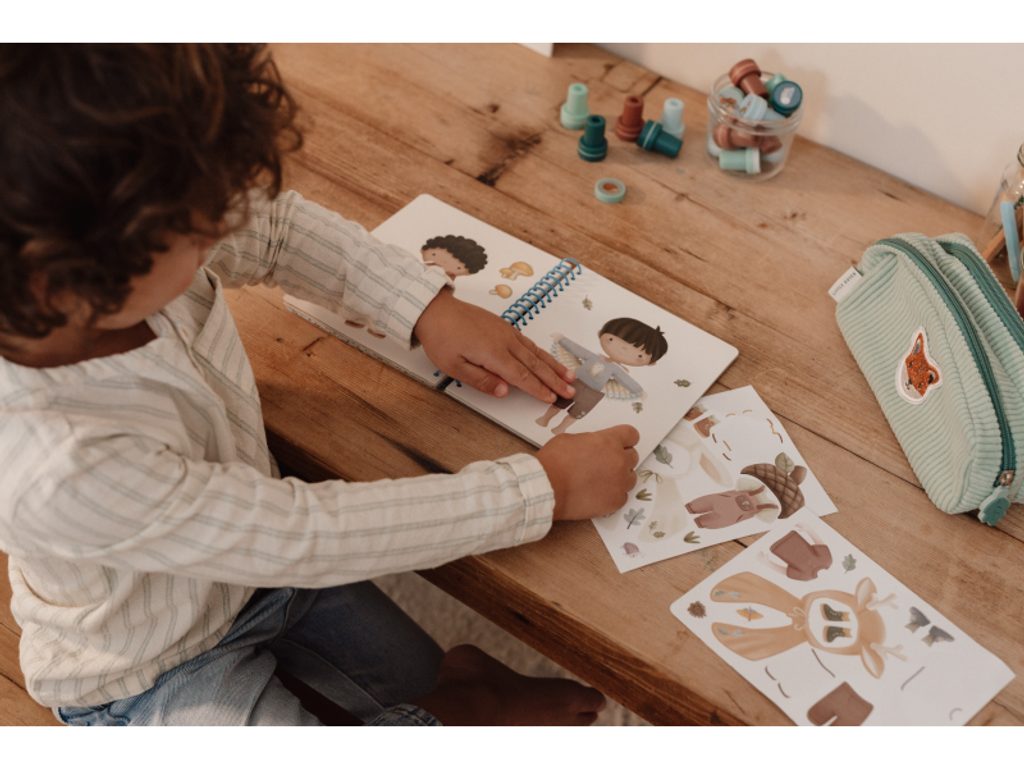 Díky kroužkové vazbě knížka z pevného kartonu zůstává otevřená, což umožňuje pohodlné kreslení a nalepování samolepek. Knížka je součástí designové kolekce hraček a doplňků Little Dutch Forest Friends, inspirované životem v lese.