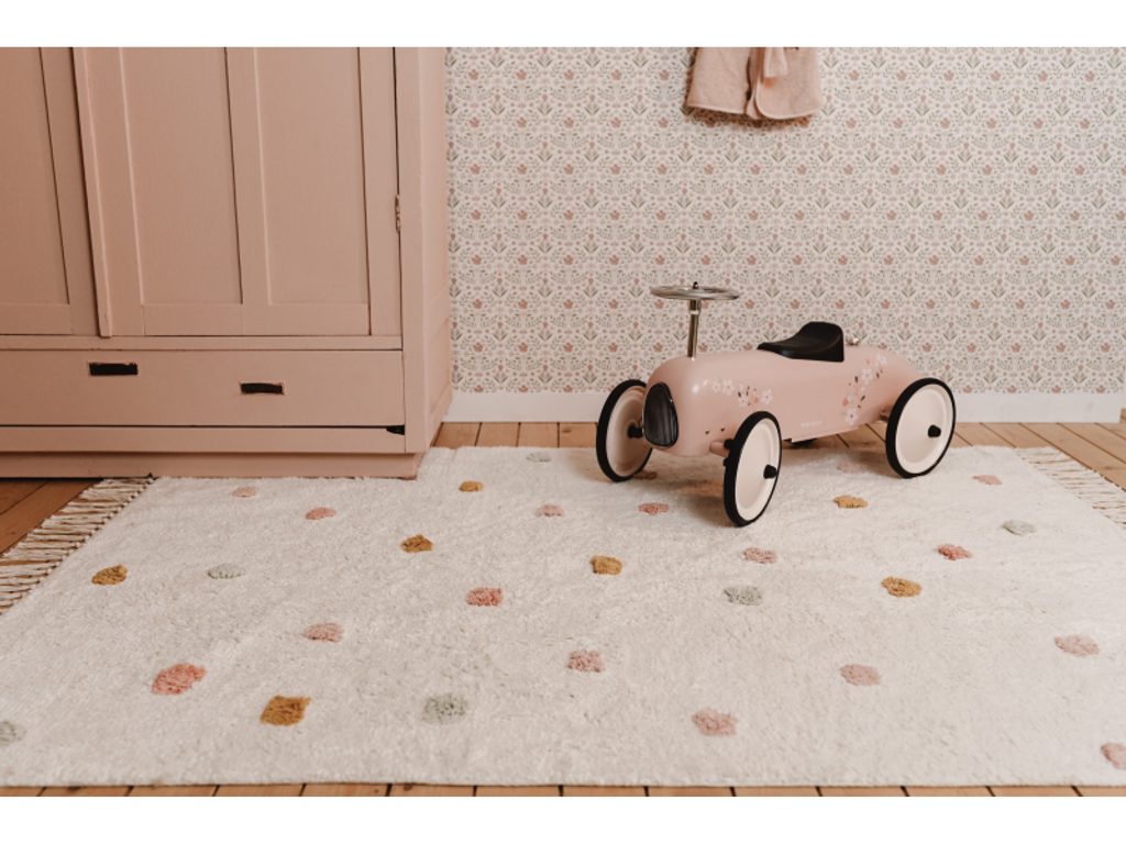 Přineste do dětského pokoje příjemnou a veselou atmosféru s koberečkem od Little Dutch! Tento koberec má jemný béžový podklad, který je ozdoben hravými puntíky v růžové, modré a okrové barvě. Třásně na kratších stranách mu dodávají útulný a jedinečný vzhled. Vaše dítě si na něm bude užívat pohodlné sezení a hraní.