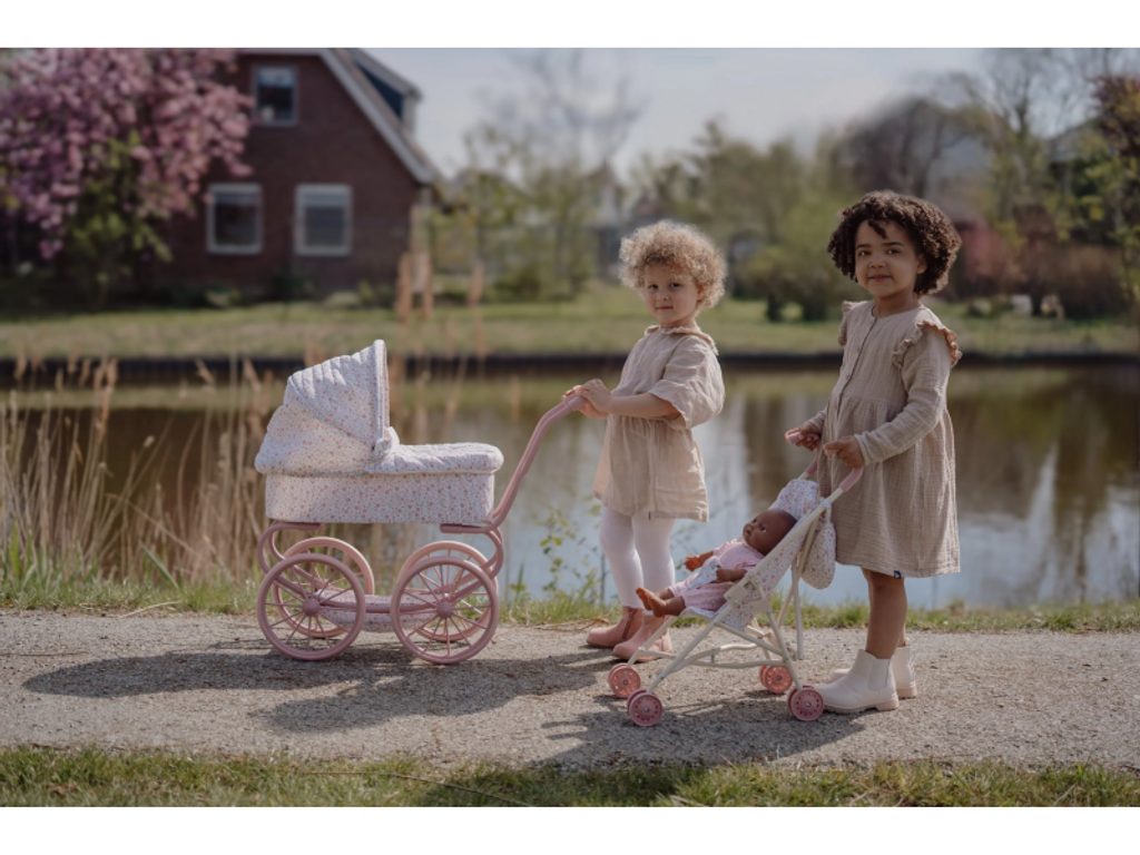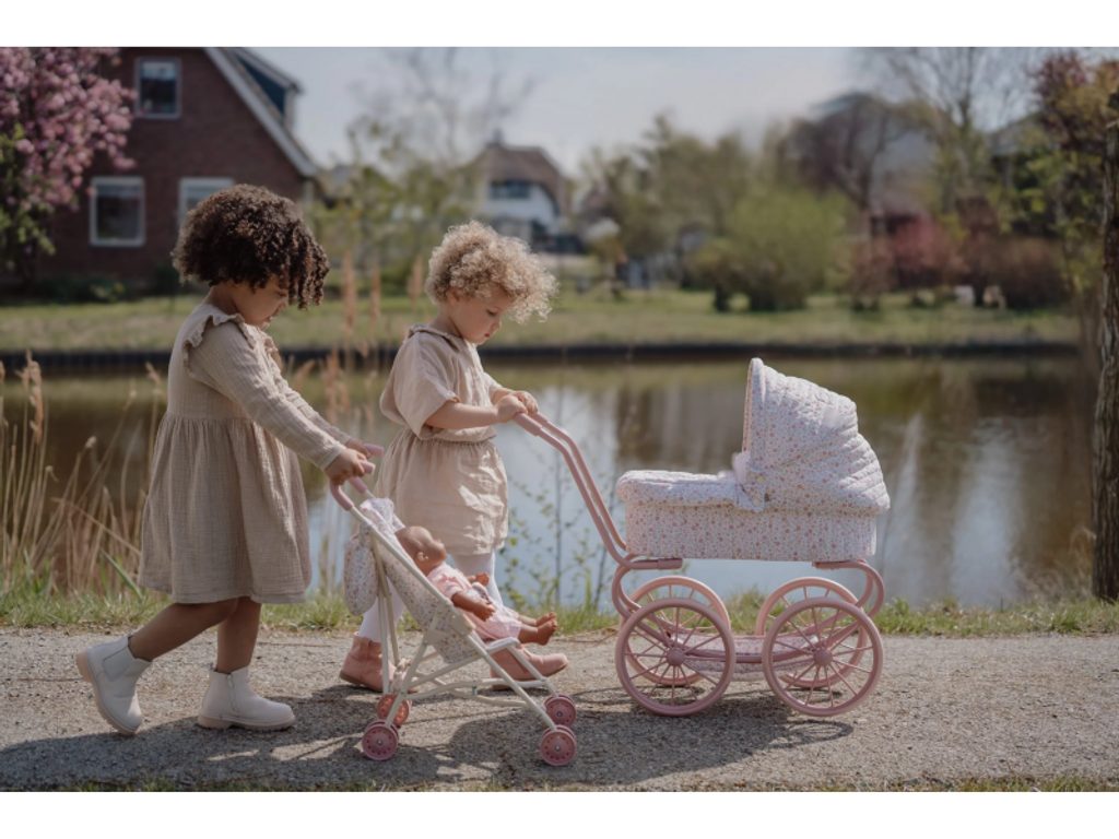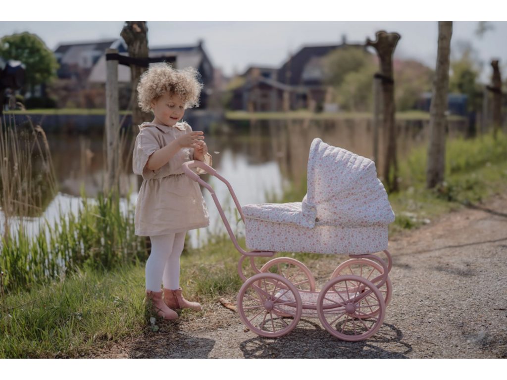 Klasický kočárek pro panenky Little Dutch v krásném retro designu potěší každé dítě, které si rádo hraje s panenkami. Díky čtyřem velkým kolečkům je jízda stabilní a plynulá – a to jak doma, tak venku. Uvnitř je měkká matrace, která poskytne panence pohodlné místo k ležení. Spodní úložný košík nabídne dostatek prostoru na doplňky nebo malé hračky. Robustní kovová konstrukce zajišťuje bezpečné a dlouhodobé používání, zatímco madlo s měkkým úchopem padne dětem pohodlně do ruky. Skládací stříška a odnímatelný nánožník pro realistickou hru Textilní části s krásným květinovým potiskem a prošívanými detaily Měkká matrace pro extra pohodlí panenky Spodní úložný košík na hračky a doplňky Odolná kovová konstrukce pro stabilní a bezpečné používání Měkké madlo pro pohodlné tlačení Stylový květinový design krásně ladí s dalšími doplňky pro panenky z kolekce Little Dutch Soft Flowers. Rozměry: 74,5 × 33,5 × 69 cm Panenka není součástí balení. Vhodné pro děti od 3 let.