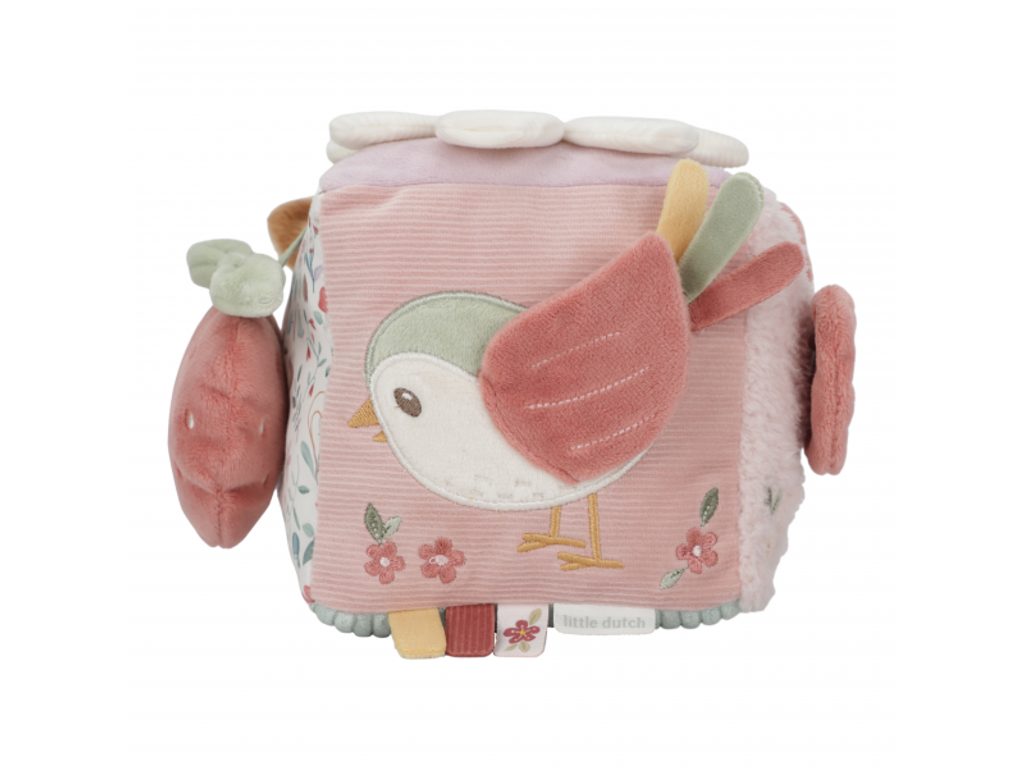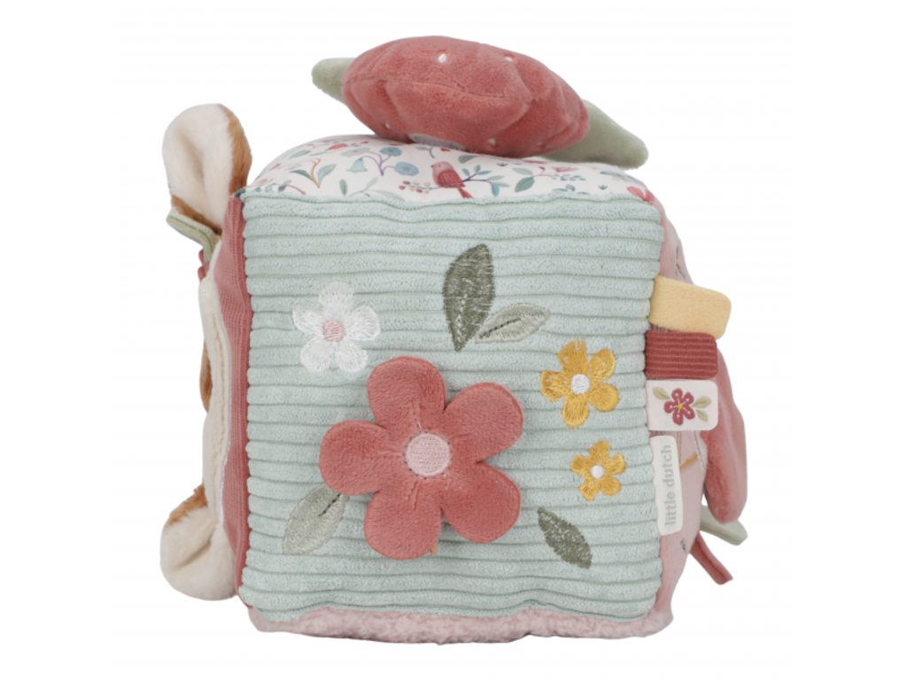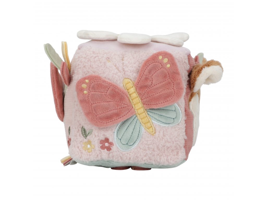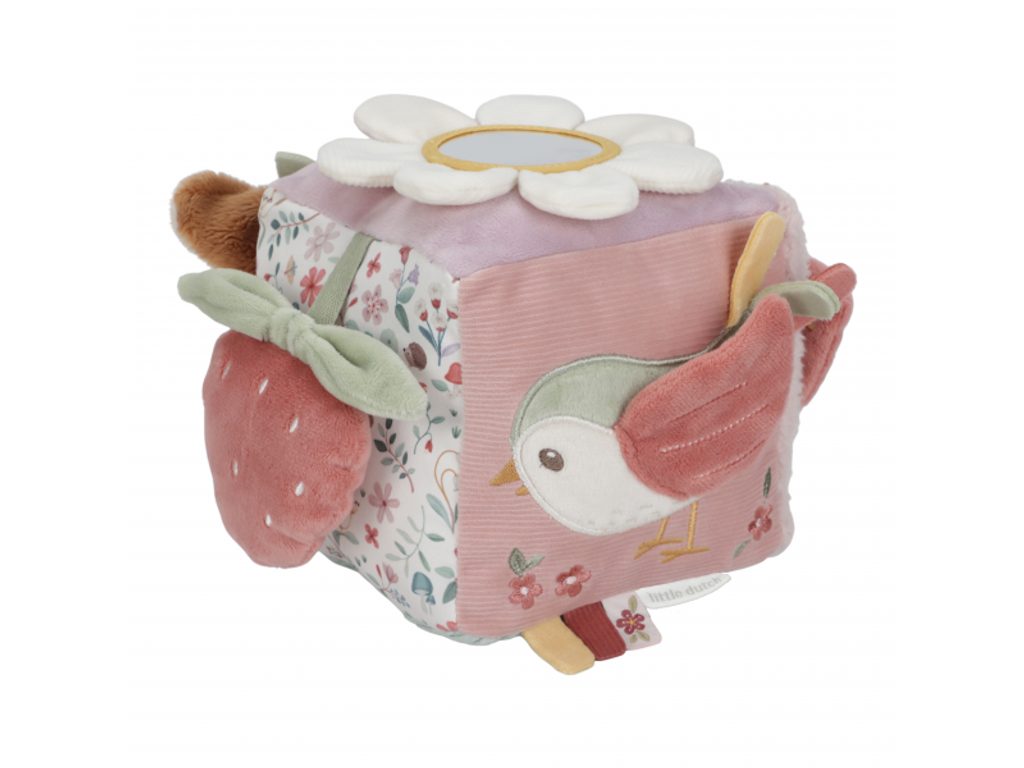 Měkká plyšová kostka s půvabnými motivy ze života na zahradě je navržena tak, aby se snadno uchopila malými dětskými ručičkami. Různorodé textury, připevněné hračky a vyšívané ilustrace lákají dítě k objevování, a kostka navíc jemně cinká při pohybu. Tato hračka je součástí designové kolekce Little Dutch Fairy Garden, inspirované kouzelným životem na zahradě.