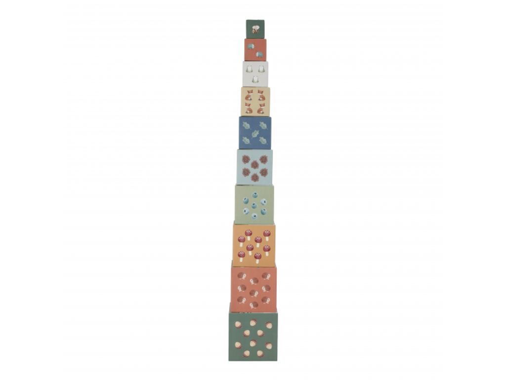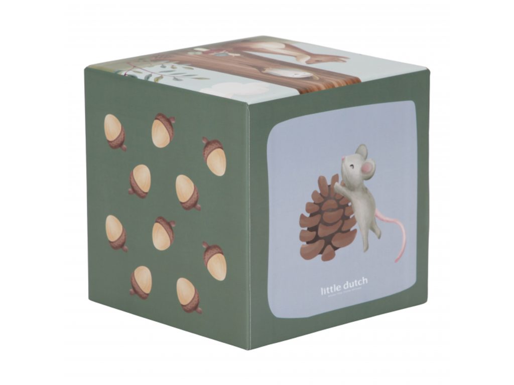 Barevné kartonové kostky s krásnými ilustracemi motivů ze života v lese jsou skvělou hračkou pro děti. Vaše dítě si může kostky skládat na sebe do vysoké věže nebo vedle sebe podle velikosti. V pozdějším věku se může díky očíslovaným kostkám hravým způsobem učit počítat a rozpoznávat číslice. Nejmenší kostka má rozměr 5 cm, největší pak 14 cm. Po skončení hraní lze kostky snadno uložit složením do sebe. Hračka je součástí designové kolekce Little Dutch Forest Friends, inspirované životem v lese.