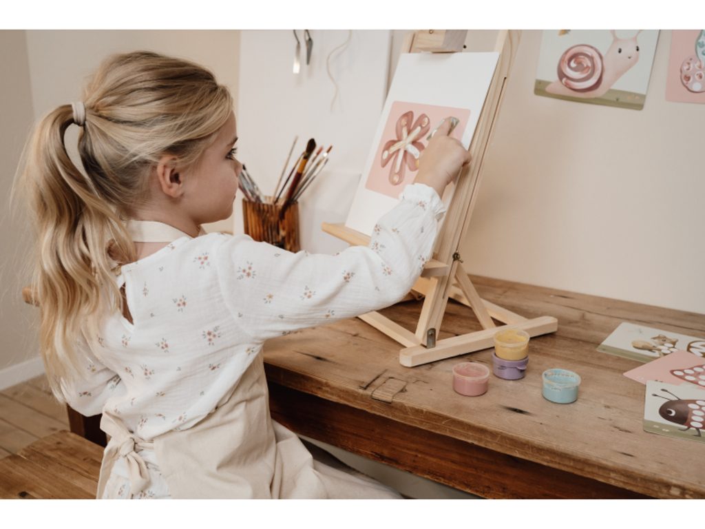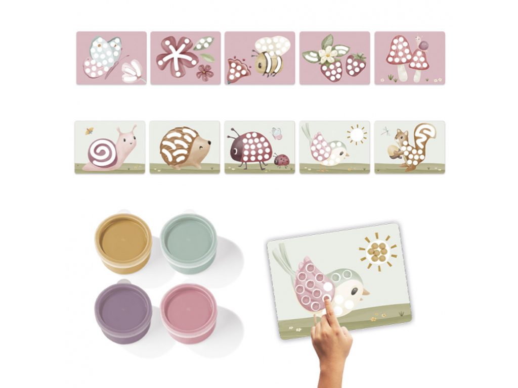 Sada pro malování prsty v krásném provedení umožní vašemu dítěti popustit uzdu své kreativitě. Sada obsahuje 4 jemné pastelové barvy a předtištěné kartičky s motivy ze života na zahradě. Hraní s prstovými barvami stimuluje rozvoj jemné motoriky a kreativitu dítěte. Snadno omyvatelné barvy jsou bezpečné pro pokožku dítěte. Sada je součástí designové kolekce hraček a doplňků Little Dutch Fairy Garden, inspirované životem na zahradě.
