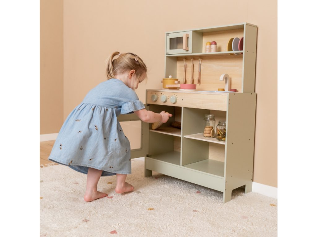 Krásná dřevěná kuchyňka nabízí vše, o čem malý kuchař či kuchařka sní, když vymýšlí nové recepty pro rodinu či své panenky a oblíbené plyšáky. S pánví, hrncem a dalším nádobím není problém připravit několik chodů najednou. Trouba upeče koláč, na sporáku se uvaří zelenina, mikrovlnka rychle ohřeje, co je potřeba. K dispozici je i sůl a pepř na dochucení. Po práci si kuchař umyje ruce v dřezu. Skříňka nabízí prostor pro uložení potravin. Děti se učí napodobováním svých rodičů a zároveň taková hra rozvíjí kreativitu, soustředění, jemnou motoriku a sociální dovednosti. Kuchyňku můžete doplnit dalšími dřevěnými hračkami Little Dutch, např. kávovarem, toustovačem, kuchyňskou váhou, krájecím ovocem, krájecí zeleninou, čajovým servisem apod. Rozměry: 91 x 58 x 28 cm Vhodné pro děti od 3 let.