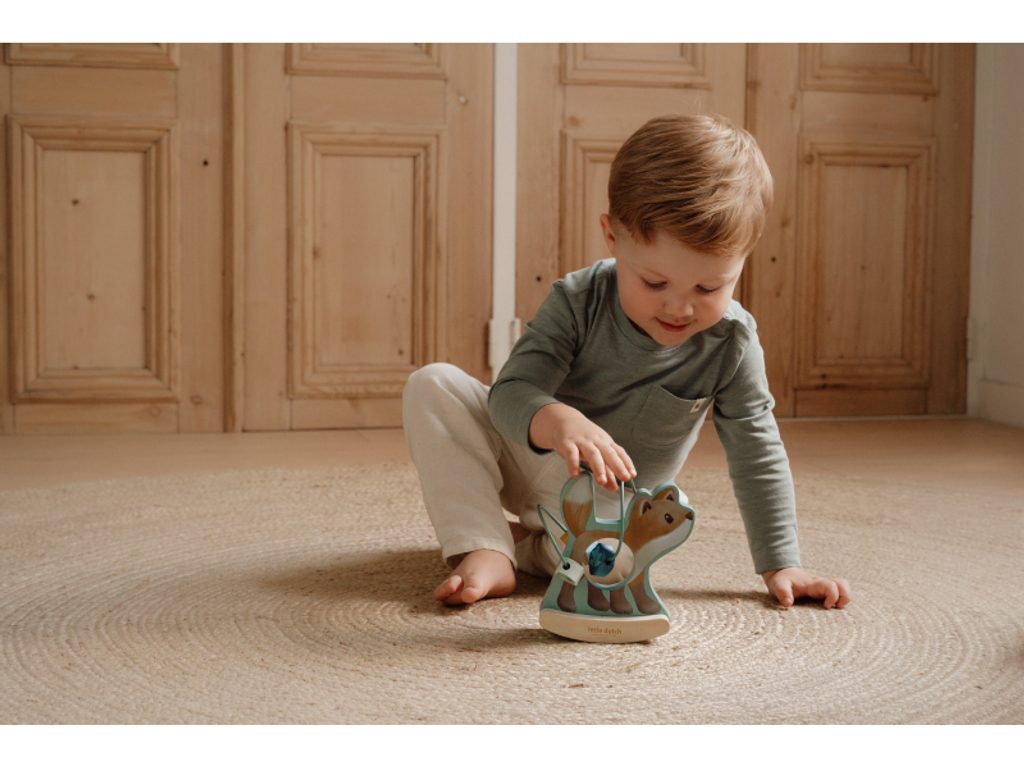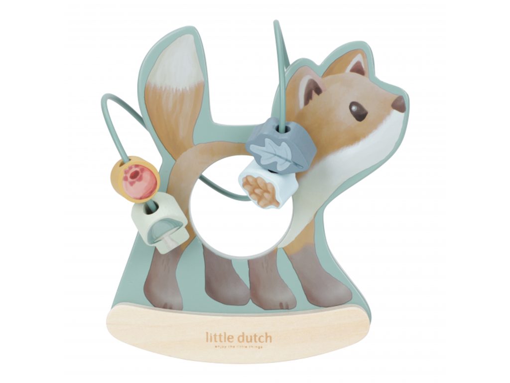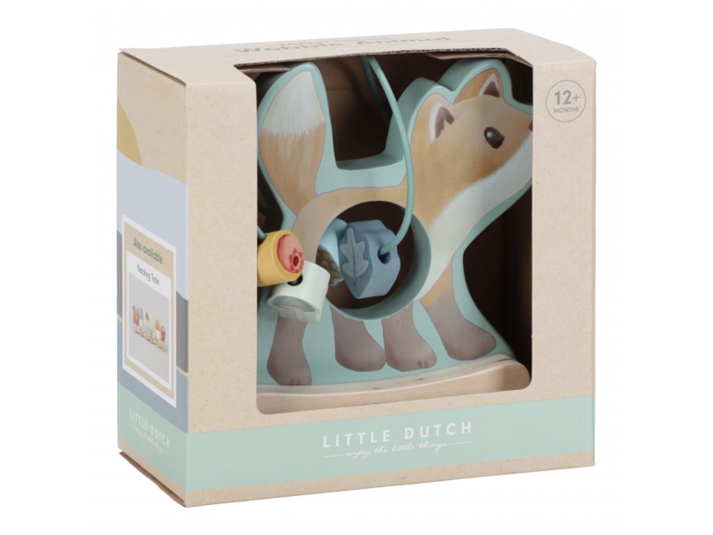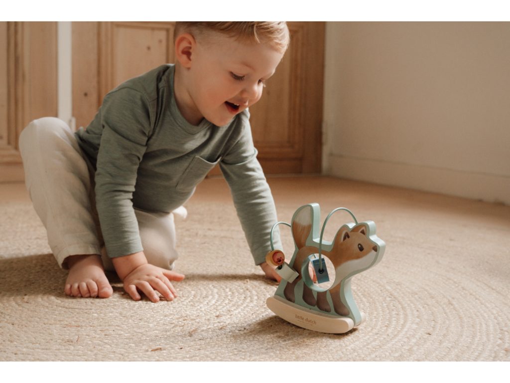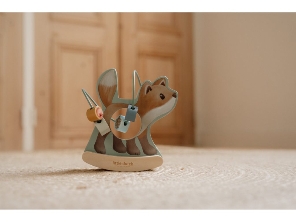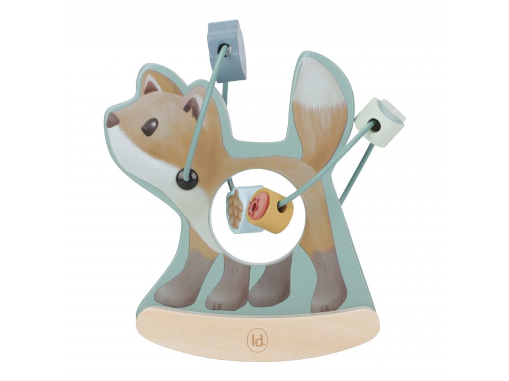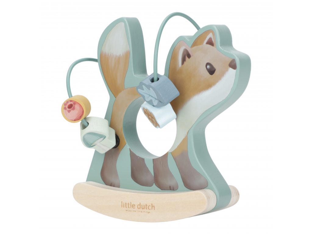 Dřevěná hračka v podobě něžné lišky je navržena tak, aby po postavení na podlahu či stůl jemně houpla. Kolem ní se na spirále pohybují posuvné dřevěné korálky s krásnými potisky houbičky, šišky, lístku a brusinky. Tato hračka je ideální pro rozvoj koordinace ruka/oko dítěte a zároveň se stává půvabnou dekorací v dětském pokoji.
