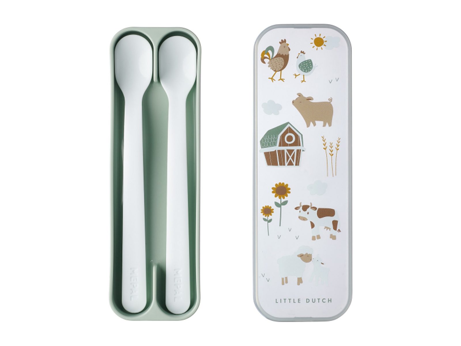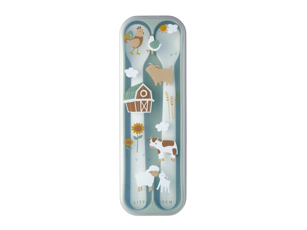 Plastové lžičky s dlouhou rukojetí jsou ideální pro první příkrmy. Mělké a úzké zakončení lžičky usnadňuje krmení miminka, dlouhá rukojeť umožňuje rodiči nabírání příkrmu i ze skleničky bez znečištění rukou. Praktické pouzdro umožňuje hygienické přenášení lžiček např. v přebalovací tašce. Lžičky jsou součástí designové kolekce hraček a doplňků pro děti Little Dutch Farma. Délka lžičky: 14,5 cm Materiál: PP, neobsahuje BPA Možno mýt v myčce. Vhodné pro děti od 4 měsíců.