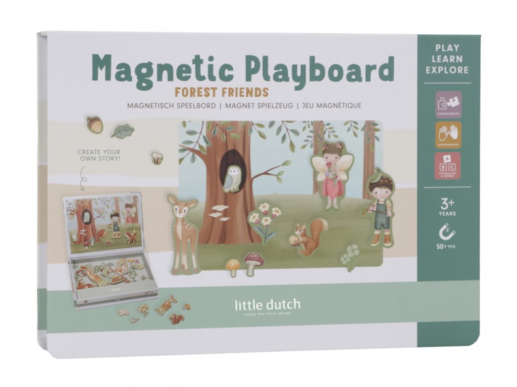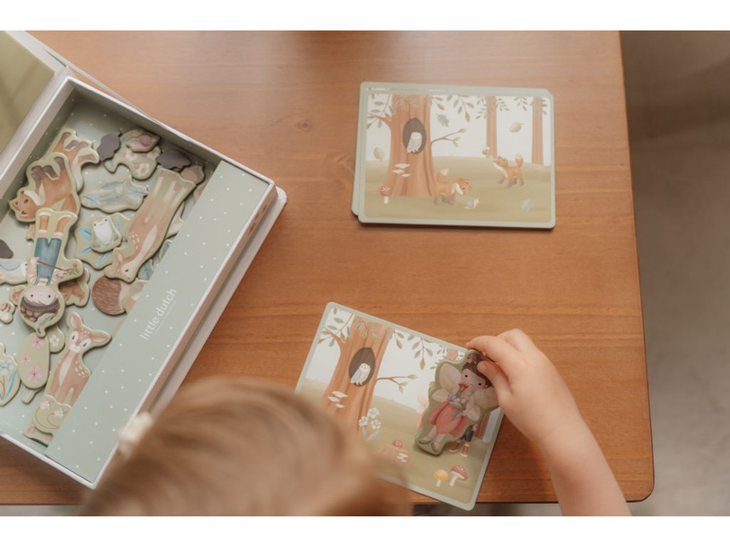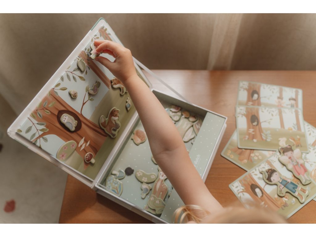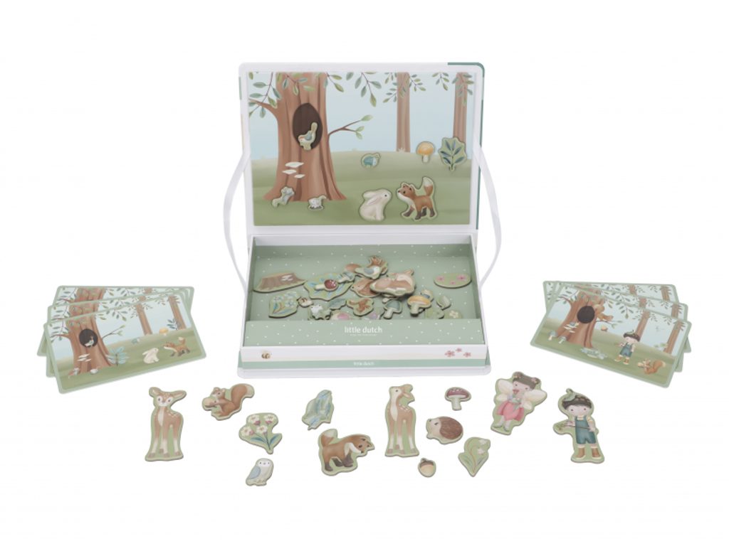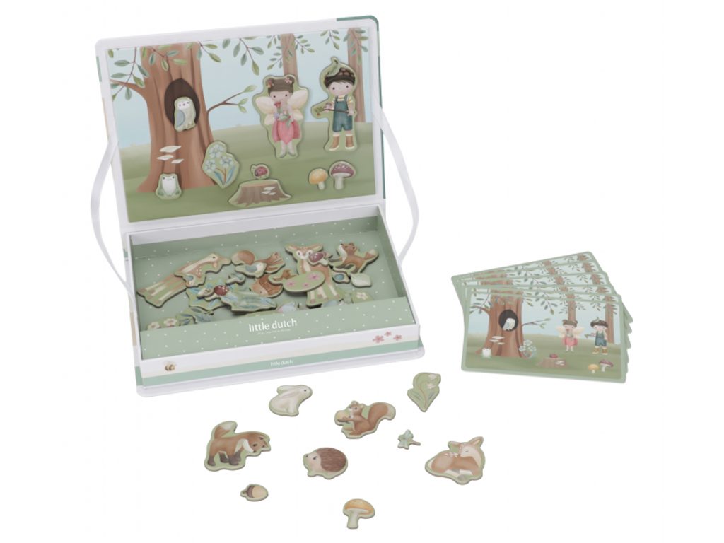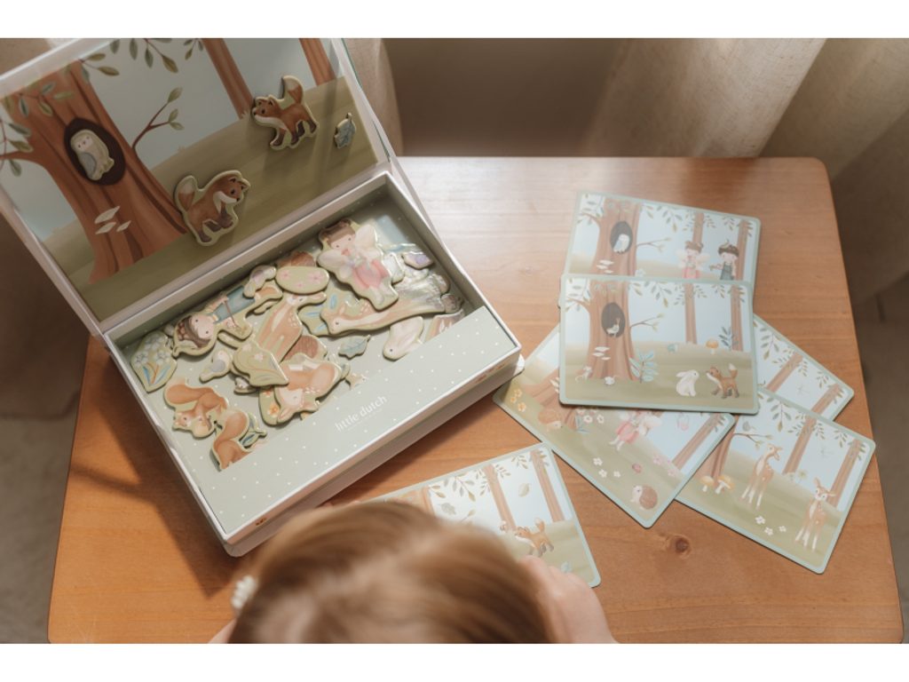 Magnetická hra se skládá z různých magnetických dílů s motivy ze života v lese a 6 vzorových karet. Magnetické víko lze snadno využít jako herní desku, což přidává na praktičnosti a hravosti. Tato hračka je součástí designové kolekce Little Dutch Forest Friends, inspirované krásou přírody.