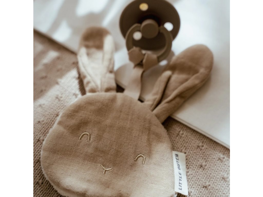 Měkoučký muchláček Little Dutch ve tvaru králíčka se rychle stane oblíbeným společníkem vašeho miminka. Je ideální na mazlení i jako praktický držák dudlíku, který dítěti poskytne pocit jistoty a pohodlí. Extra hebký materiál - přední strana z jemného mušelínu ze 100% organické bavlny, zadní z měkkého fleecu Bezpečné pro miminka - certifikace OEKO-TEX® Standard 100 zaručuje, že je látka šetrná k pokožce i zdraví miminka Praktické poutko umožňuje připevnit šidítko, aby se neztratilo ani neušpinilo Roztomilý design zajíčka s jemnými detaily v béžové barvě zapadne do každé výbavičky Ideální velikost pro malé dětské ručičky Složení: 100% organická bavlna, podšívka 100% polyester (fleece) Rozměry: 9 × 9,5 cm Možno prát v pračce.
