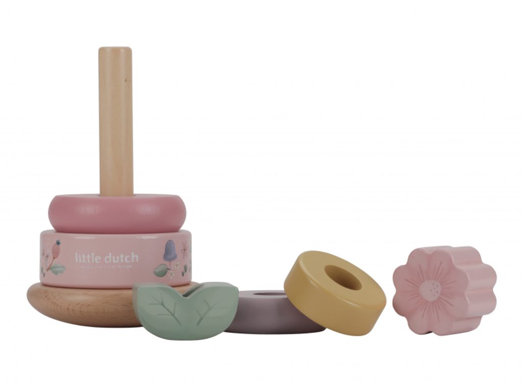 Hravé dřevěné nasazovací kroužky pro děti jsou navrženy tak, aby rozvíjely jejich koordinaci rukou a očí zábavnou a praktickou hrou. Děti se snaží umístit dřevěné kroužky ve správném pořadí a vytvořit z nich pyramidu. To je docela výzva, protože pyramida má půlkulatou základnu a tak se kýve na všechny strany! Hračka je součástí designové kolekce hraček a doplňků Little Dutch Fairy Garden inspirované životem na zahradě.