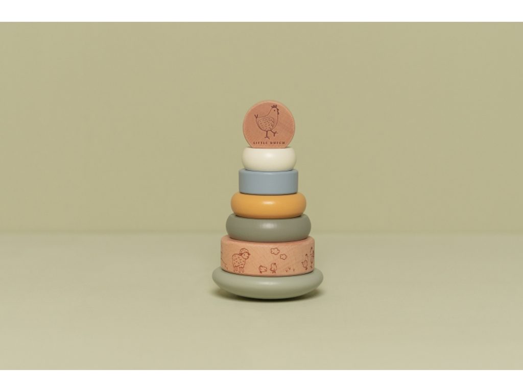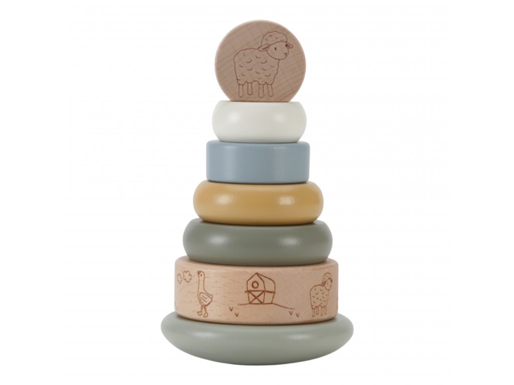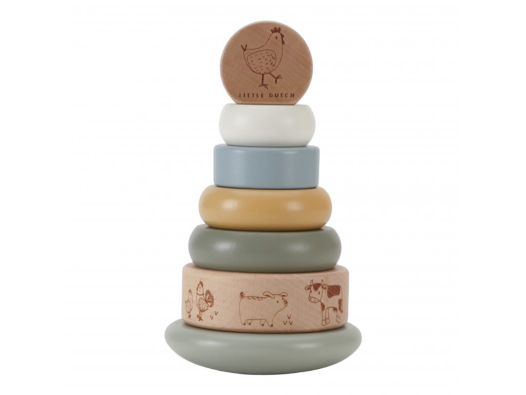 Hravé dřevěné nasazovací kroužky pro děti jsou navrženy tak, aby rozvíjely jejich koordinaci rukou a očí zábavnou a praktickou hrou. Děti se snaží umístit dřevěné kroužky ve správném pořadí a vytvořit z nich pyramidu. To je docela výzva, protože pyramida má půlkulatou základnu a tak se kýve na všechny strany! Hračka je součástí designové kolekce hraček a doplňků Little Dutch Farma. Vyrobeno z dřeva certifikovaného FSC. Rozměry: 10 x 10 x 18,5 cm Vhodné pro děti od 12 měsíců.