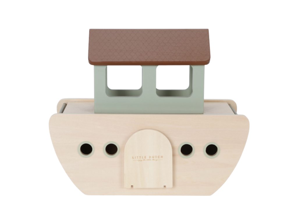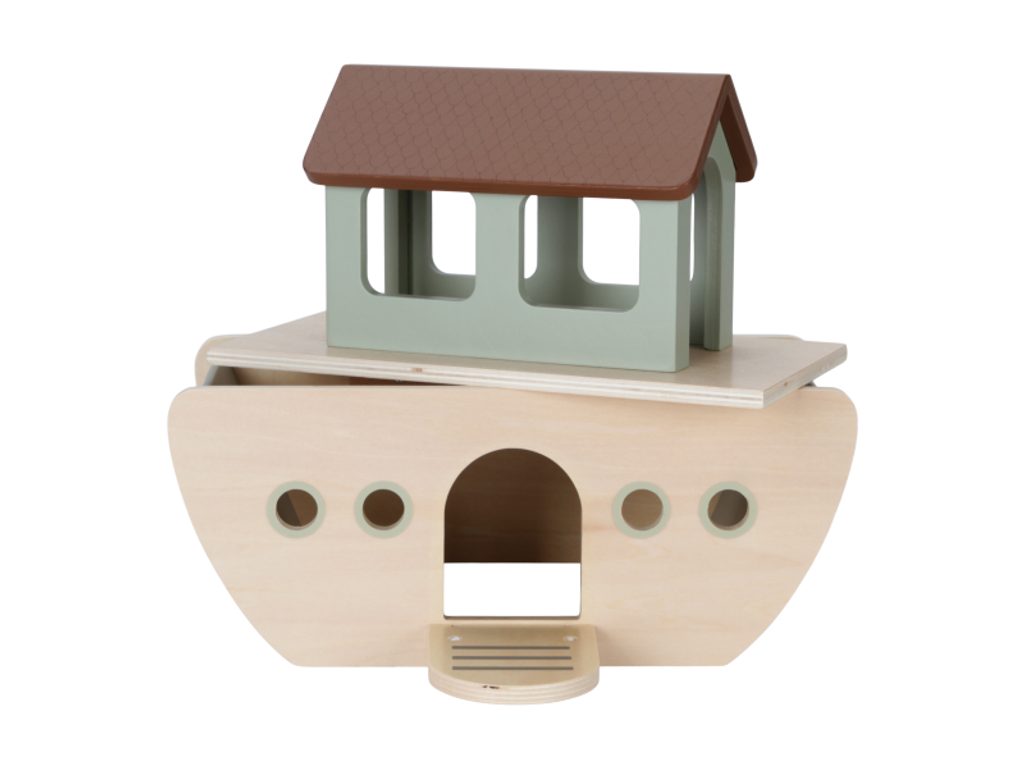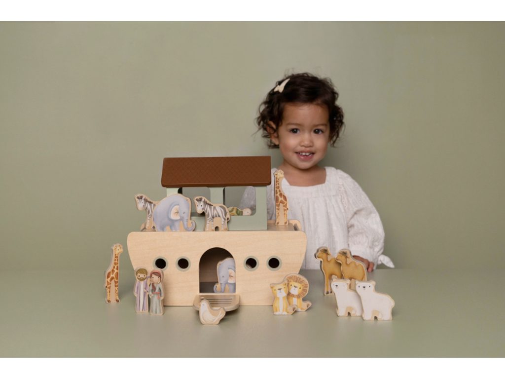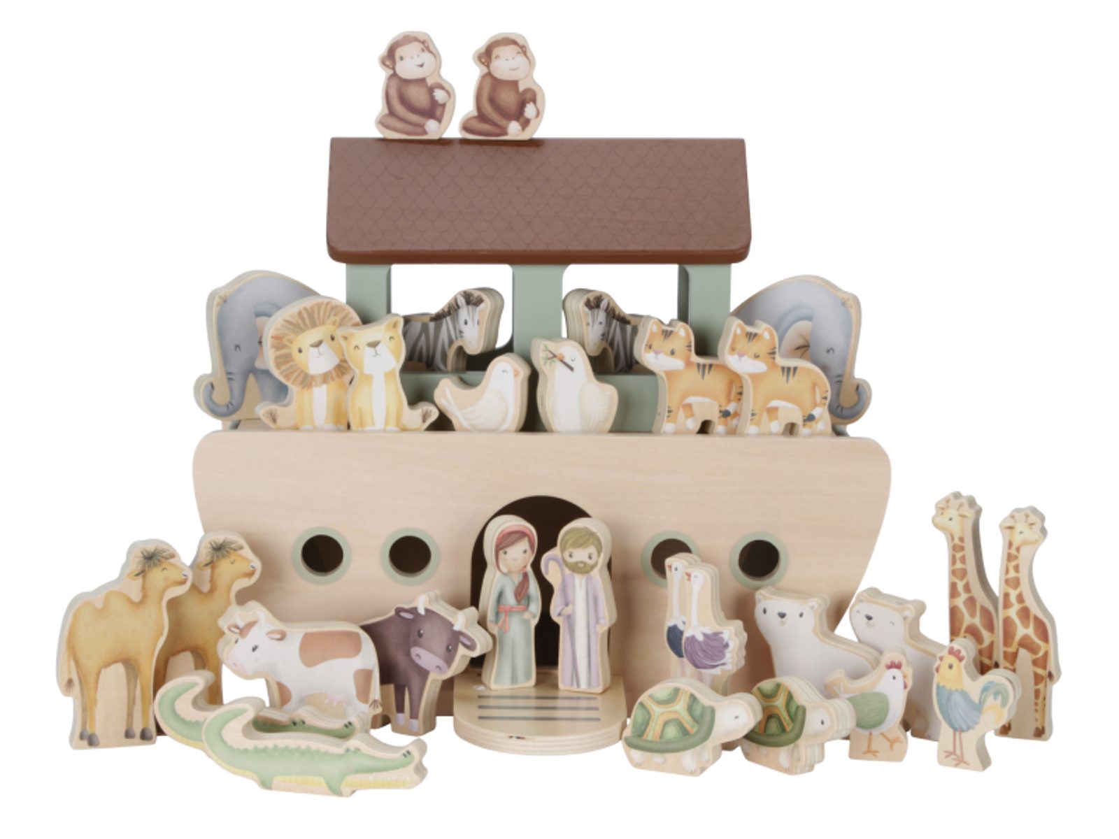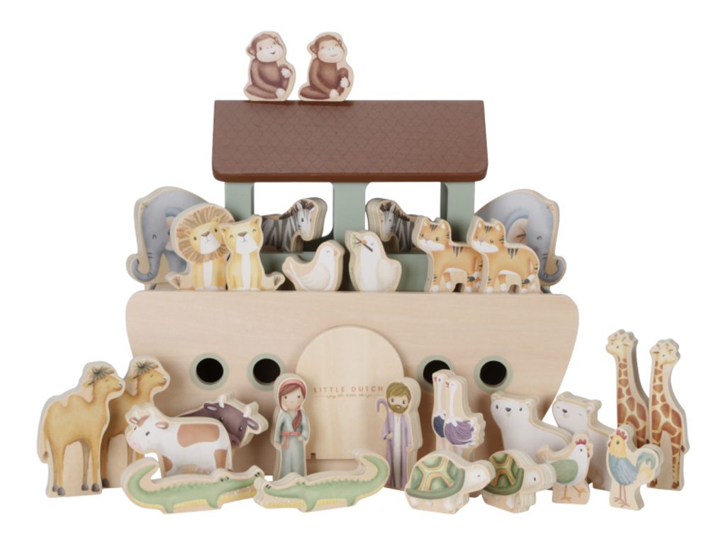 Všichni na palubu! Zahrajte si příběh Noemovy archy s touto krásnou dřevěnou sadou. Najděte páry zvířat, která k sobě patří a připravte je na cestu. 25-dílná dřevěná sada obsahuje archu s dveřmi, palubu, kterou lze zvednout a přivést všechna zvířata na palubu. Noe vezme svoji ženu a velkou skupinu zvířat na cestu přes oceán: 2 lvy, 2 slony, 2 zebry, 2 opice, 2 holuby, 2 krokodýly, 2 želvy, 2 žirafy, 2 pštrosy, 2 krávy, slepici a kohouta. Hračka pomáhá rozvíjet představivost a slovní zásobu, zatímco vaše dítě poznává tento klasický příběh. Rozměry: 29,7 x 24,7 x 14,6 cm Vhodné pro děti od 18 měsíců.