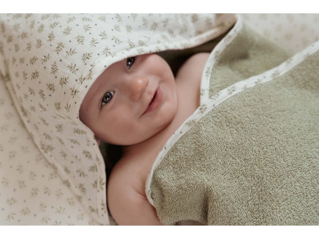Měkká froté osuška s kapucí z jemné organické bavlny je ideální pro snadné a rychlé osušení a zabalení miminka po koupeli. Osuška je součástí designové kolekce textilu Little Dutch Blueberry Leaves.