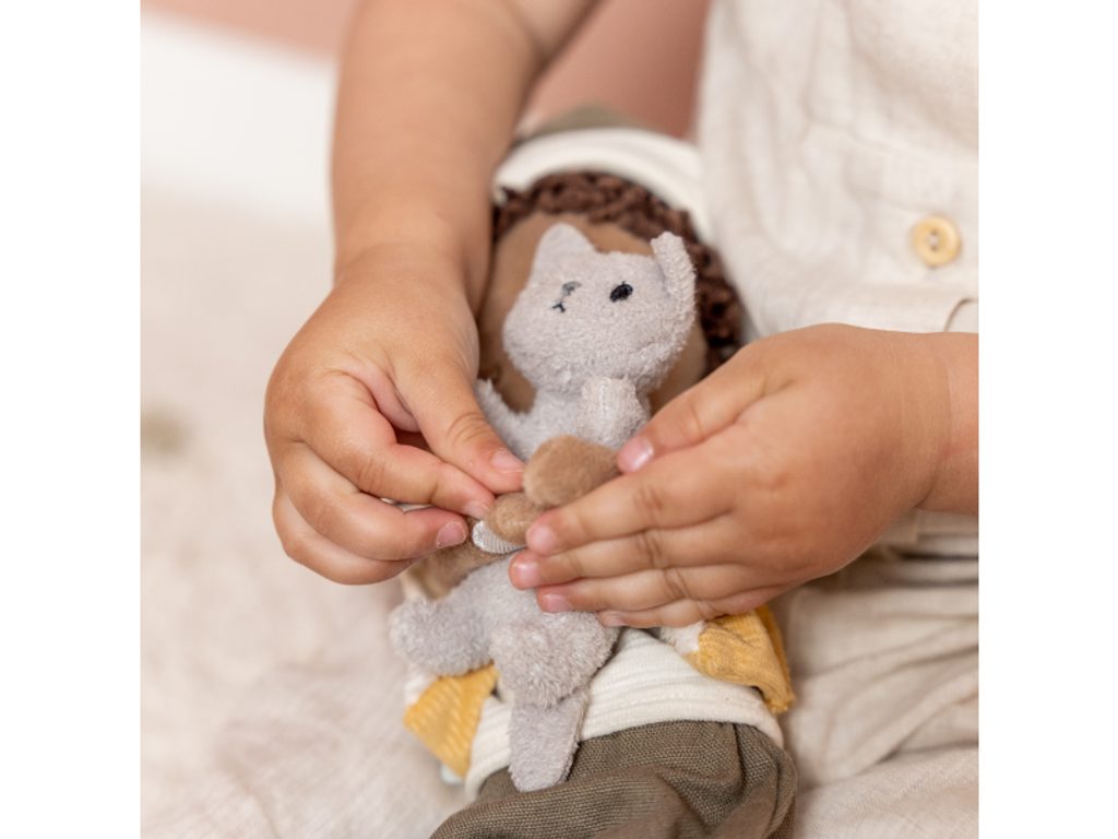 Rošťácká plyšová panenka Jake z měkkého jemného materiálu je oblečená do vestičky, čepice a holínek. V náručí drží plyšovou kočičku, bez které nedá ani krok! Panenka je vhodná na hraní i mazlení a bude se s ní i krásně usínat! Panenka je dodávána v krásné dárkové krabičce. Rozměry: 6 x 9 x 35 cm Vhodné pro děti od 12 měsíců.