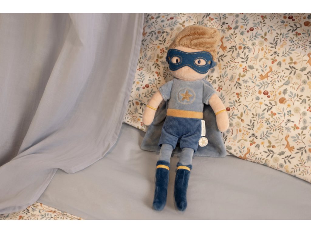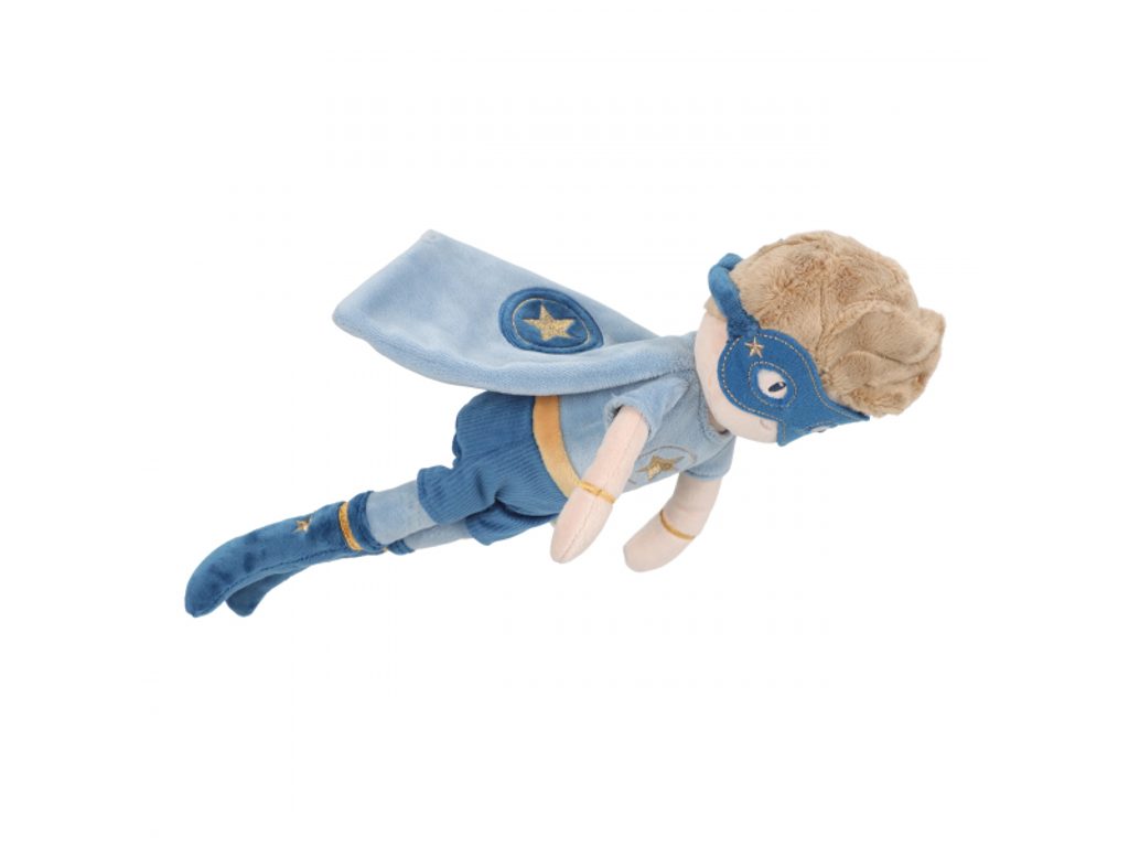 Do akce jde superhrdina Jim! Tento statečný plyšový hrdina v kostýmu s maskou je vždy připravený zachránit svět, bojovat proti zločincům a pomáhat lidem v nouzi. Panenka je ušitá z měkkého jemného materiálu s výplní ze 100% recyklovaného polyesteru s certifikací GRS (Global Recycled Standard) – šetrná volba k přírodě. Ideální na akční hry, rozvoj odvahy a sebevědomí.