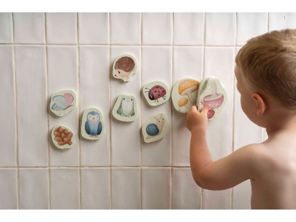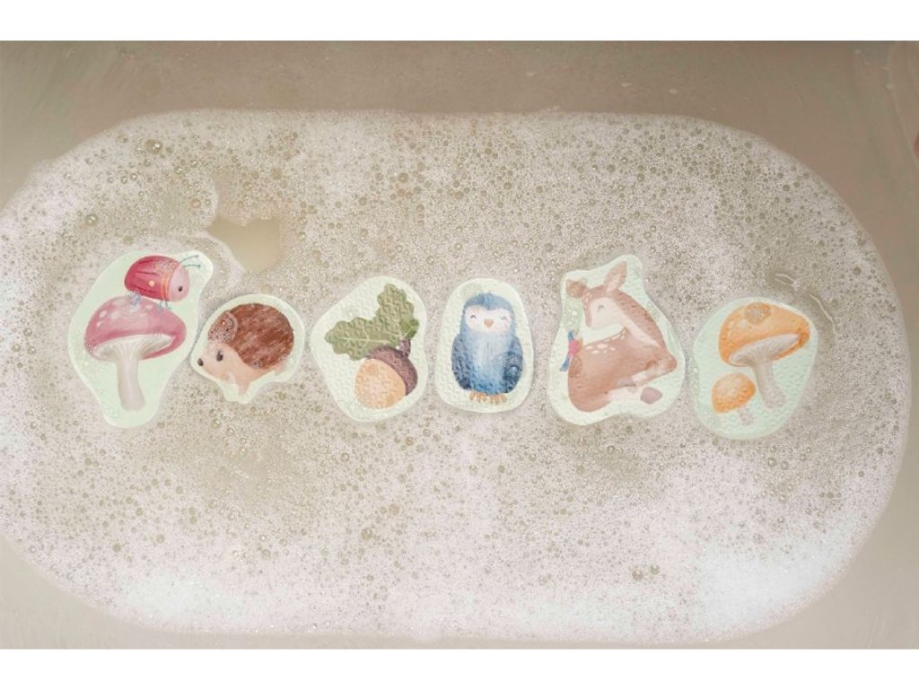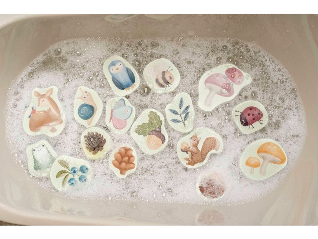 Pěnové samolepky do vany s natištěnými motivy ze života v lese zabaví vaše děti při koupání ve vaně. Samolepky stačí namočit a přitisknout je na vanu. Po koupeli je snadno uložíte do síťovinového sáčku s přísavkami, který je součástí výrobku. Hračka je součástí designové kolekce hraček a doplňků Little Dutch Forest Friends inspirované životem v lese. Balení obsahuje 16 samolepek. Vhodné pro děti od 10 měsíců.