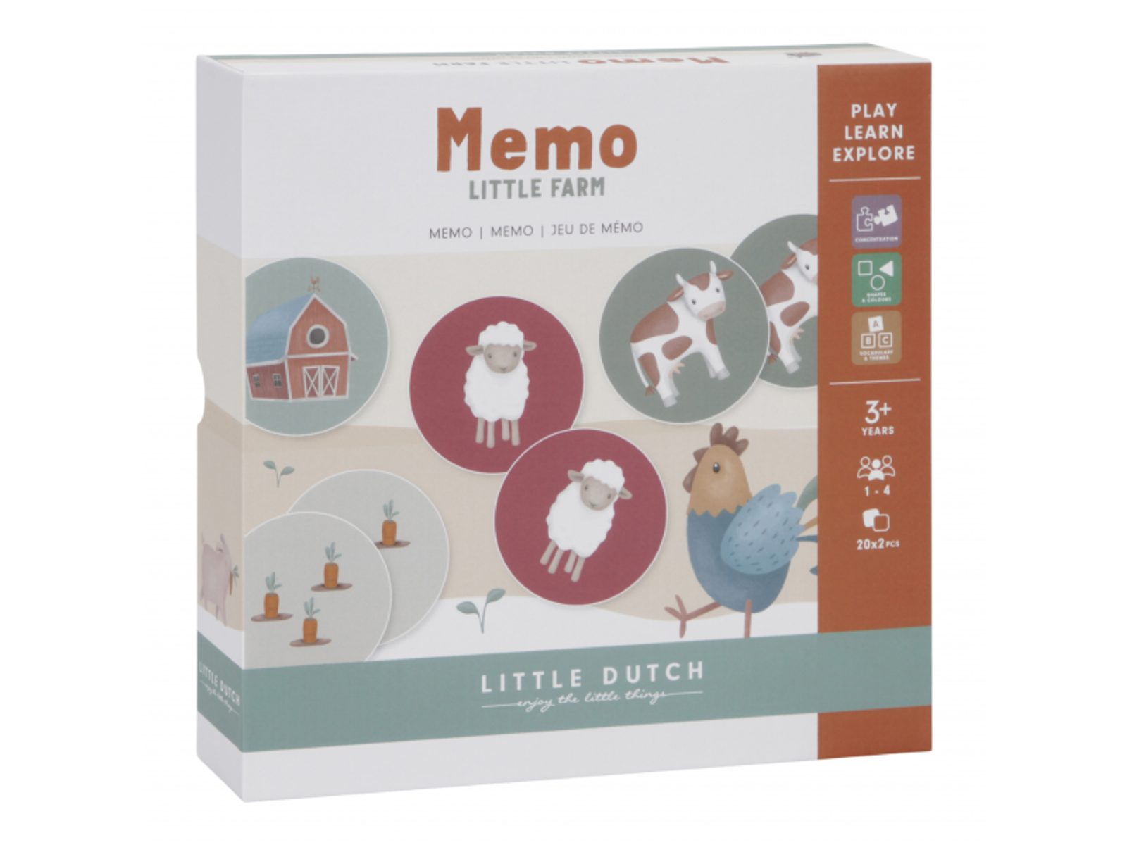Pexeso pro nejmenší z pevného kartonu s obrázky inspirovanými životem na farmě. Zábavná hra pomáhá procvičovat soustředění a paměť vašeho dítěte. Hra je součástí designové kolekce hraček a doplňků Little Dutch Farma. Balení obsahuje 2 x 20 karet. Rozměry boxu: 21,5 x 21,5 x 5,2 cm Vhodné pro děti od 3 let.