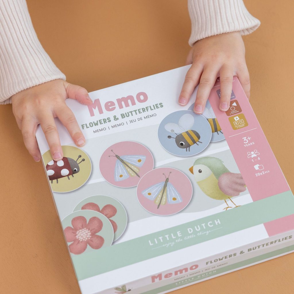 Pexeso pro nejmenší z pevného kartonu s obrázky inspirovanými životem na rozkvetlé louce. Zábavná hra pomáhá procvičovat soustředění a paměť vašeho dítěte. Hra je součástí designové kolekce hraček Little Dutch Květiny a motýli. Balení obsahuje 2 x 20 karet. Vhodné pro děti od 3 let.