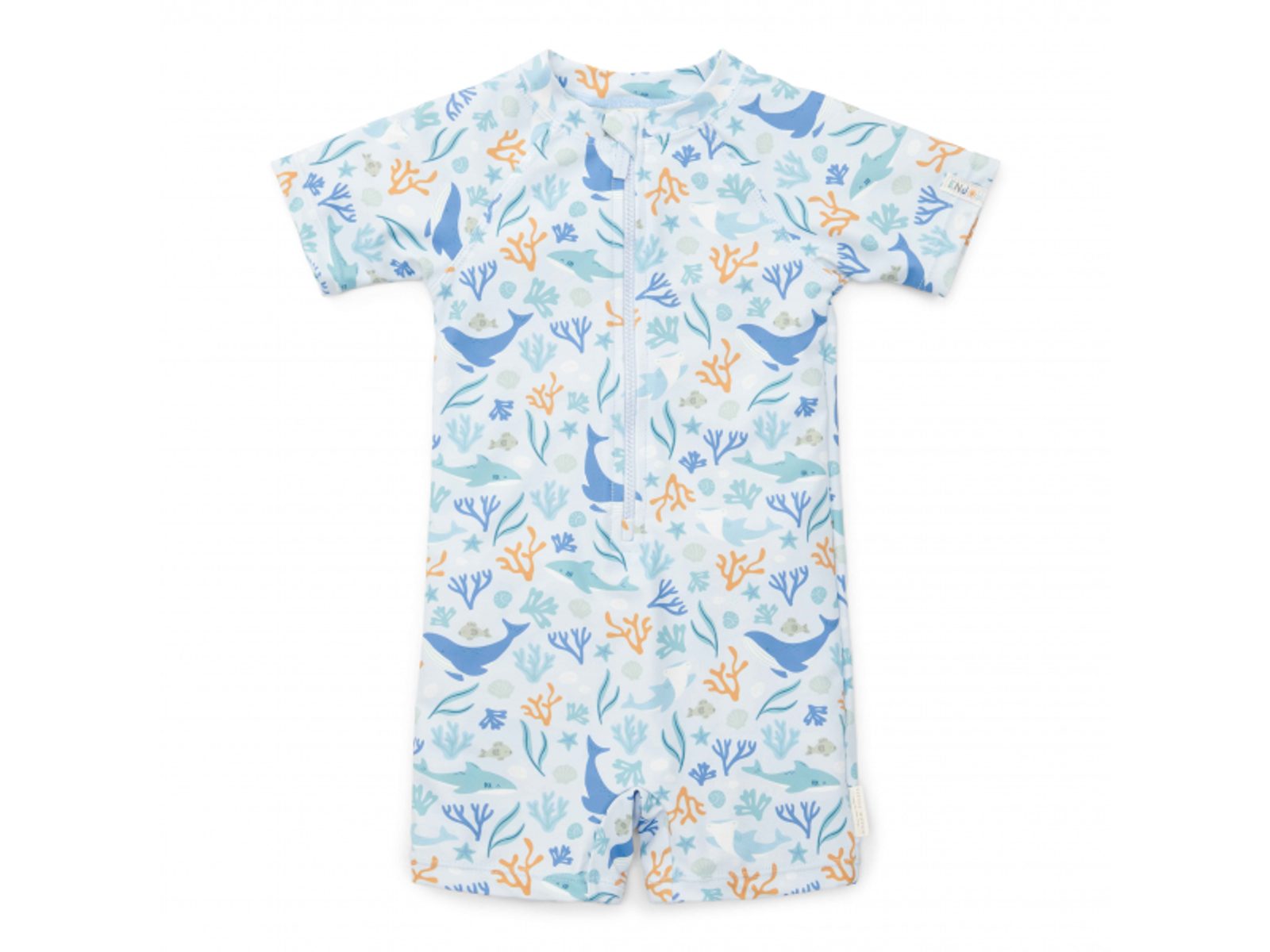 Plavky z UV ochranné tkaniny s krásným potiskem chrání vaše dítě před sluncem při koupání u moře i doma na zahradě. Ať už vaše děti milují skákání ve vlnách, koupání v bazénu nebo si rády staví hrady z písku, v těchto plavkách si mohou bezstarostně užívat celý den. Složení: 85% recyklovaný polyester, 15% elastan Ochranný faktor: UPF 50+ Při pobytu na slunci používejte pro dítě ochranné opalovací krémy. Možno prát v pračce na 30°C. Po každém použití plavky propláchněte v čisté studené vodě.