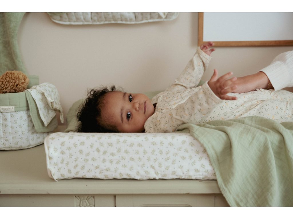 Potah je určen pro potažení přebalovací podložky formátu 70 x 50 cm. Díky elastickému pásku na okrajích potah drží na podložce a neshrnuje se. Měkký bavlněný materiál potahu je pro dítě příjemný a zajistí, že ho přebalovací podložka nebude studit při doteku s pokožkou. Potah je součástí designové kolekce textilu, hraček a doplňků Little Dutch Blueberry Leaves.