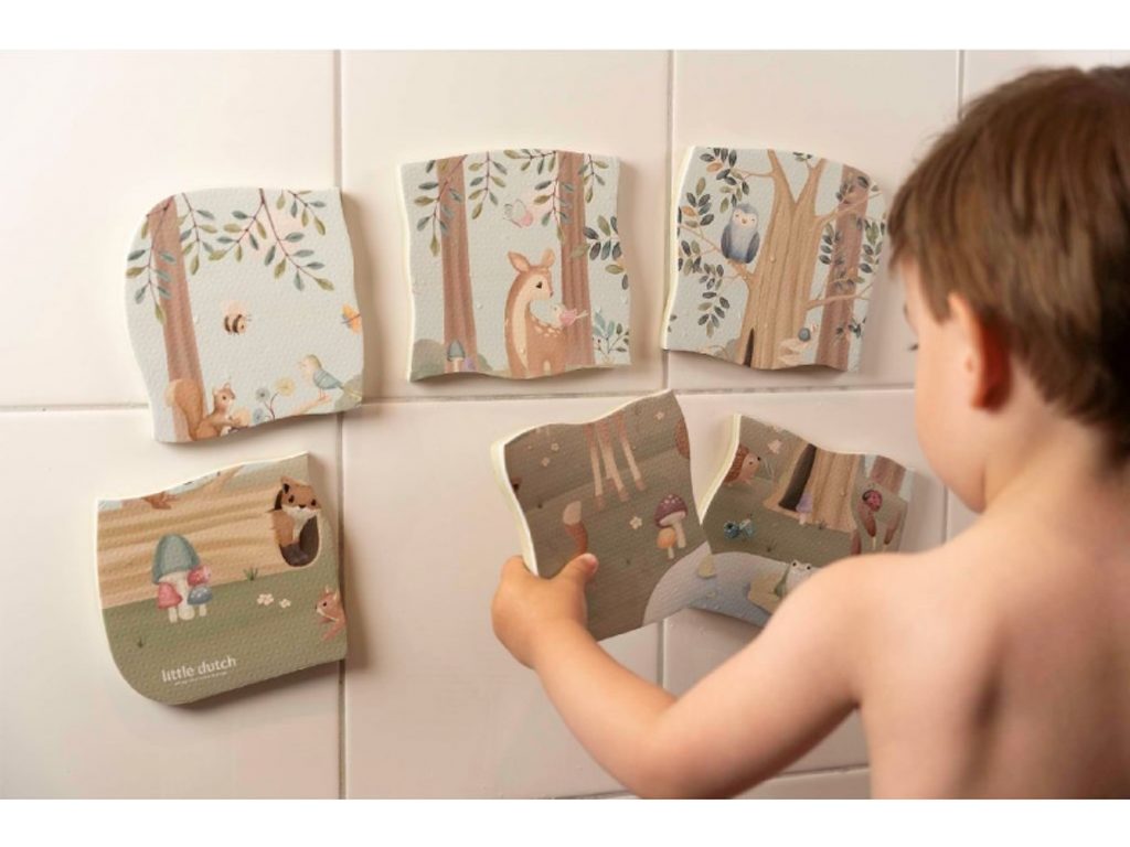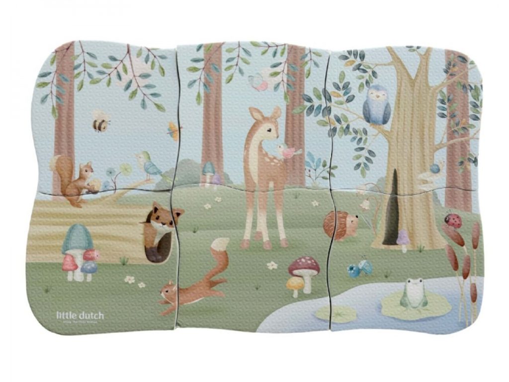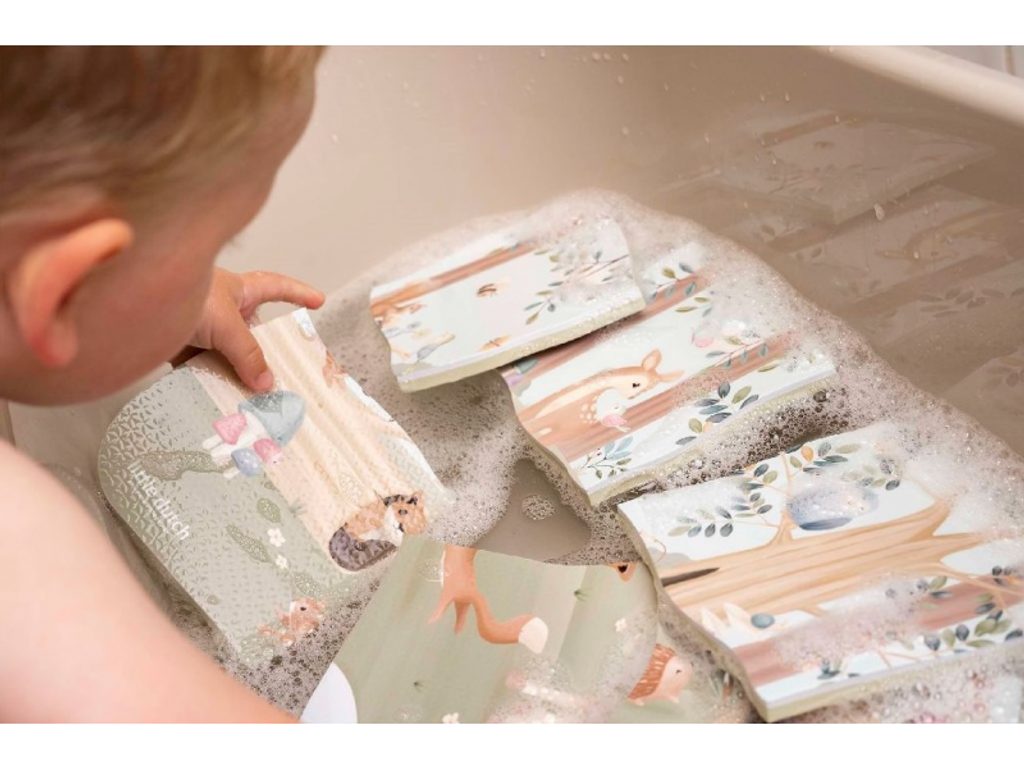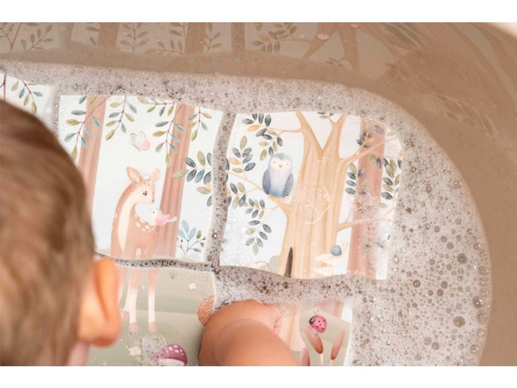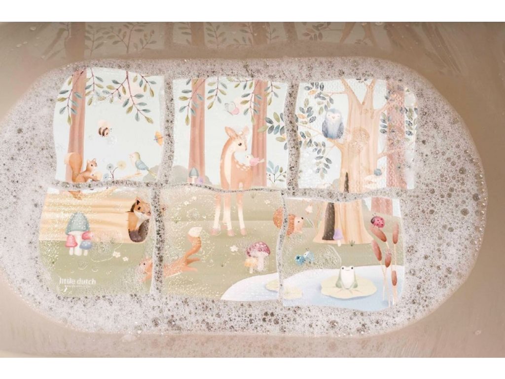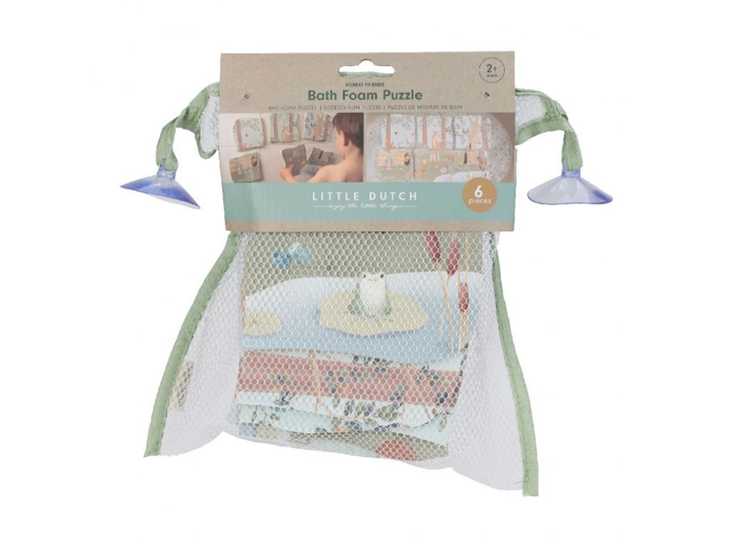 Pěnové 6-dílné puzzle do vany s natištěnými motivy ze života v lese zabaví vaše děti při koupání ve vaně. Puzzle stačí namočit a přitisknout je na vanu nebo na dlaždičky. Po koupeli je snadno uložíte do síťovinového sáčku s přísavkami, který je součástí výrobku. Hračka je součástí designové kolekce hraček a doplňků Little Dutch Forest Friends inspirované životem v lese. Vhodné pro děti od 2 let.