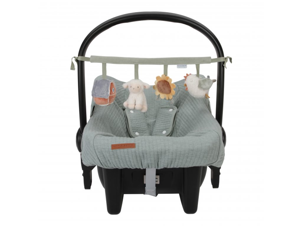 Čtyři zavěšené plyšové hračky v podobě slepičky, ovečky, slunečnice a domečku zabaví vaše miminko na cestách v autosedačce či kočárku. Jednotlivé hračky při zkoumání dětskými ručičkami chrastí, po zmáčknutí pískají a šustí. Hračky stimulují koordinaci ruka / oko dítěte. Hračka je součástí designové kolekce hraček Little Dutch Farma. Rozměry: 35 x 14 x 8 cm Vhodné pro děti od narození.
