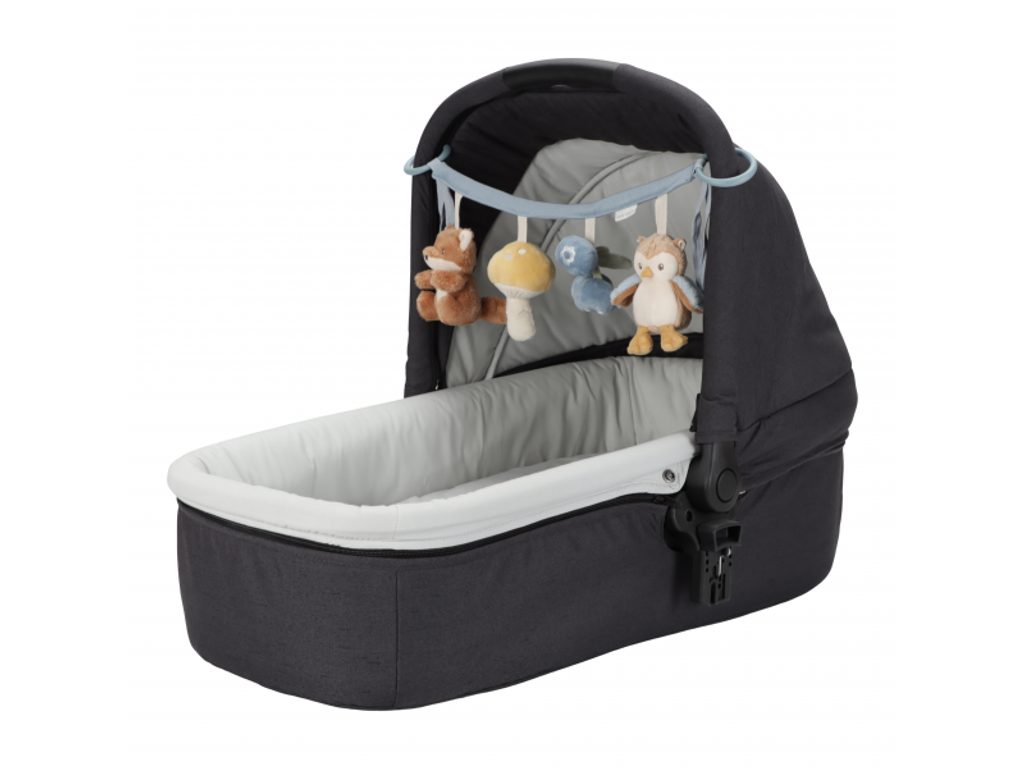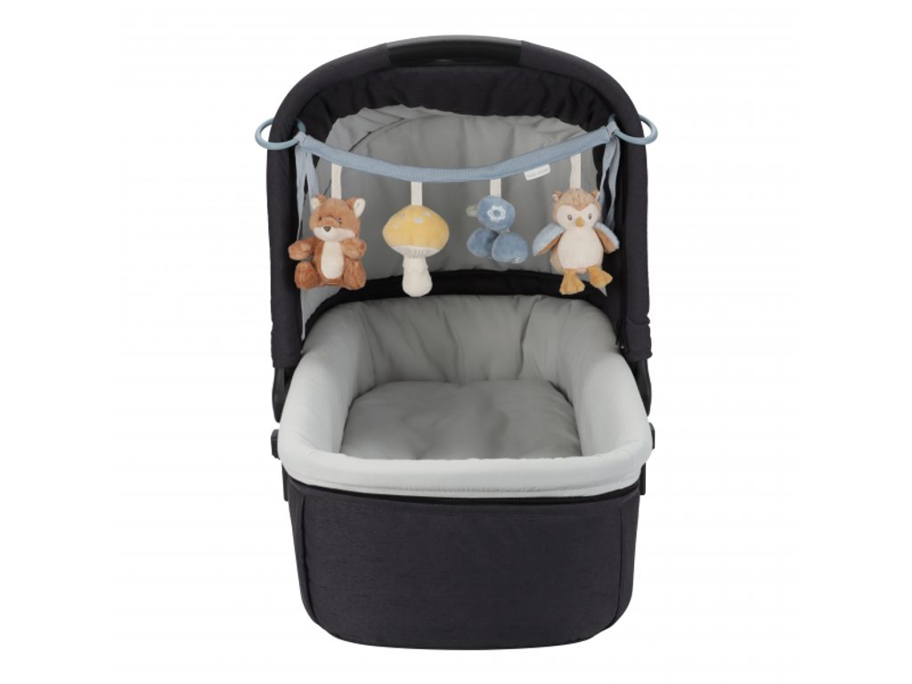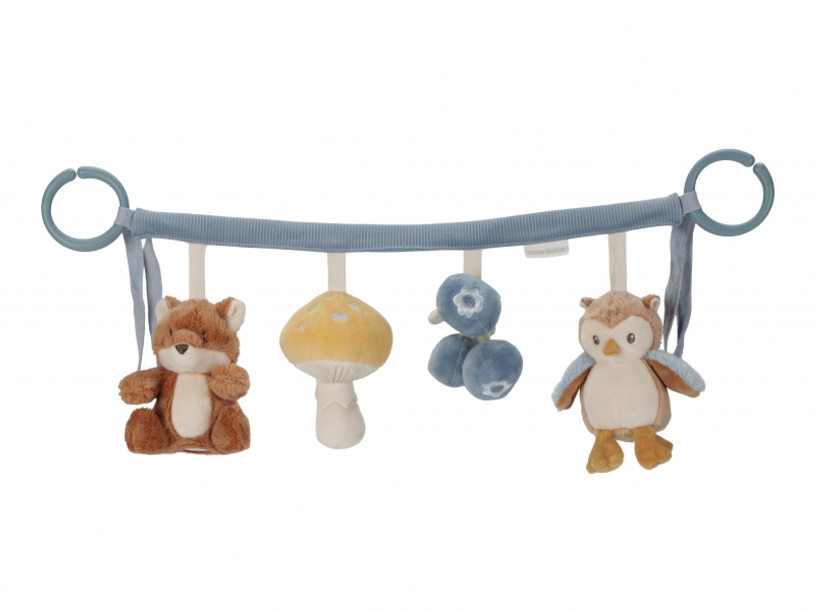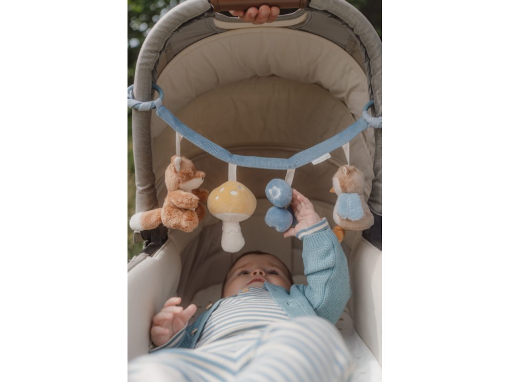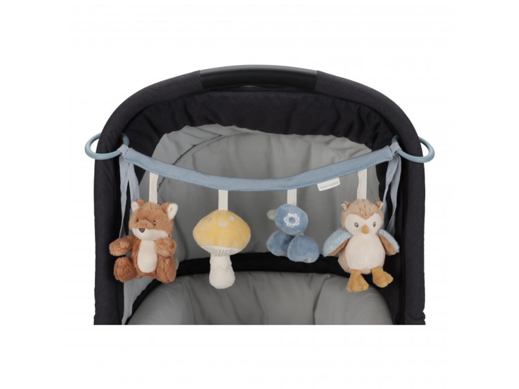 Čtyři zavěšené plyšové hračky v podobě lišky, sovy, houbičky a borůvek zabaví vaše miminko na cestách v autosedačce či kočárku. Jednotlivé hračky při zkoumání dětskými ručičkami chrastí a šustí. Hračky stimulují koordinaci ruka / oko dítěte. Hračka je součástí designové kolekce hraček Little Dutch Forest Friends inspirované životem v lese.