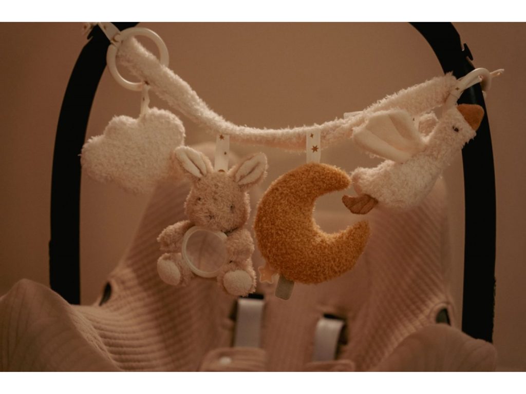 Roztomilý textilní řetěz se zavěšeným plyšovými hračkami se postará o radost a pozornost vašeho miminka během každé jízdy v kočárku i autosedačce. Hračka je navržena tak, aby byla příjemná na dotek, bezpečná a vizuálně klidná. Hravý společník na cesty: Měkké plyšové hračky zaujmou dítě pohybem i zvukem Jemné chrastění podporuje sluchové vnímání a uklidňuje Snadné připevnění na kočárek pomocí pružných kroužků Tlumené, přírodní barvy stimulují, ale nepřetěžují dětský zrak Hračka je součástí designové kolekce hraček Little Dutch Newborn Naturals. Délka: cca 36 cm Složení: 100% polyester Možno prát v pračce na jemný program při 30°C. Vhodné pro děti od narození.