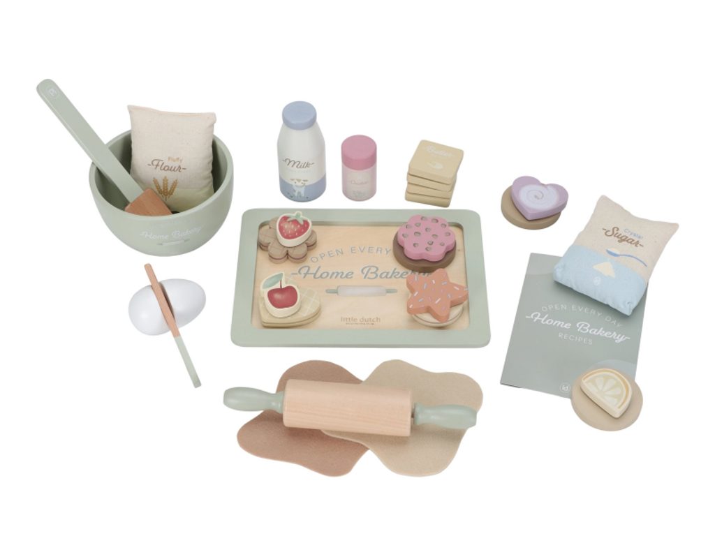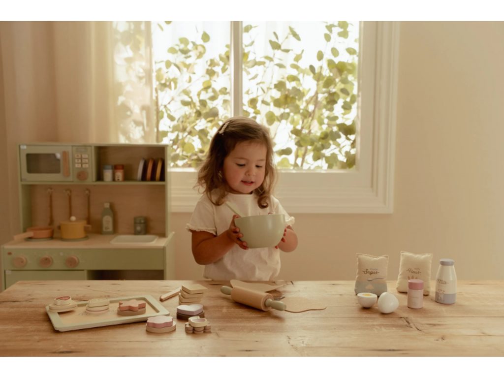 Je čas upéct něco dobrého! S touto krásnou dřevěnou sadou na pečení Little Dutch si malí pekaři osvojí základy pečení a připraví ty nejlahodnější sušenky nebo dortíky – samozřejmě bez nepořádku. Sada obsahuje vše potřebné pro pečení: kartičku s receptem, dřevěné suroviny jako vejce, máslo, mouku, cukr, mléko, barevné posypky a k tomu misu na míchání, váleček, tác a doplňky na zdobení. Nechybí ani hotové kousky cukroví a plát těsta z plsti, který si mohou děti rozválet a nazdobit podle vlastní fantazie. Sada přináší hodiny nápadité a tvůrčí zábavy, podporuje představivost, kreativitu a jemnou motoriku. Ideální jako samostatná hračka nebo jako doplněk k samostatně prodávané dětské kuchyňce. Hračka je součástí kolekce vysoce kvalitních dřevěných hraček Little Dutch, navržených s důrazem na bezpečnost a originální design. Vyrobeno z odolného FSC certifikovaného dřeva. Rozměry: 23,1 × 16,8 × 9 cm Vhodné pro děti od 3 let.