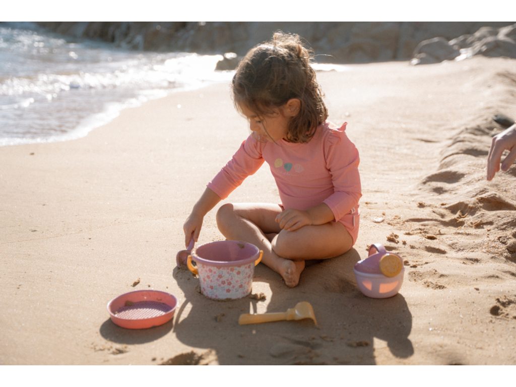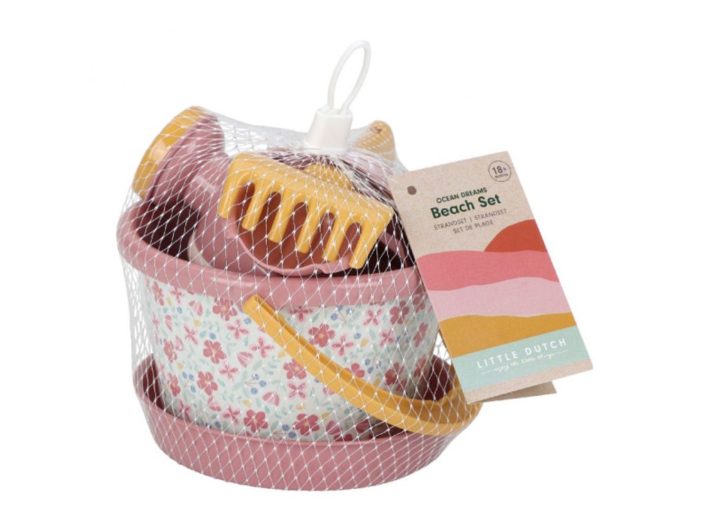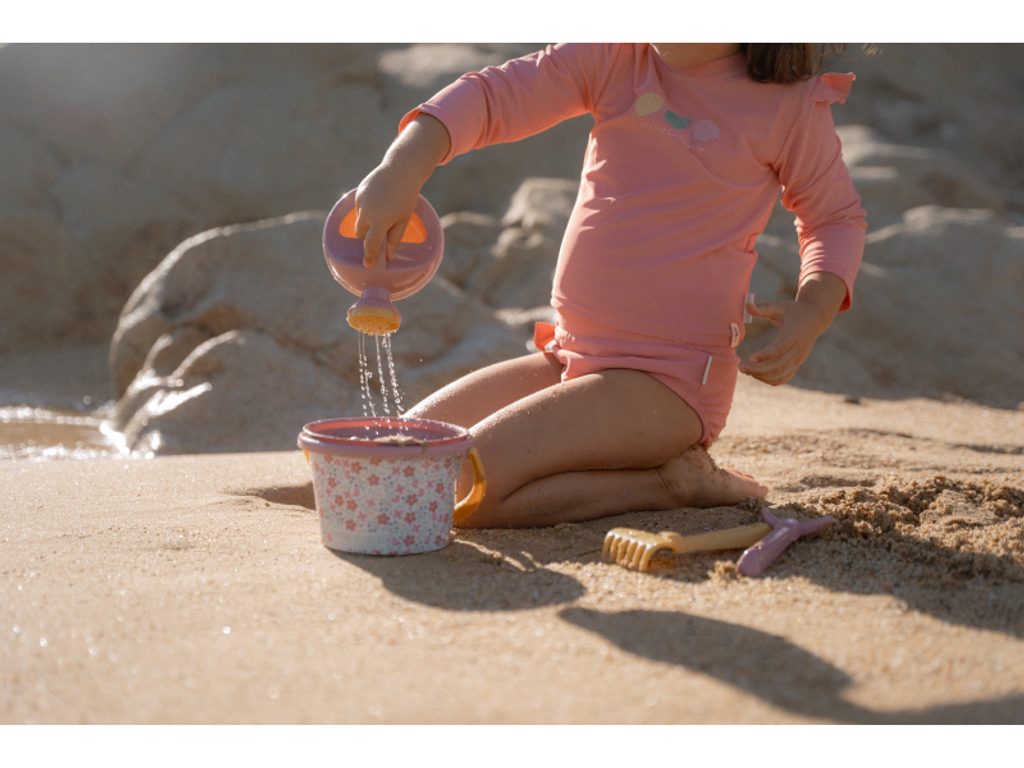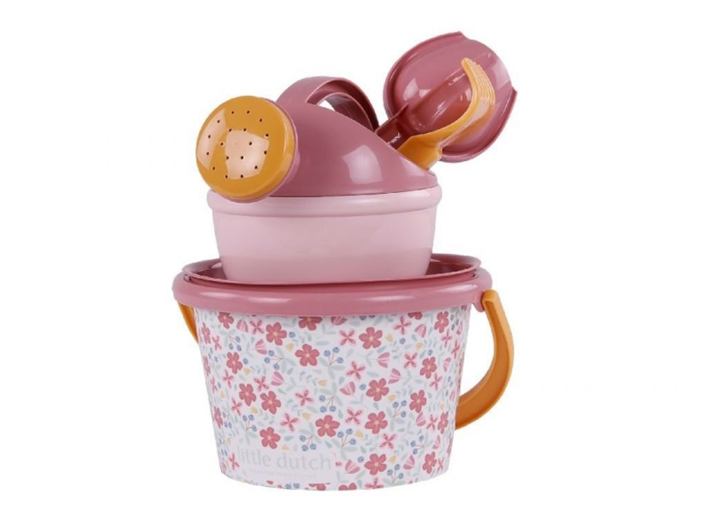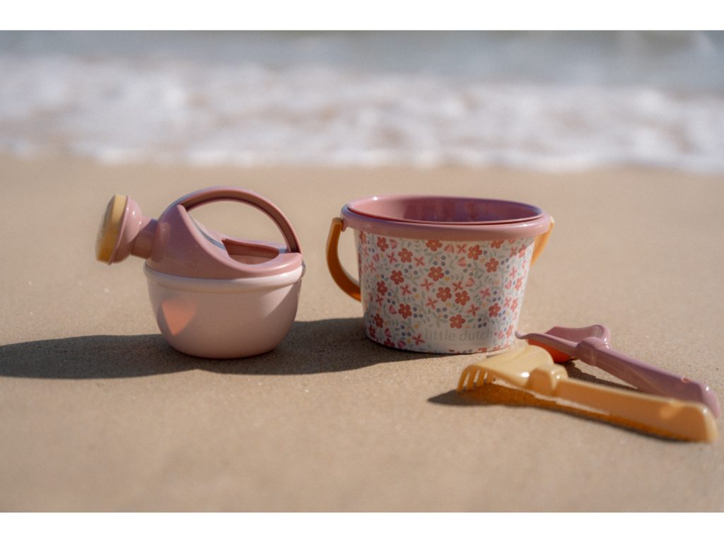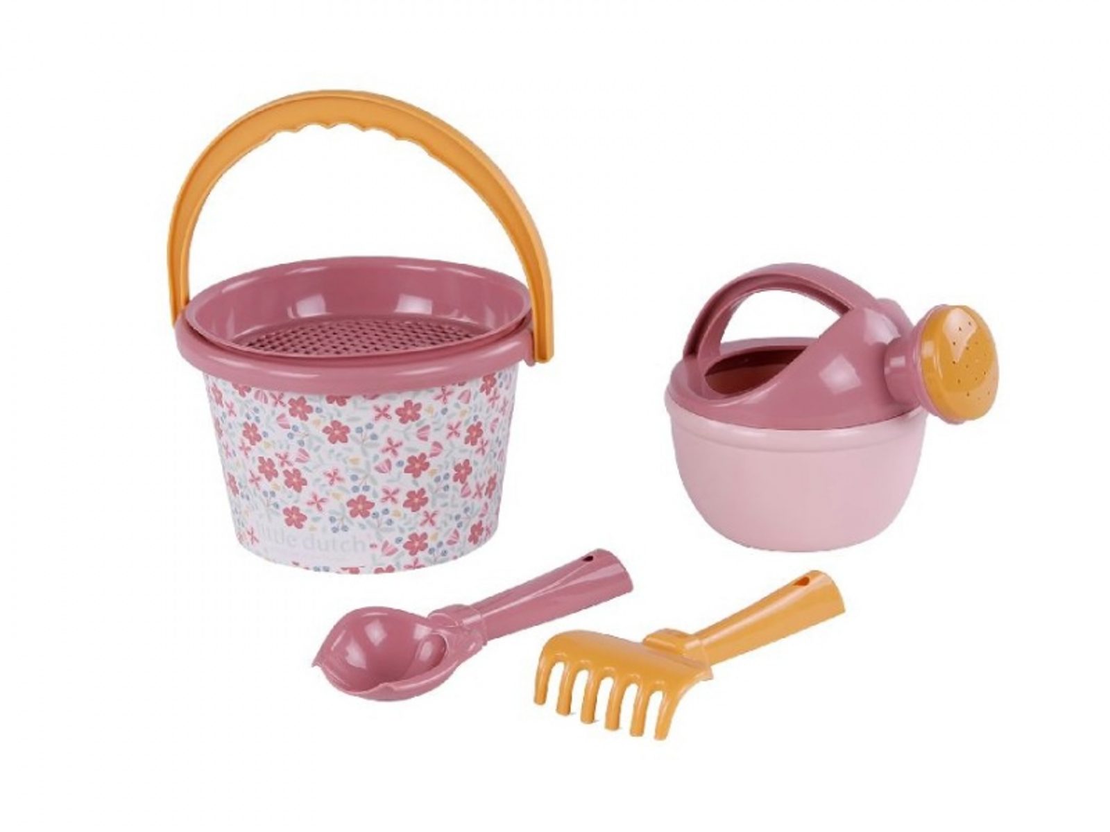 Tato sada na písek s nádherným květinovým potiskem je ideální pro děti, které si chtějí hrát na zahradě nebo na pláži. Sada obsahuje kyblík, konvičku, hrabičky, lopatku a sítko, všechny vyrobené z kvalitního, pevného plastu, který zaručuje dlouhou životnost.