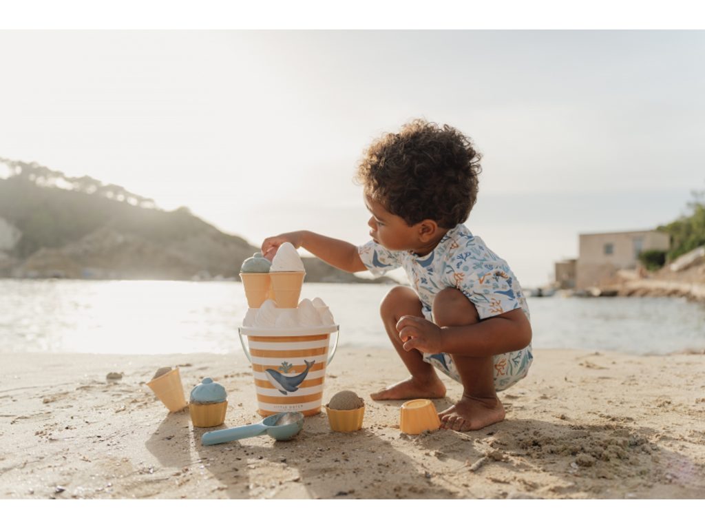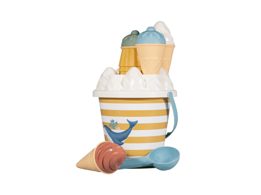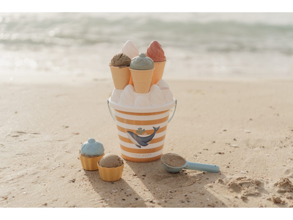 Zmrzlina patří k létu a s touto roztomilou sadou si ji vaše děti vyrobí i z písku. Sadu tvoří kyblík s rukojetí, čtyři kornouty, naběračka na zmrzlinu, sedm formiček a sítko. Sada je součástí designové kolekce Little Dutch Ocean Dreams. Kyblík má průměr 17 cm. Vhodné pro děti od 18 měsíců.