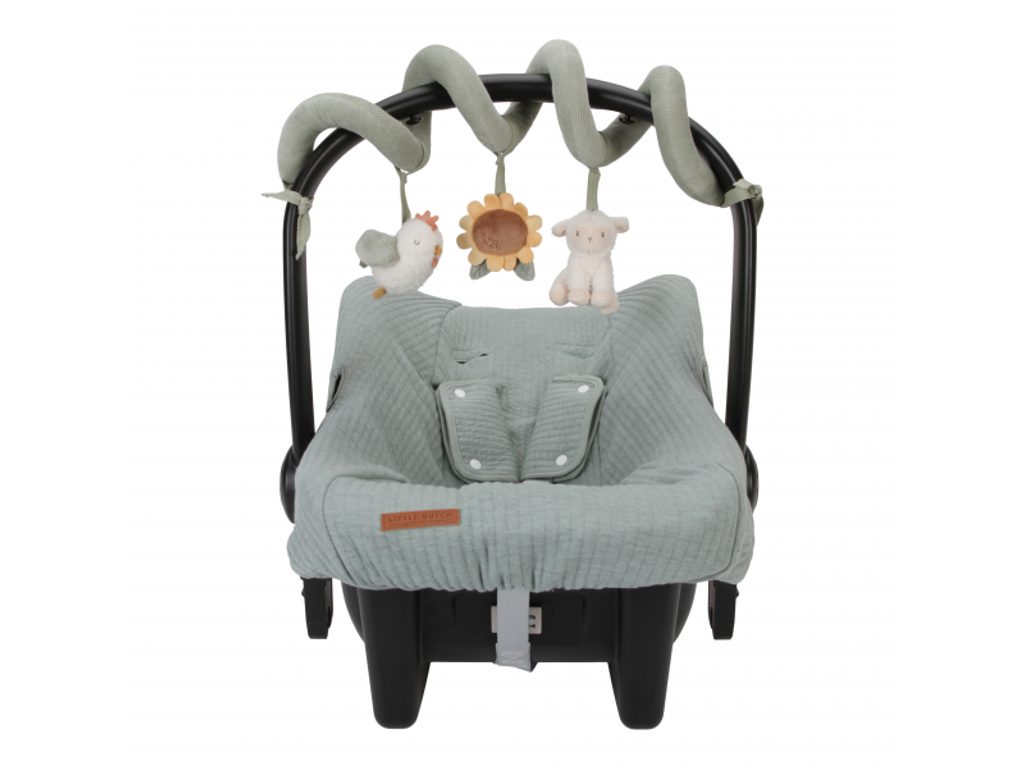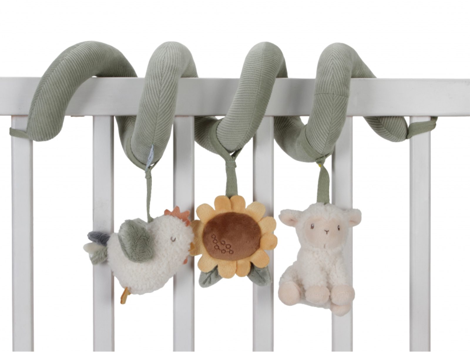 Textilní spirála se zavěšenými hračkami v podobě slepičky, ovečky a slunečnice zabaví vaše miminko v postýlce, kočárku i v autosedačce. Měkké hračky vyrobené z jemného plyše chrastí, šustí a nabízí různé textury pro zkoumání. Hračky stimulují koordinaci ruka / oko dítěte. Spirálu snadno připevníte omotáním kolem bočnice postýlky či madla autosedačky i kočárku. Spirála s hračkami je součástí designové kolekce hraček Little Dutch Farma. Rozměry: 22 x 13 x 12 cm Vhodné pro děti od narození.
