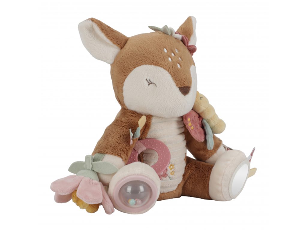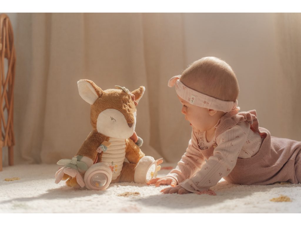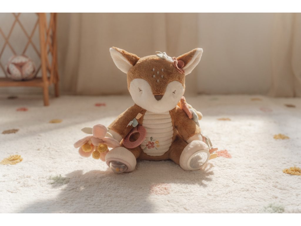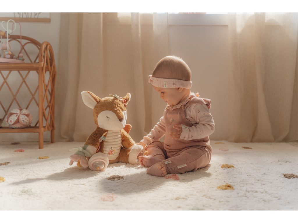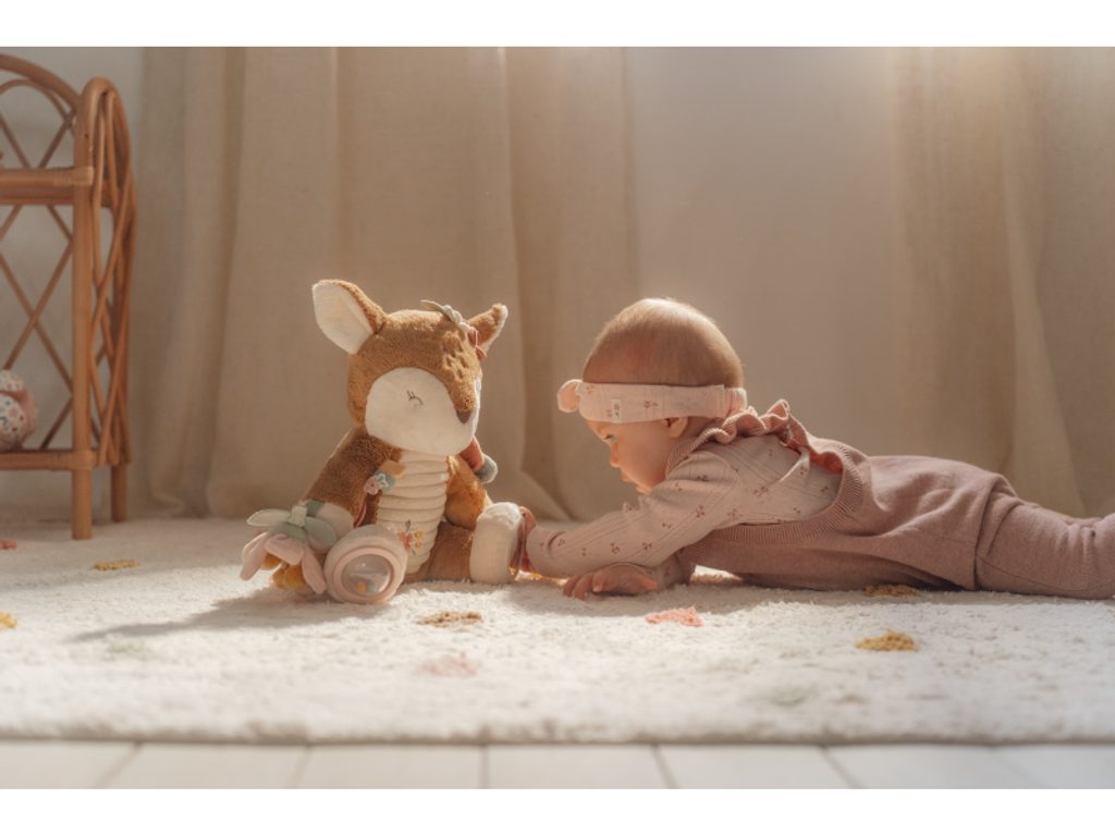 Plyšová hračka v podobě něžné srnky láká ke hraní a zkoumání. Srnka je je vyrobena z velmi jemného a příjemného materiálu, při pohybu chrastí a nabízí různorodé aktivity ke zkoumání. Hračka dítě zabaví a může sloužit i jako kamarád do postýlky pro klidné usínání. Hračka je součástí designové kolekce hraček a doplňků Little Dutch Fairy Garden inspirované životem na zahradě.