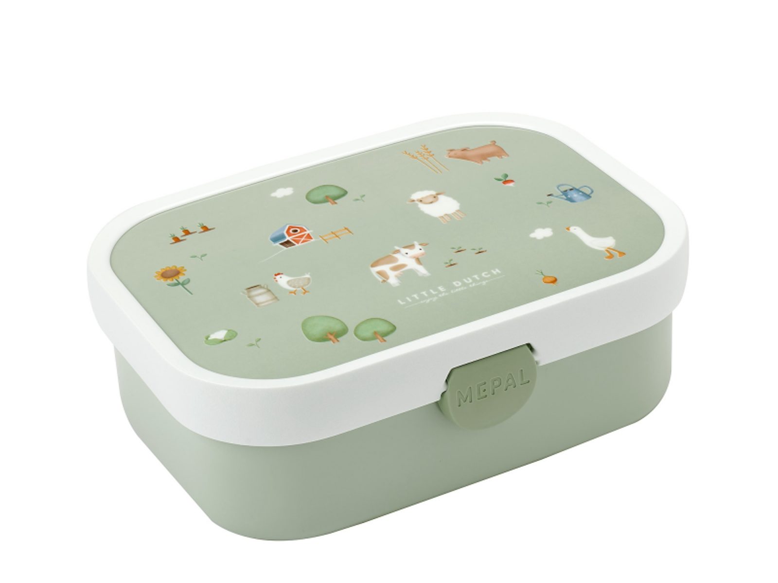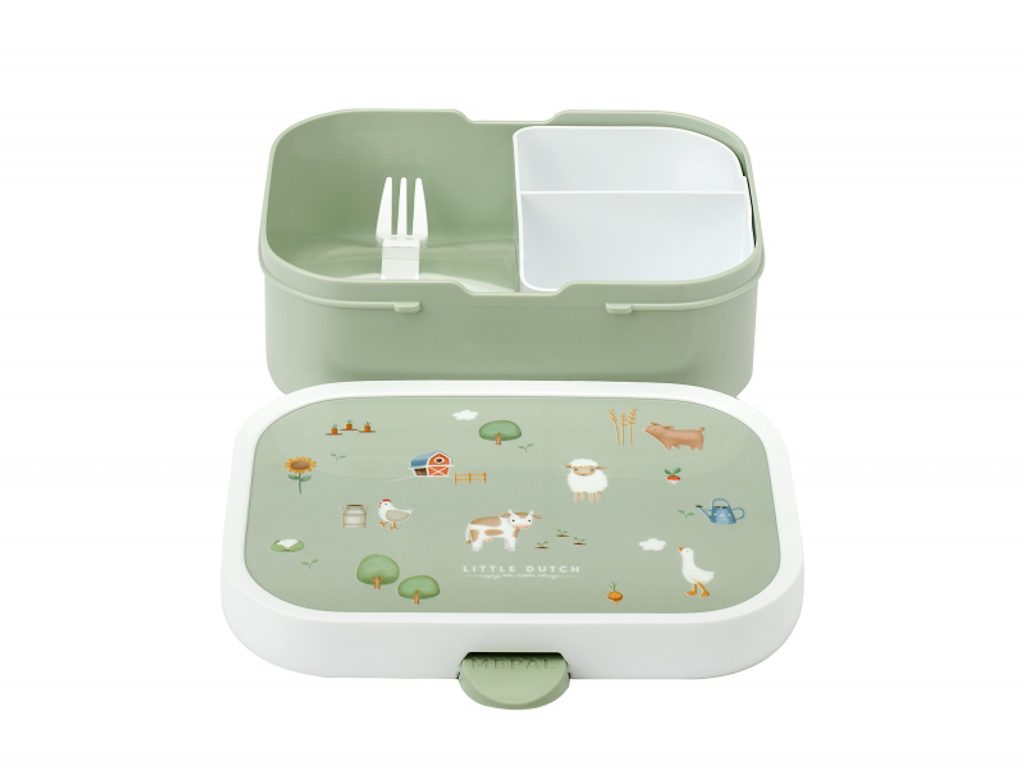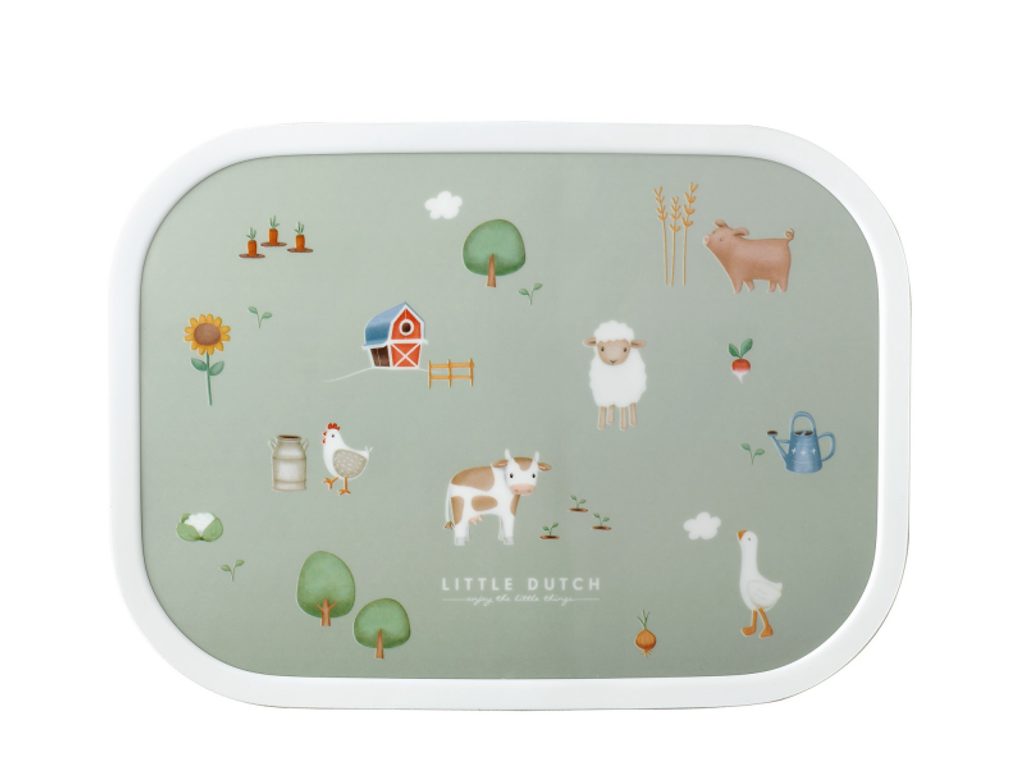 Praktický svačinový box nabízí možnost rozdělení na tři přihrádky pro oddělení jednotlivých částí uložené svačinky. Součástí boxu je i malá vidlička, která je ideální pro napichování kousků ovoce či zeleniny. Zacvakávací uzávěr je zárukou bezpečného uzavření obsahu boxu. Box je součástí designové řady hraček a doplňků Little Dutch Farma. Materiál: ABS Rozměry: 17,8 x 13,2 x 6 cm