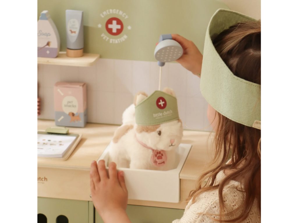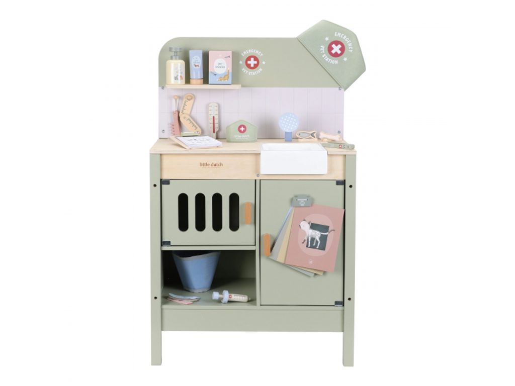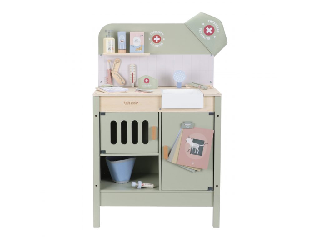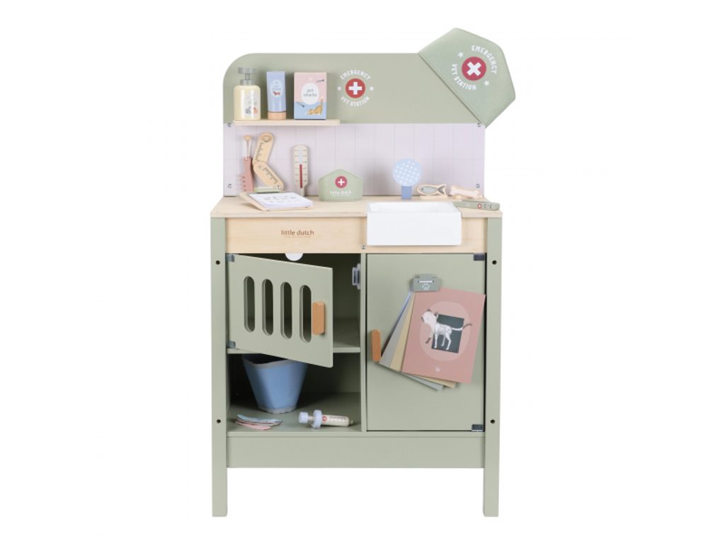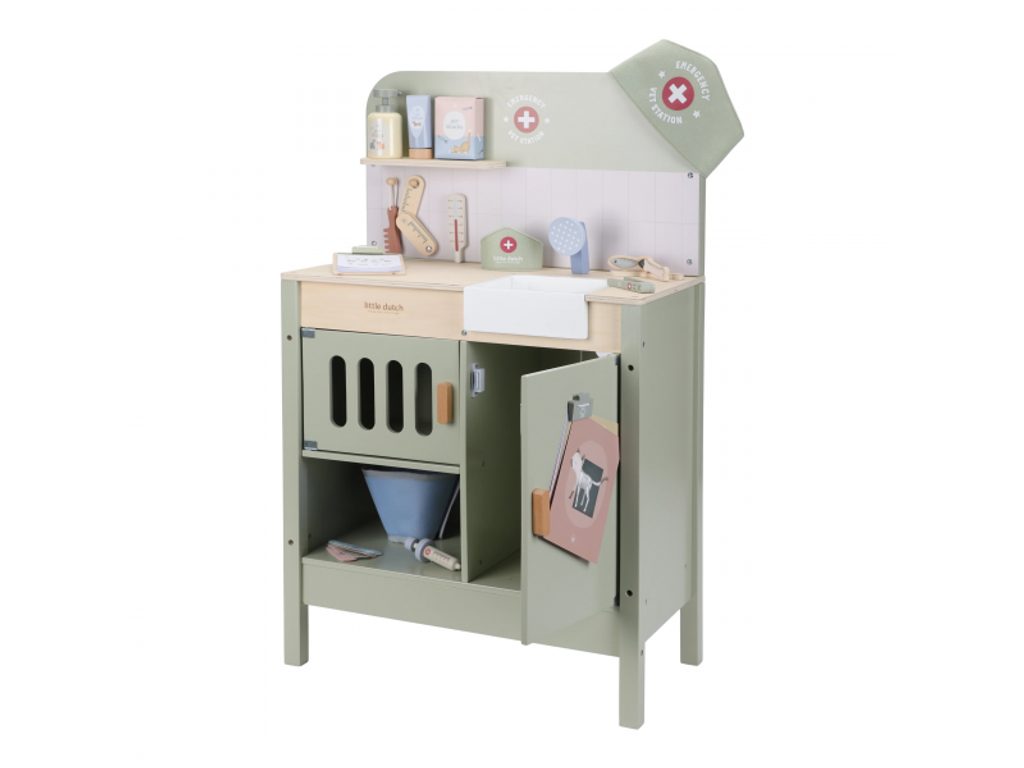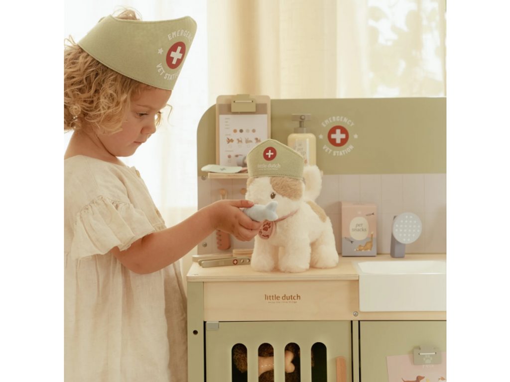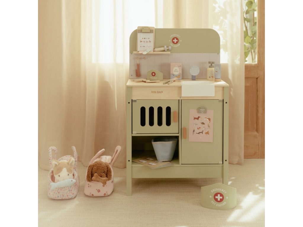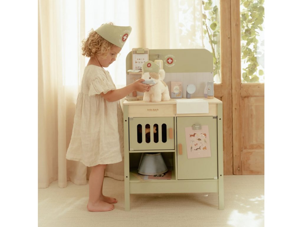 Dřevěná veterinární ordinace Little Dutch je skvělým dárkem pro děti, které milují zvířátka a péči o ně. Díky realistickým doplňkům se malí ošetřovatelé snadno ponoří do světa péče o nemocné mazlíčky. Připravte se na spoustu příběhů ze života plyšových zvířátek a nekonečné hodiny zábavného hraní! Součástí ordinace je vše potřebné pro vyšetření i ošetření – umyvadlo s výsuvnou sprchovou hlavicí, hřeben, teploměr, injekce, náplasti, látková čelenka i speciální klips na zavěšení lékařských ilustrací a rentgenů. Podporuje kreativitu, představivost a rozvoj sociálních dovedností Bohaté příslušenství pro realistickou hru na veterináře Ideální pro malé milovníky zvířat a hry na povolání Robustní dřevěné provedení pro dlouhou životnost Rozměry: 50,5 × 28,5 × 83,2 cm Hmotnost: 7,34 kg Hračka je součástí kolekce vysoce kvalitních dřevěných hraček Little Dutch, navržených s důrazem na bezpečnost a originální design. Vyrobeno z odolného FSC certifikovaného dřeva. Vhodné pro děti od 3 let.
