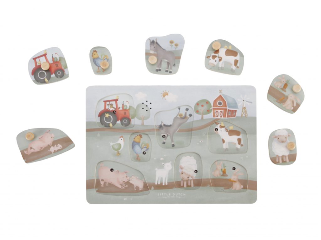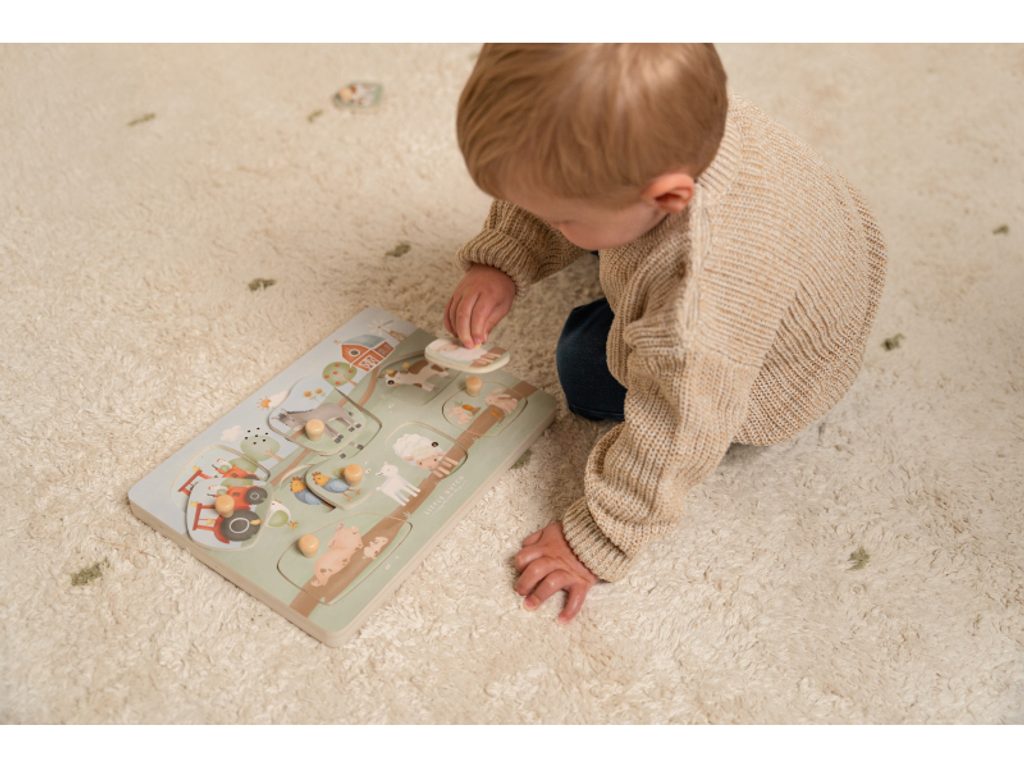 Seznamte vaše dítě se zvířátky z farmy a poznávejte společně, jakými zvuky se dorozumívají. Když dítě vloží správný tvar do otvoru na herní desce, ozve se hlas zvířátka, které je na vkládacím dílu namalované. Puzzle hra v dřevěném provedení s krásnými obrázky nabízí 7 různých vkládacích dílů ve tvaru traktoru a zvířátek s jejich hlasy. Hračka je součástí designové kolekce hraček a doplňků Little Dutch Farma. Vyrobeno z dřeva certifikovaného FSC. Baterie 2xAAA nejsou součástí balení. Rozměry: 21 x 30 x 2,4 cm Vhodné pro děti od 12 měsíců.