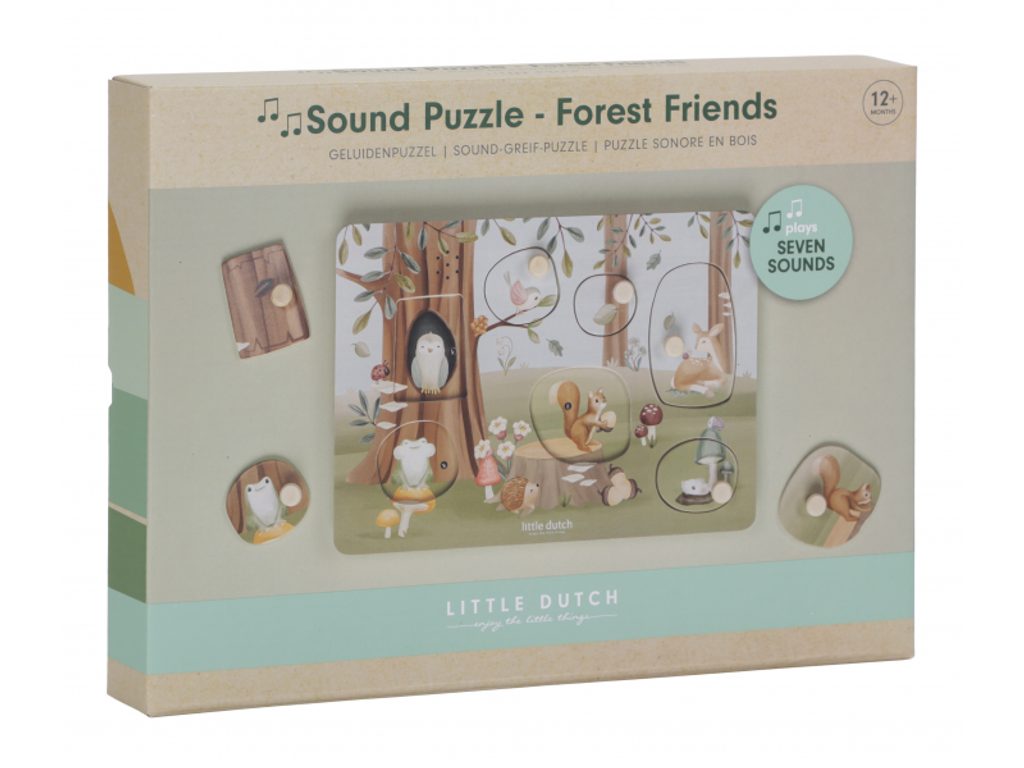 Objevujte spolu se svým dítětem tajemství lesa a zvuky, které vydávají jeho obyvatelé! Když dítě vloží správný tvar do otvoru na herní desce, zazní například hlas ptáčka nebo žáby. Tato dřevěná puzzle hra, zdobená krásnými obrázky, nabízí 7 různých vkládacích dílů, které podporují učení a zábavu.