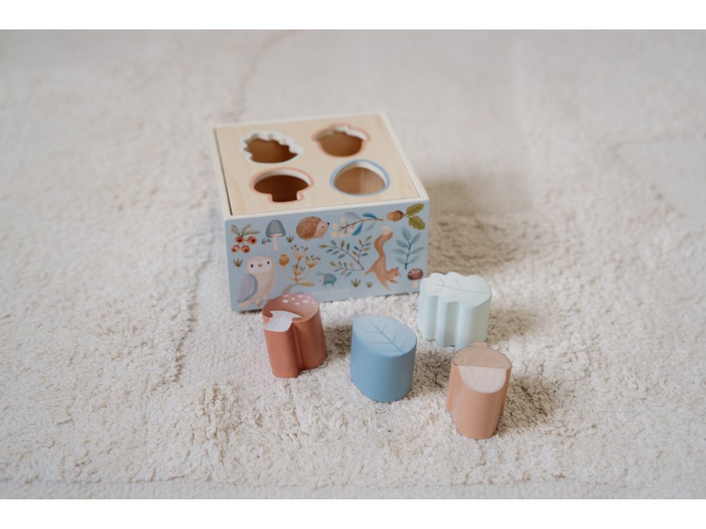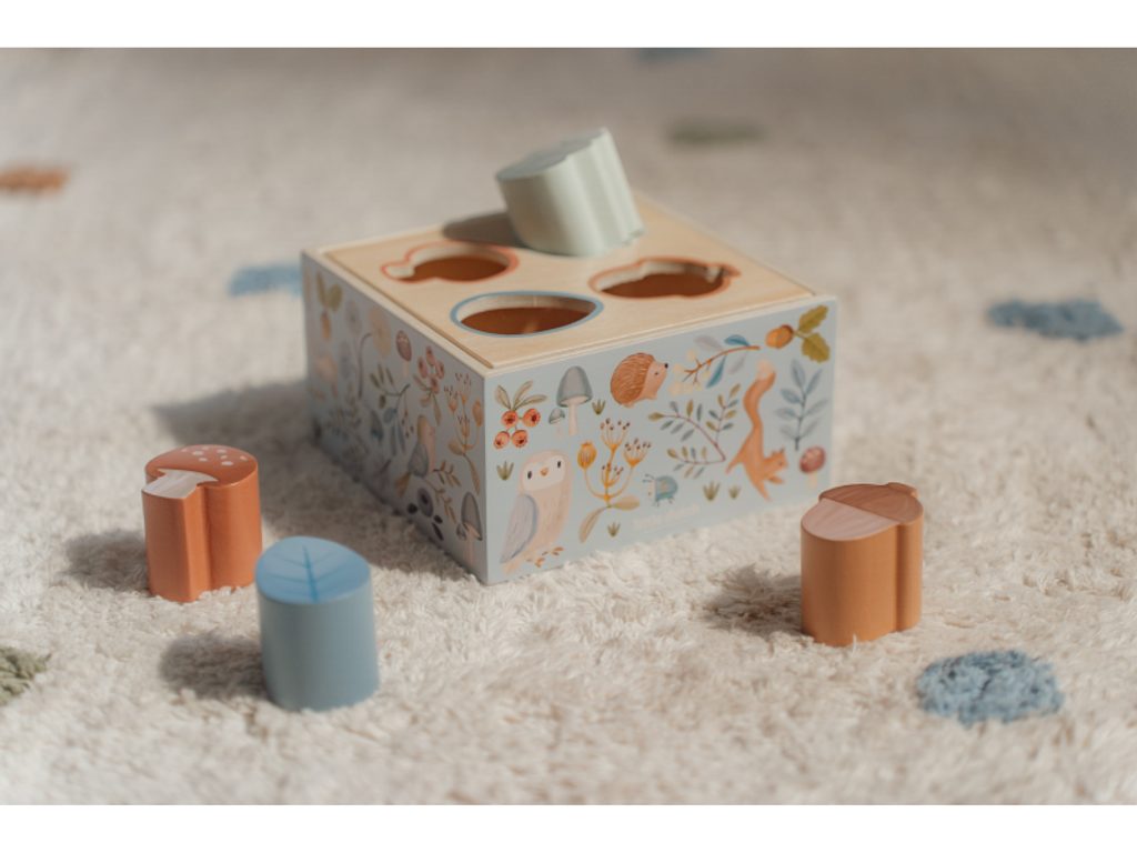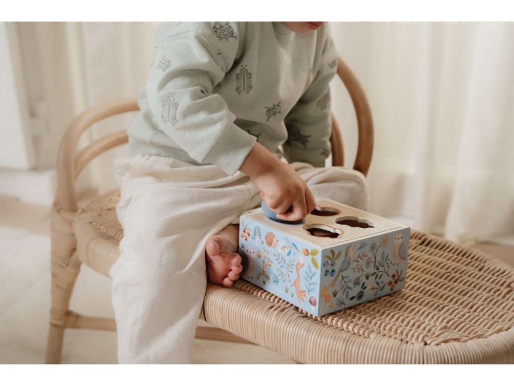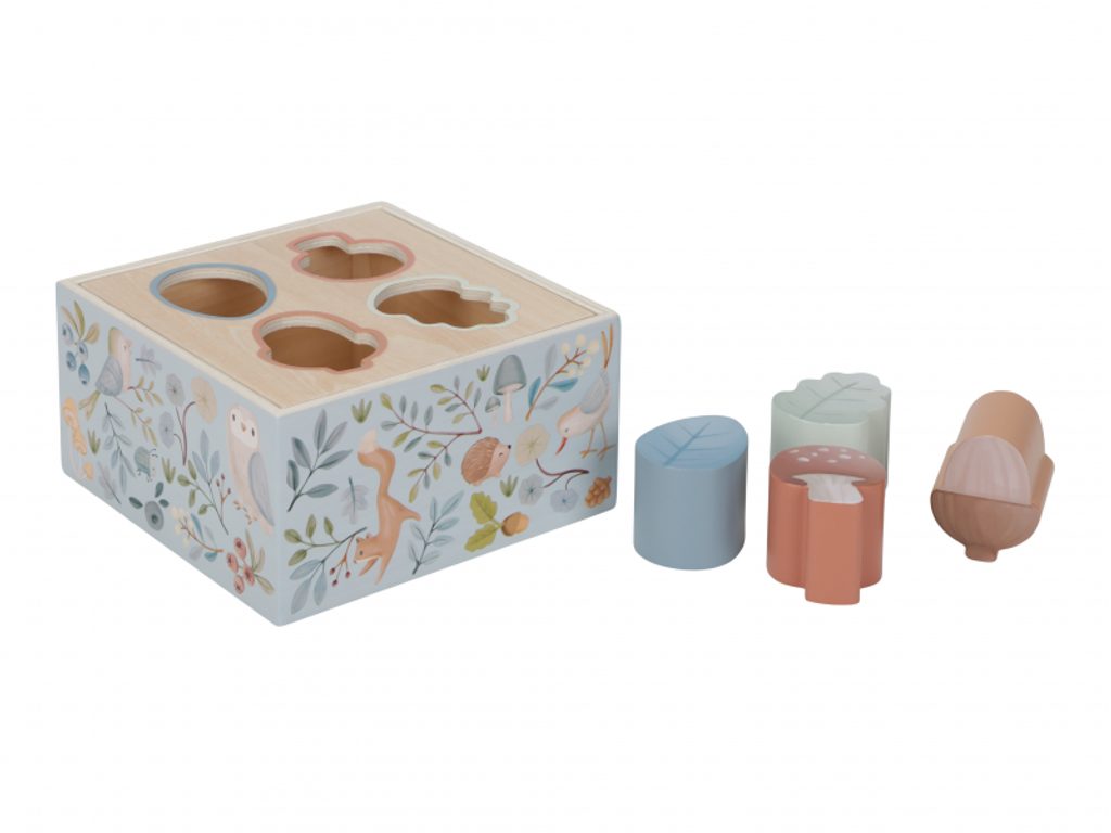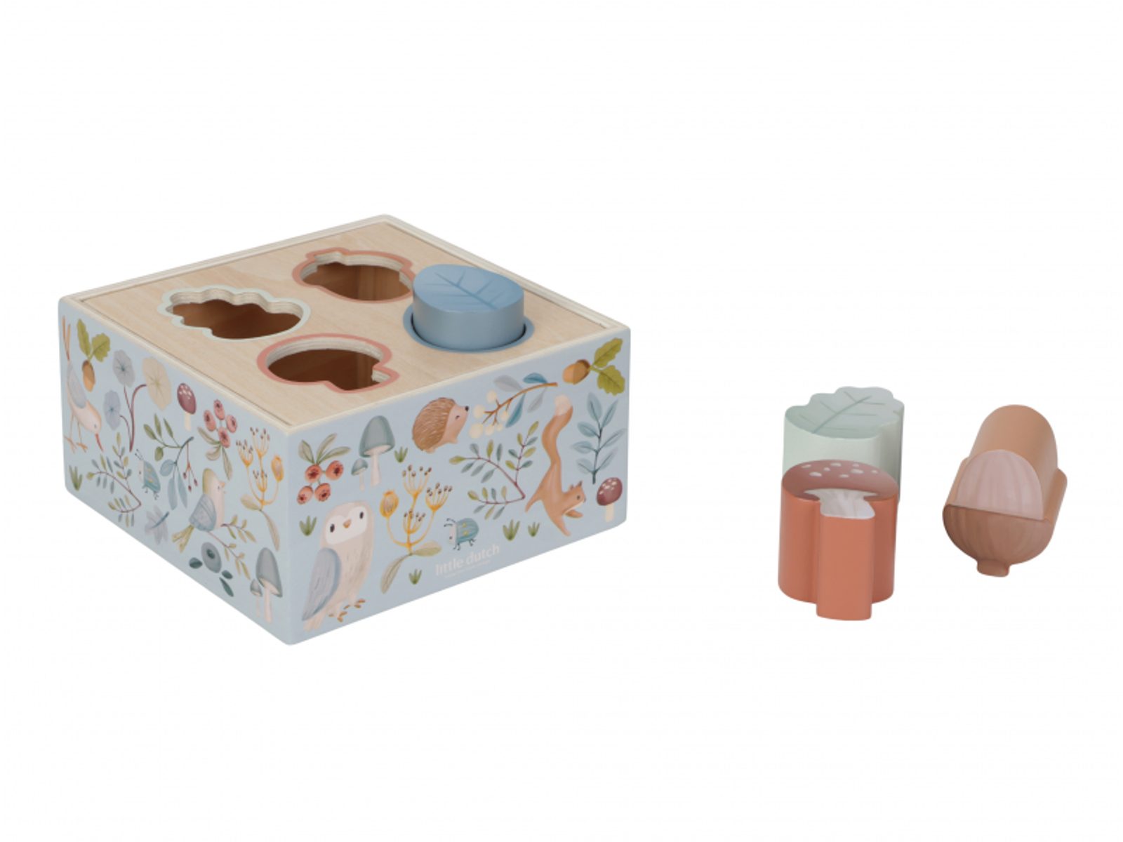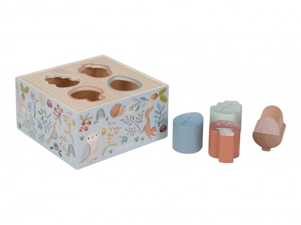 Vkládačka dřevěných tvarů učí děti kreativním zpsůobem rozpoznávat tvary a barvy a zdokonalit svou koordinaci rukou a očí. Malé ručičky snadno uchopí kostky různých tvarů a pak je zatlačí do správného otvoru. Krabička s krásnými ilustracemi motivů ze života v lese je vyrobena z pevného dřeva. Klasická vzdělávací a zároveň zábavná hračka. Vkládačka je součástí designové kolekce hraček a doplňků Little Dutch Forest Friends inspirované životem v lese.