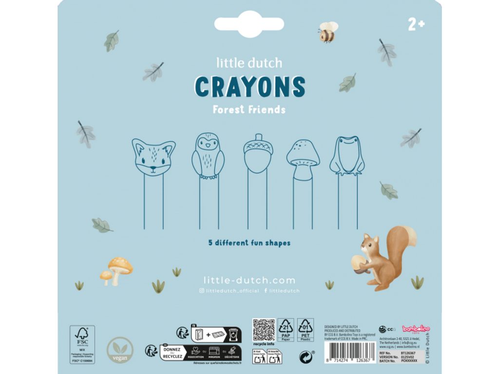 Kvalitní voskovky v 5 barvách přinesou vašim dětem hodiny kreativní zábavy. Každá voskovka je zakončena roztomilou postavičkou, která láká ke hře a dělá z kreslení ještě větší zábavu. Ideální pro první výtvarné pokusy: Snadno uchopitelné i pro malé děti – perfektní pro první čárky, tvary i obrázky Voskovky jsou měkké, hladce kloužou po papíře Postavičky podporují rozpoznávání tvarů a barev Vyrobeno z netoxických materiálů, bezpečné pro děti Vhodné pro každodenní tvoření doma, ve školce nebo na cestách Podporují rozvoj dovedností: Zlepšují úchop a koordinaci oka a ruky Pomáhají rozvíjet jemnou motoriku Umožňují dětem vyjadřovat se kreativně a učí je pracovat s barvami Rozvíjejí fantazii a trpělivost prostřednictvím hry Voskovky jsou součástí designové kolekce hraček a doplňků Little Dutch Forest Friends inspirované životem v lese. Vhodné pro děti od 2 let.